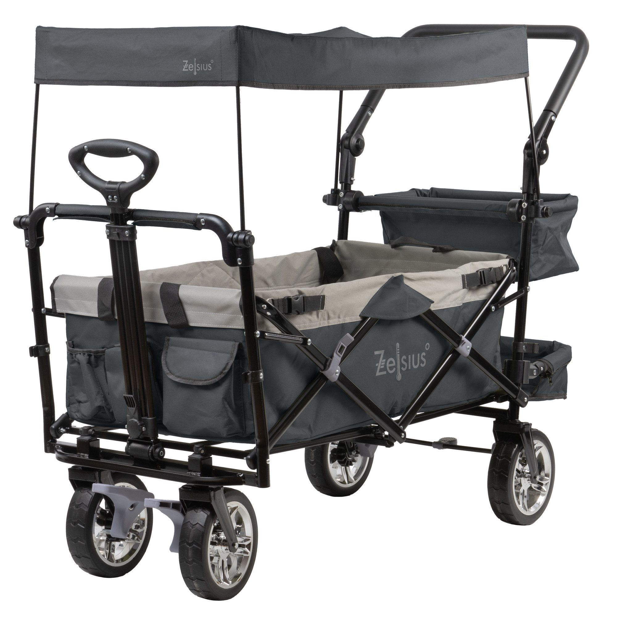 Zelsius Bollerwagen faltbar mit Dach, Grau, Transportwagen mit Gurtsystem, Strandbollerwagen