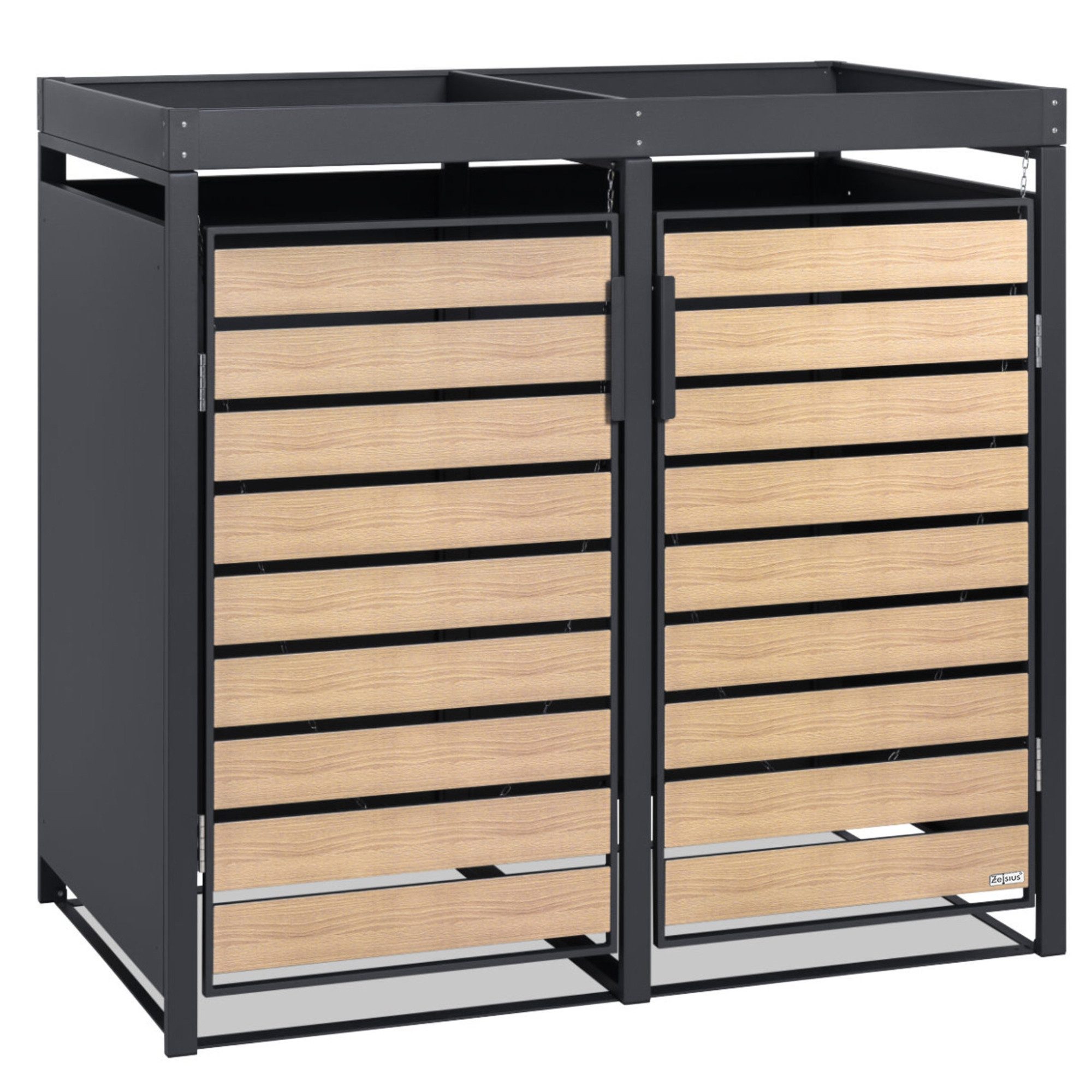 Zelsius Mülltonnenbox mit Pflanzdach, für 2 Mülltonnen, Anthrazit RAL 7016, Tür in Holzoptik