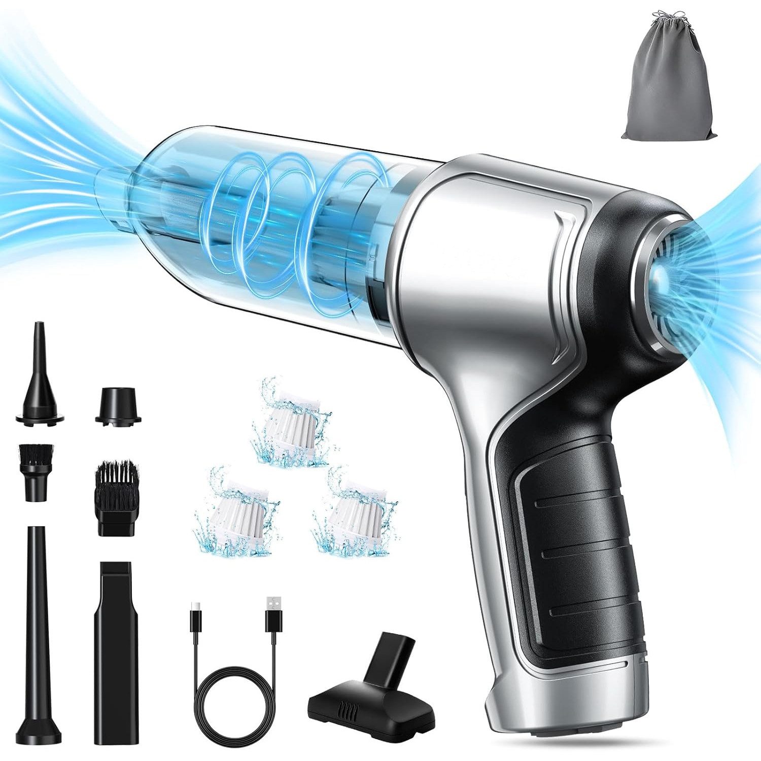 Der wiederaufladbare mini staubsauger ist mit einem integrierten 5000mAh Akku ausgestattet. Das Paket enthält ein USB-C-Ladekabel, das es Ihnen ermöglicht, den Staubsauger bequem im Auto oder zu Hause an jeder USB-Buchse aufzuladen.