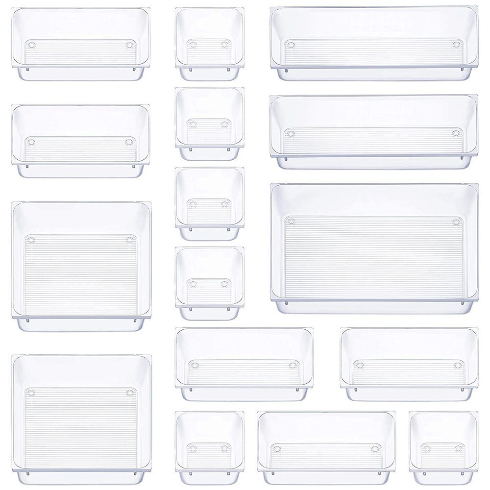 Eigenschaften: 4 Größenkombination Verschiedene Größen tragen dazu bei, die Organisation verschiedener Artikel flexibler und einfacher zu gestalten. Passen Sie alle Arten von Schubladen, wie Waschtisch, Bad, Küche und Büro Schubladen. Rutschfestes Design Silikonpads an der Unterseite des Behälters verhindern, dass sich die Box beim Ziehen der Schublade bewegt, halten Sie die Dinge immer an ihrem eigenen Platz. Gebaut für die Ewigkeit Hergestellt aus strapazierfähigem und transparentem Kunststoff, gebaut für die Ewigkeit. Durchsichtige Behälter lassen Sie alles in ihnen sehen, wenn Sie einen Stapel von ihnen aus einer Schublade ziehen.