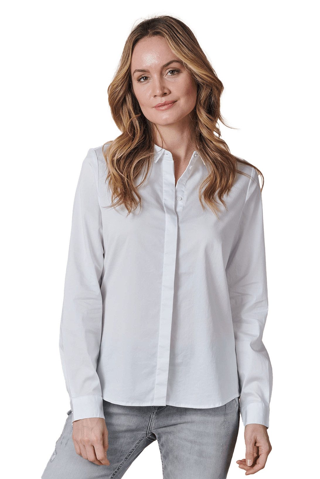 Dieser Artikel zeichnet sich durch folgende Besonderheiten aus: Kragen, verdeckte Knopfleiste, Langarm, Knopf an Ärmelenden, gerader Schnitt und endet auf Hüfthöhe.