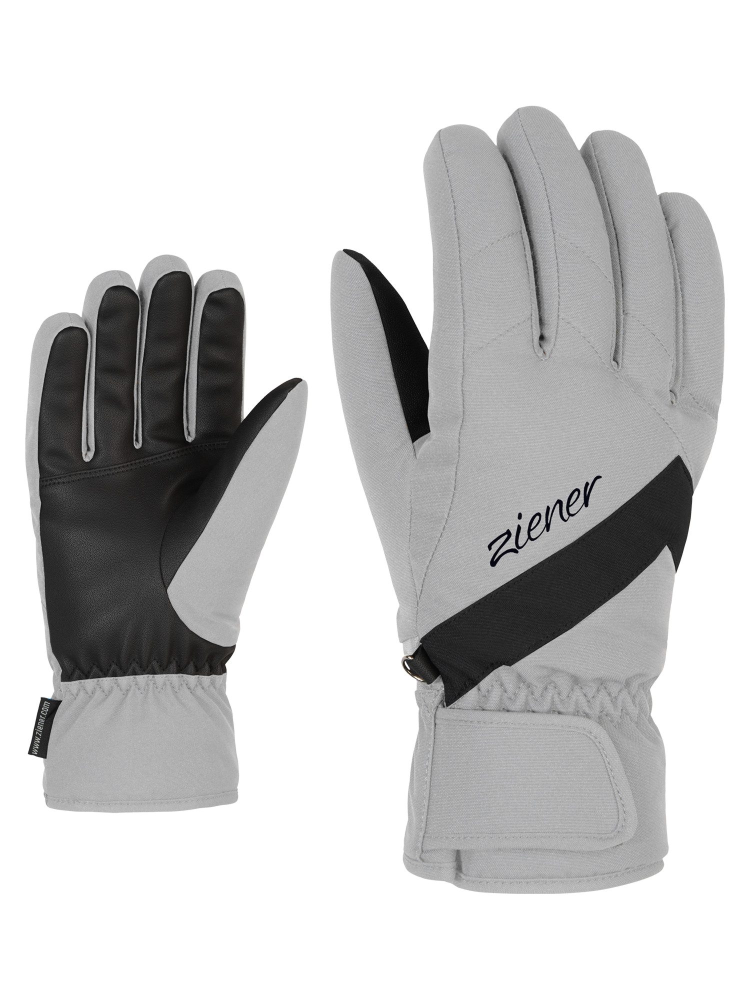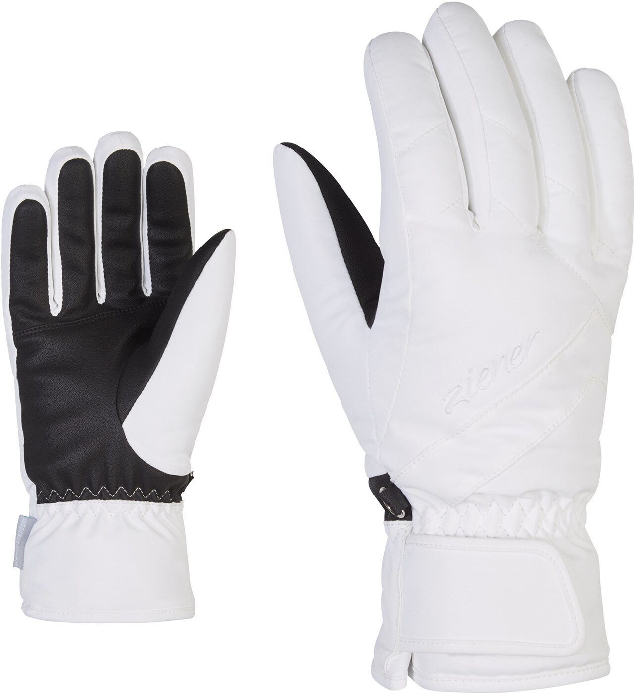 Die sportlichen, modischen ZIENER Damen Skihandschuhe KAITI AS® LADY mit wasser- und winddichter ZIENER AQUASHIELD® Membran sorgen für ein sehr warmes und trockenes Klima. Die kompakten Innenhände verleihen optimale Kraftübertragung und Griffgefühl am Skistock. Das elastische Obermaterial schafft perfekte Bewegungsfreiheit. Die Stulpe wird mit Hilfe eines breiten Klettriegels optimal befestigt. Das Produkt enthält recyceltes Material für einen ressourcenschonenden Umgang mit der Umwelt. ZIENER bietet für das Modell zusätzlich eine SOS-ID Version an. Tritt ein Notfall ein, haben Einsatzkräfte durch einen QR-Code am Handschuh-Bündchen Zugriff auf die wichtigsten Patienten-Informationen. Eigenschaften: - Wasserdicht - Wasser- und winddichte AQUASHIELD® Membrane Pflegehinweise: - nicht waschen - nicht bleichen - nicht im Trockner trocknen - nicht bügeln - keine chemische Reinigung