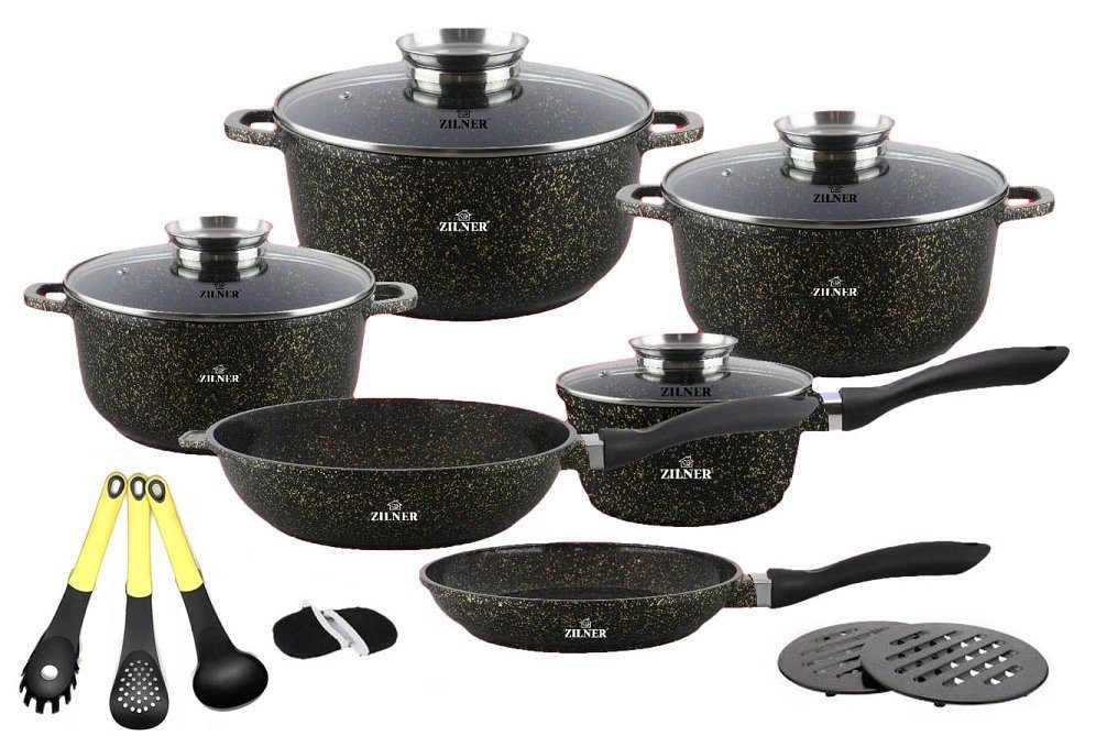 1 x Kasserolle mit Deckel 1.3L, 16 cm x 7,5 cm 1 x Topf mit Deckel 2.3L, 20 cm x 8,5 cm 1 x Topf mit Deckel 4.5L, 24 cm x 11,5 cm 1 x Topf mit Deckel 6.8L, 28 cm x 12,5 cm 1 x Bratpfanne 1.5L, 24 cm x 4,5 cm 1 x Bratpfanne 3.4L, 28 cm x 7,0 cm 1 x Untersetzer 3 x Küchenzubehör 2 x Schutzhandschuhe