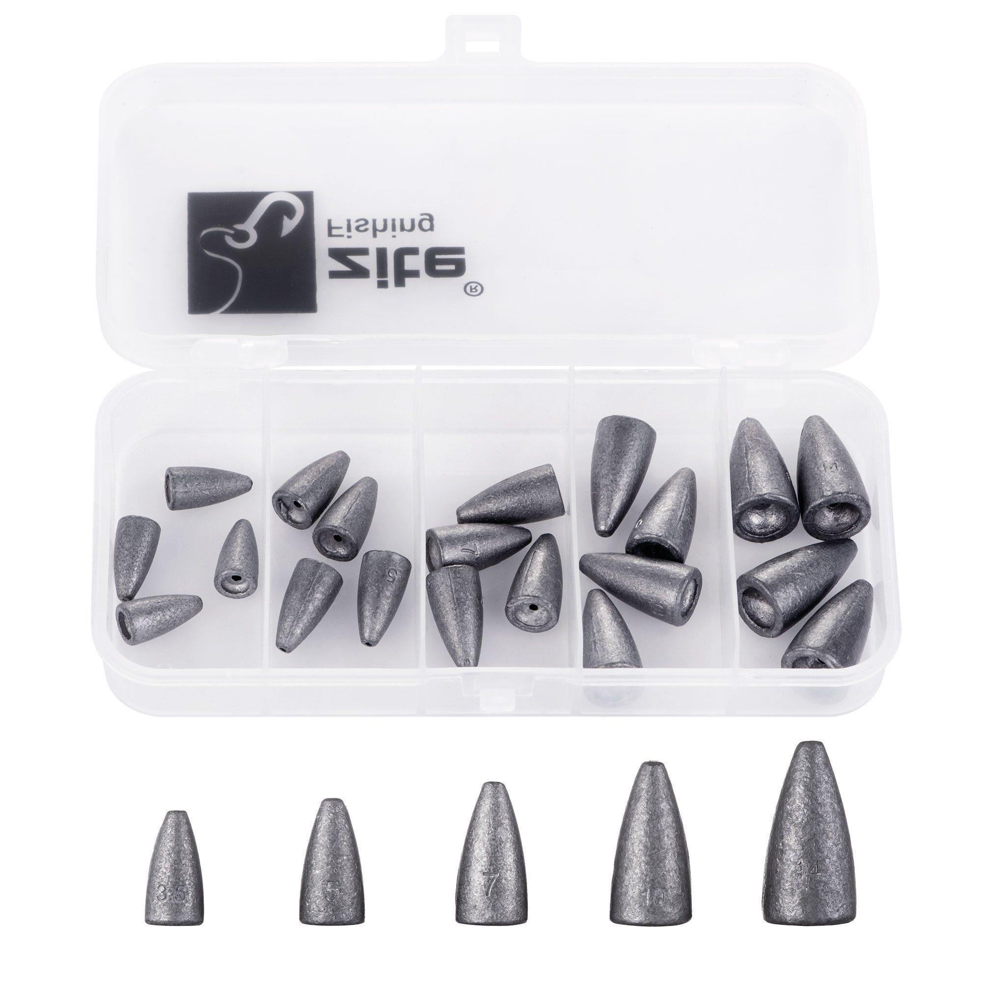 VIELFÄLTIGE GRÖßEN: Set mit 20 Bulletblei Angelgewichten in 5 verschiedenen Größen (3,5g, 5g, 7g, 10g, 14g), jeweils 5 Stück für unterschiedliche Angelbedingungen.
