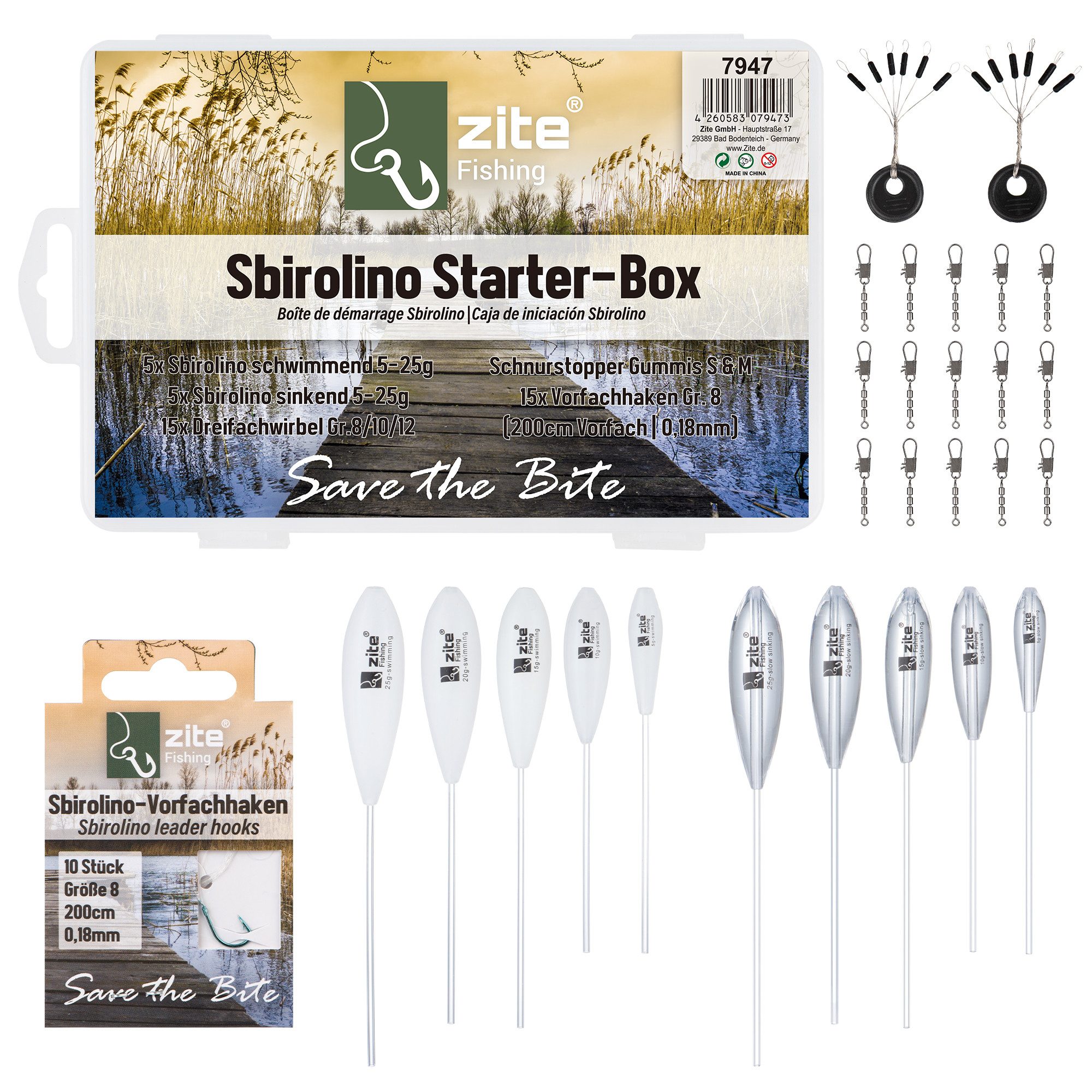 Die Zite Fishing Sbirolino Starterbox ist ein praktisches Set für Forellenangler, die mit der Sbirolino-Technik erfolgreich fischen möchten. Mit 10 Sbirolinos in verschiedenen Gewichten & Sinkraten sowie allem nötigen Zubehör ist man direkt startklar.