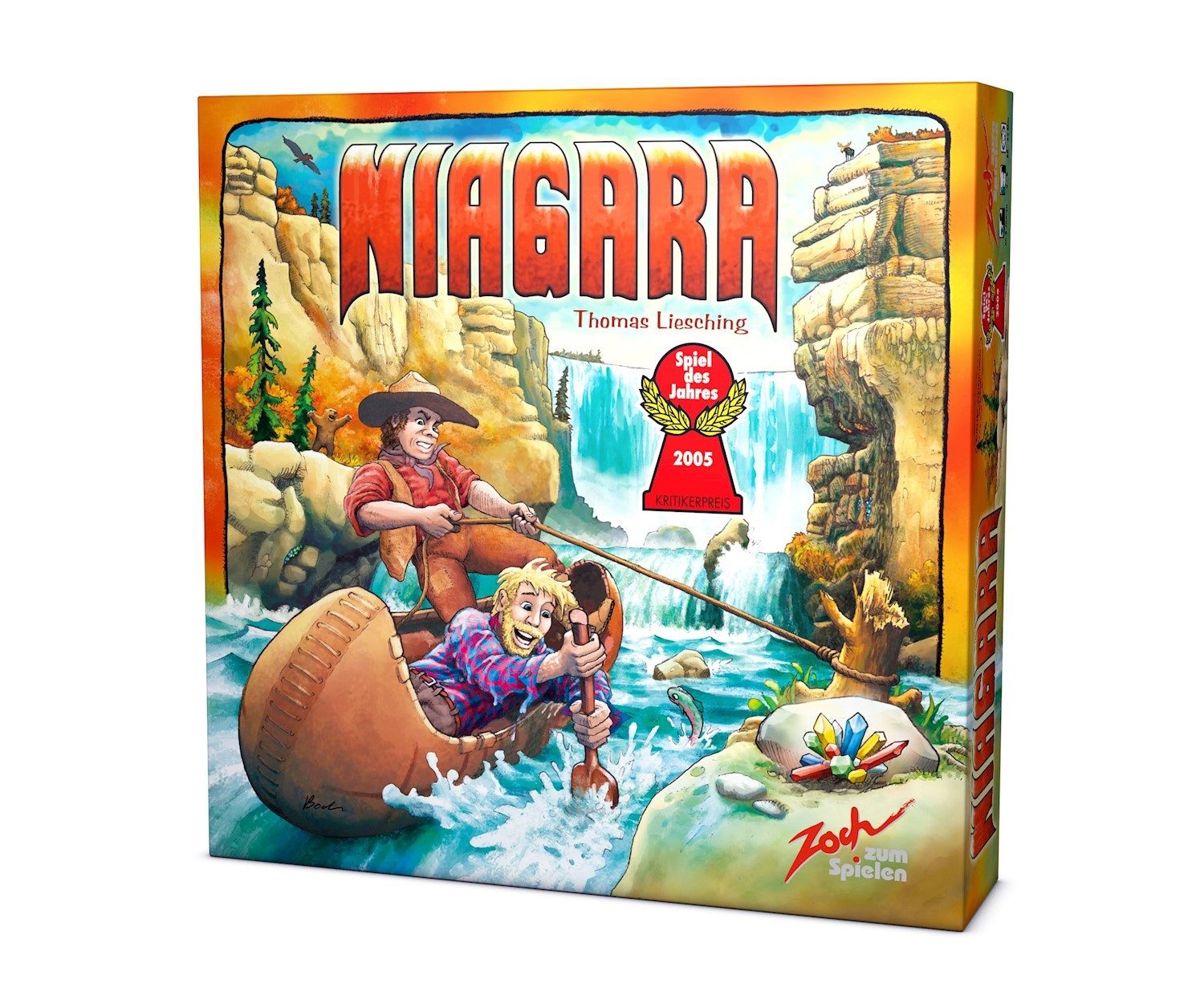 "Niagara" ist eine mitreißende Schatzsuche im Wettlauf gegen die Strömung. Das Flussbett bilden transparente Scheiben, auf denen die Kanus aller Spieler auf die Wasserfälle zutreiben. Mit Hilfe ihrer Paddelkarten bewegen die Spieler ihre Boote und beeinflussen zugleich die Flussgeschwindigkeit. Ziel ist es, Edelsteine an den Flussufern einzuladen und zurück an Land zu bringen. Aber auch an Bord sind die Juwelen längst nicht sicher, denn manche Bootscrew entpuppt sich hinterrücks als Diebesbande. Das spektakuläre dreidimensionale Spielmaterial schafft Atmosphäre pur.