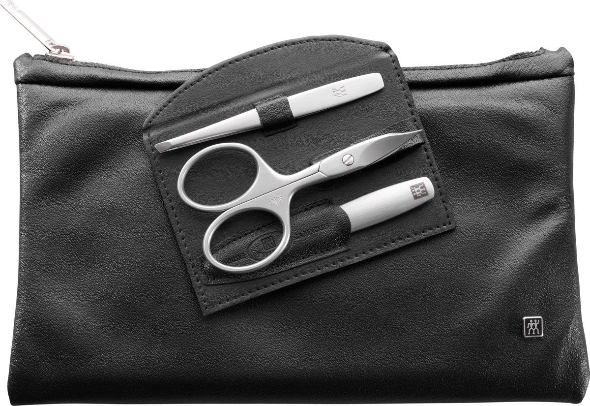 Zwilling Twinox Kosmetiktasche 3-tlg. schwarz Kombi-Nagelschere Pinzette schräg Saphir-Nagelfeile aus edelem Rindleder Kombi-Nagelschere, mattiert 90 mm Pinzette, schräg, mattiert 90 mm Saphir-Nagelfeile, Edelstahl, mattiert 90 mm Die Synthese aus hervorragender ZWILLING Verarbeitung und bestem rostfreiem Edelstahl. TWINOX ist die Oberklasse im ZWILLING Beauty Меню. Der matt satinierte, rostfreie Stahl ist resistent gegen Korrosion in Räumen und Ländern mit hoher Luftfeuchtigkeit. Die präzise Verarbeitung sichert langfristig perfekt arbeitende Instrumente. TWINOX – das Beste für gepflegte Hände.