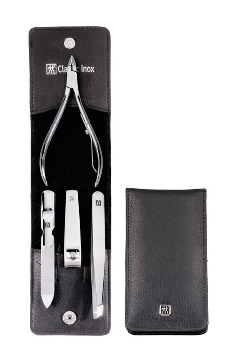Zwilling CLASSIC INOX Taschen-Etui, Rindleder, schwarz, 4-tlg. Schwarzes Rindleder außen und feiner Samt innen. Maße ca. 60 x 110 mm. Bestückt mit Nagelknipser, Hautzange, Nagelfeile und Pinzette. Classic Inox Die perfekten Beauty-Tools von ZWILLING tragen ihren Teil dazu bei, dass man von Kopf bis Fuß zufrieden mit sich sein kann. Mit der neu entwickelten Manicure-Serie ZWILLING Classic Inox wird die Körperpflege zum individuellen Wellness- Programm. ZWILLING Classic Inox weiß mit edlen, polierten Instrumenten und hochwertigen Leder etuis auch optisch zu gefallen. Das umfangreiche Меню enthält alle Instrumente, die man sich für die tägliche Körperpflege wünscht. Zur Wahl stehen 3-, 4- und 5-teilige Manicure-Etuis in verschiedenen Farben, bestückt mit unempfindlichen, rostfreien Instrumenten in bewährter ZWILLING Qualität. Die Instrumente liegen perfekt in der Hand und lassen sich intuitiv bedienen. Schere, Pinzette, Knipser & Co. arbeiten absolut präzise und zugleich überaus sanft. Hochwertiger, rostfreier Edelstahl und sorgfältige Verarbeitung stellen sicher, dass die Instrumente ästhetisch wie funktional lange Zeit ihre Klasse bewahren.