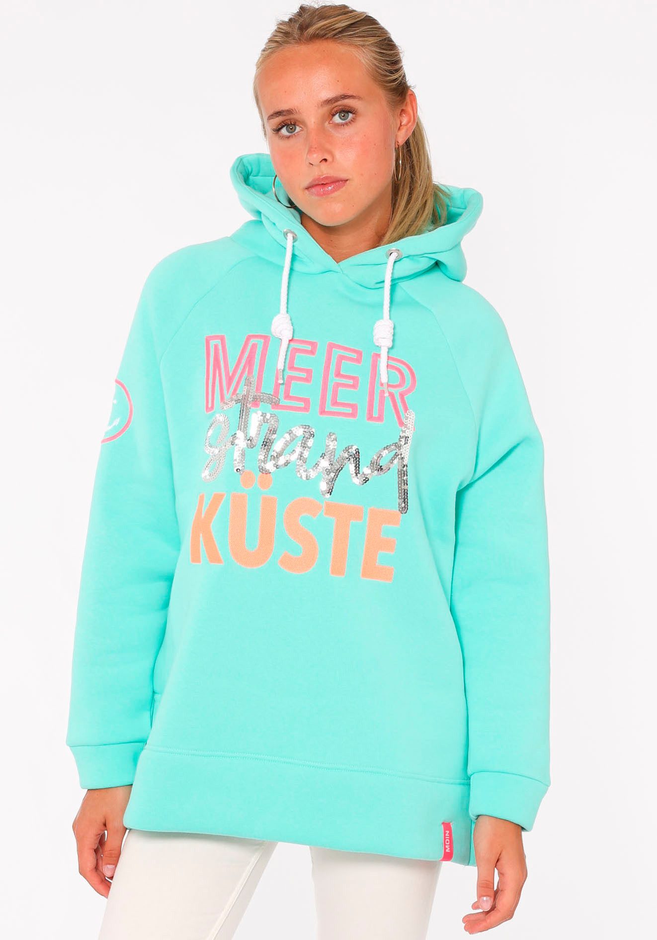 Besondere Merkmale | mit Kapuze, Pailletten-Schriftzug und aufgesticktem Anker-Motiv |