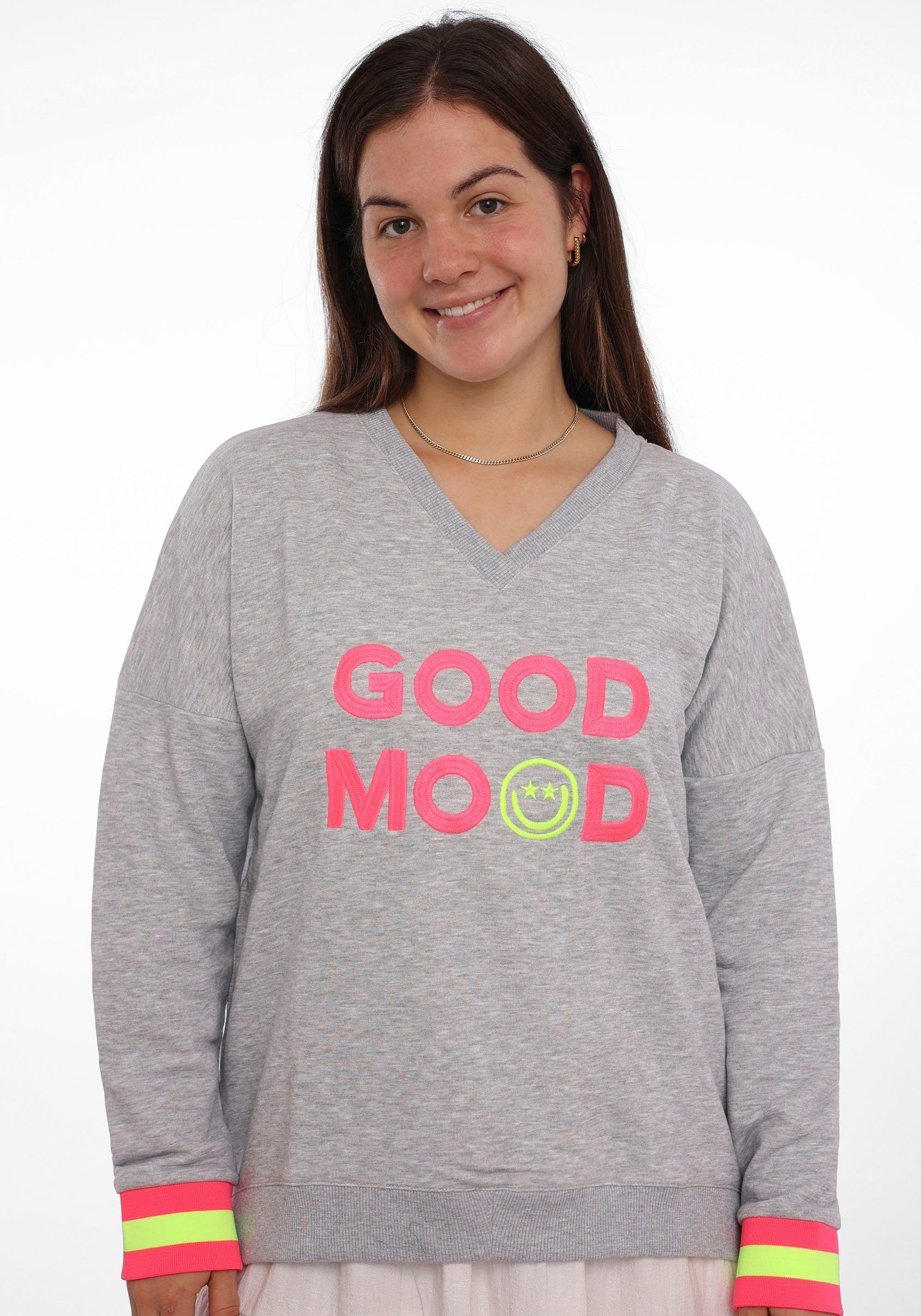 Mit dem Sweatshirt von Zwillingsherz bist du stilsicher unterwegs und gibst deinem Look den letzten Schliff. Es wird durch die Neonfarben zum knalligen Highlight, wodurch das Outfit nicht langweilig wirkt. Die langen Ärmel enden in einem Bündchen, das für guten Sitz sorgt. Dieses Sweatshirt hat einen V-Ausschnitt mit Rippbündchen und ist hüftlang sowie bequem geschnitten, sodass du einen hohen Tragekomfort hast.