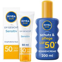 Nivea Sun Sonnenschutzpflege UV GESICHT Sensitiv Sonnenschutz LSF50 & Sonnenspray LSF50+, Set, Für empfindliche Haut, nicht fettend, unparfümiert.