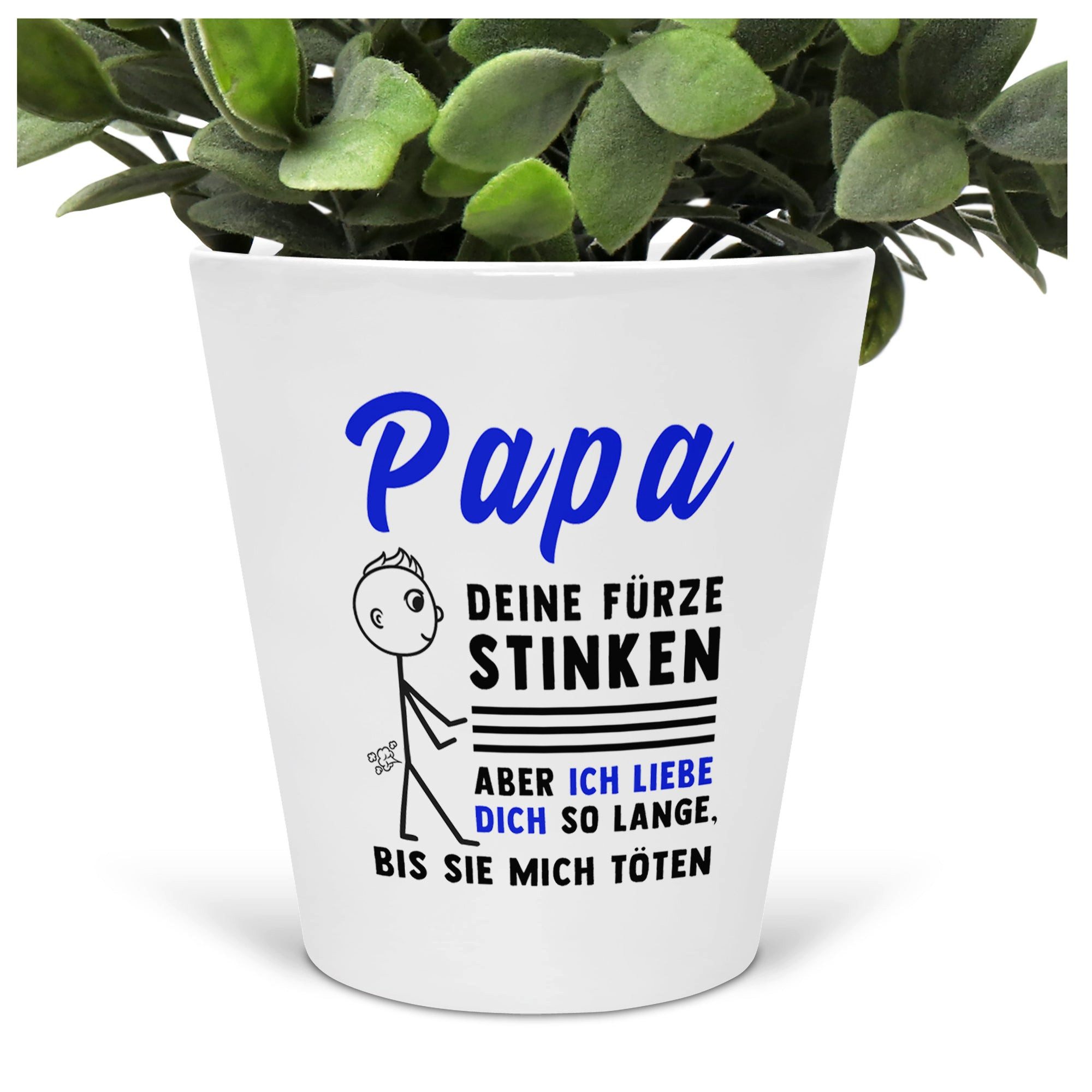In Deutschland bedruckter weisser Blumentopif mit folgendem Spruch bzw. Motiv: Papa, Deine Fürze Stinken, Aber Ich Liebe Dich So Lange, Bis Sie Mich Töten