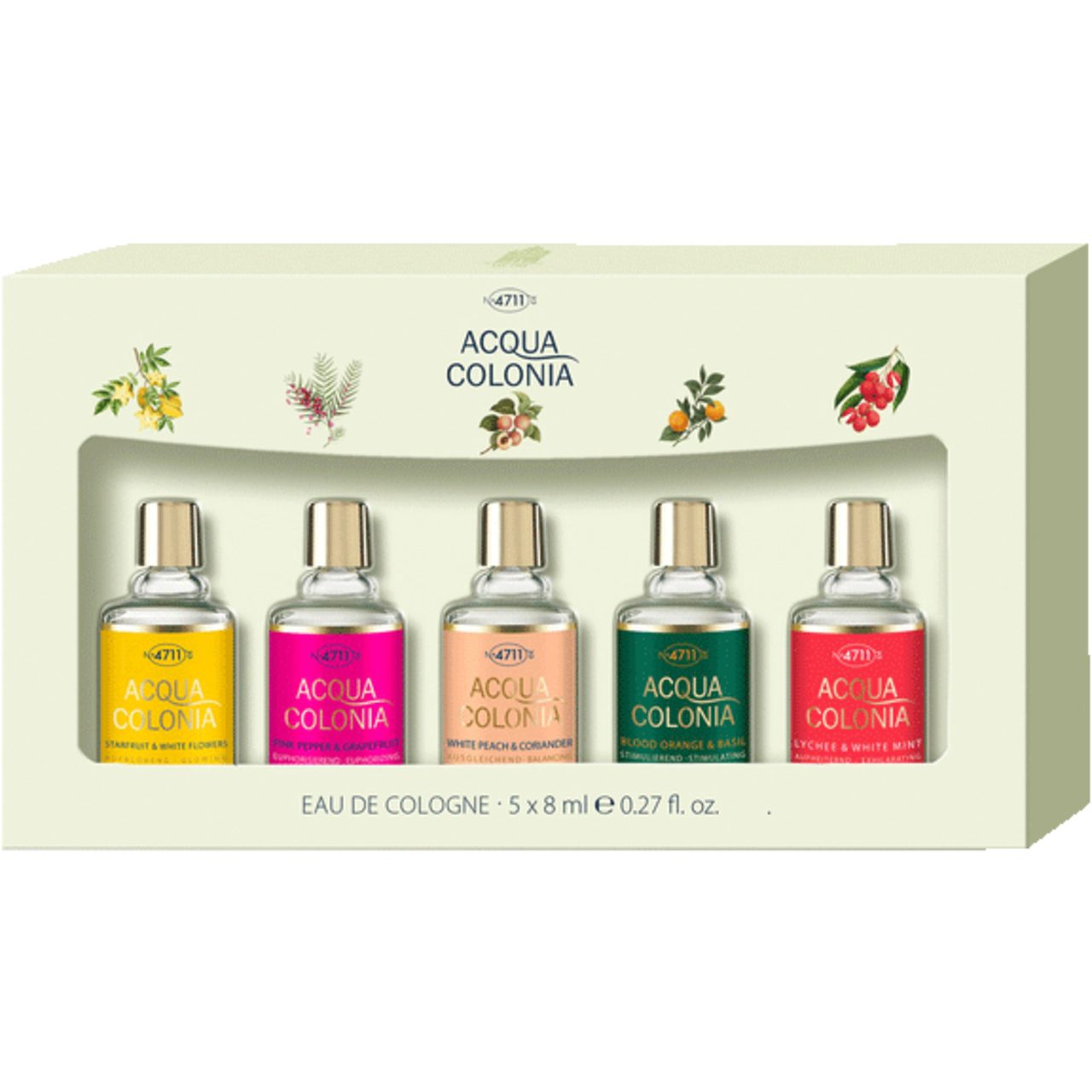 Verwöhnen Sie Ihre Sinne mit dem exklusiven Miniature Eau de Cologne Set. Dieses Set enthält fünf einzigartige Düfte, die jede Stimmung und jeden Anlass perfekt ergänzen. Jedes Fläschchen hat eine praktische Розмір von 8 ml, ideal für unterwegs oder zum Ausprobieren neuer Düfte. Starfruit & White Flower: Tauchen Sie ein in die erfrischende Kombination von Sternfrucht und weißen Blüten. Dieser Duft vereint die süßen und spritzigen Noten der exotischen Sternfrucht mit dem zarten Aroma von weißen Blüten. Ein femininer, leichter Duft, der an sonnige Tage erinnert und ein Gefühl von Frische und Unbeschwertheit vermittelt. Pink Pepper & Grapefruit: Ein lebhafter und belebender Duft, der Ihre Sinne weckt. Die spritzige Grapefruit verbindet sich mit der würzigen Schärfe des rosa Pfeffers zu einem aufregenden und dynamischen Erlebnis. Perfekt für einen energiegeladenen Start in den Tag oder als Muntermacher zwischendurch. Blood Orange & Basil: Diese einzigartige Kombination aus blutroter Orange und Basilikum bringt Frische und Würze in Einklang. Die saftige, süßliche Note der Blutorange wird durch das erfrischende, leicht herbe Aroma von Basilikum perfekt ergänzt. Ein Duft, der die Sinne belebt und Sie in einen mediterranen Garten entführt. White Peach & Coriander: Lassen Sie sich von der süßen Sanftheit der weißen Pfirsiche und der würzigen Frische des Korianders verzaubern. Dieser Duft ist eine harmonische Mischung, die sowohl sanft als auch erfrischend wirkt. Ideal für romantische Abende oder entspannte Momente. Lychee & White Mint: Ein erfrischender und zugleich süßer Duft, der die exotische Fruchtigkeit der Litschi mit der kühlenden Frische der weißen Minze vereint. Ein Duft, der Sie sofort in Urlaubsstimmung versetzt und perfekt für heiße Sommertage geeignet ist. Erleben Sie die Vielfalt der Düfte mit diesem exquisiten Set und finden Sie Ihren persönlichen Favoriten. Ob für sich selbst oder als Geschenk – dieses Miniature Eau de Cologne Set wird garantiert begeistern.