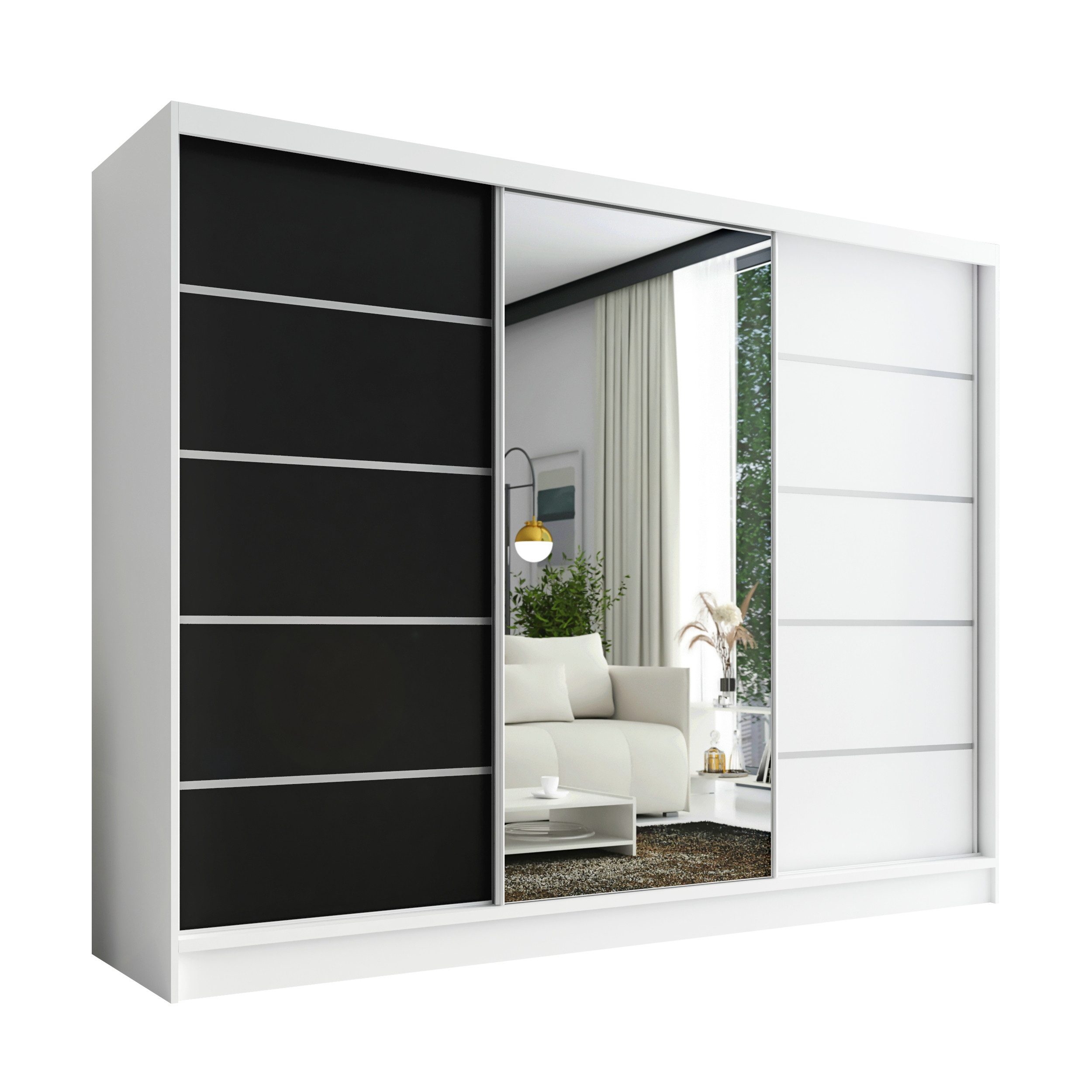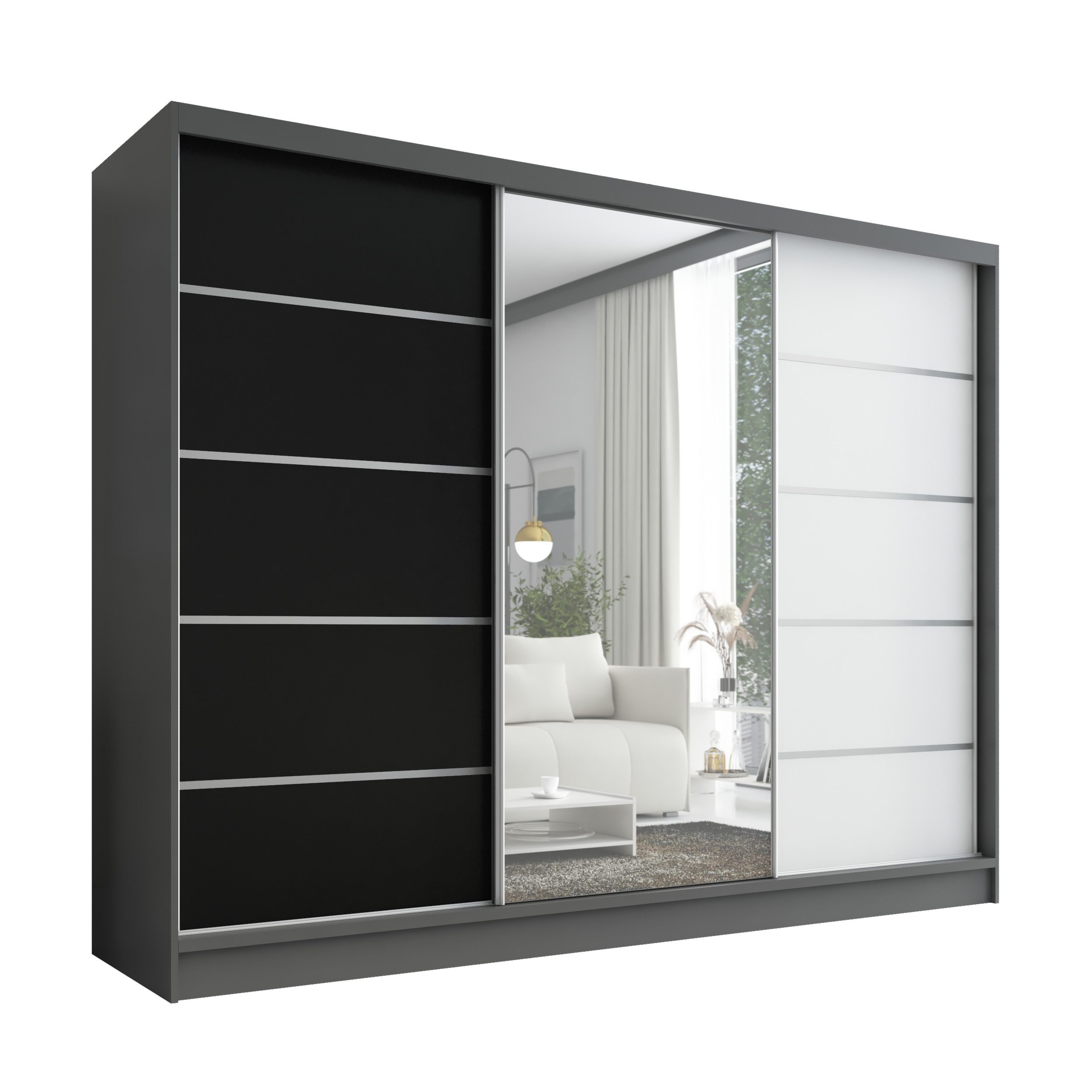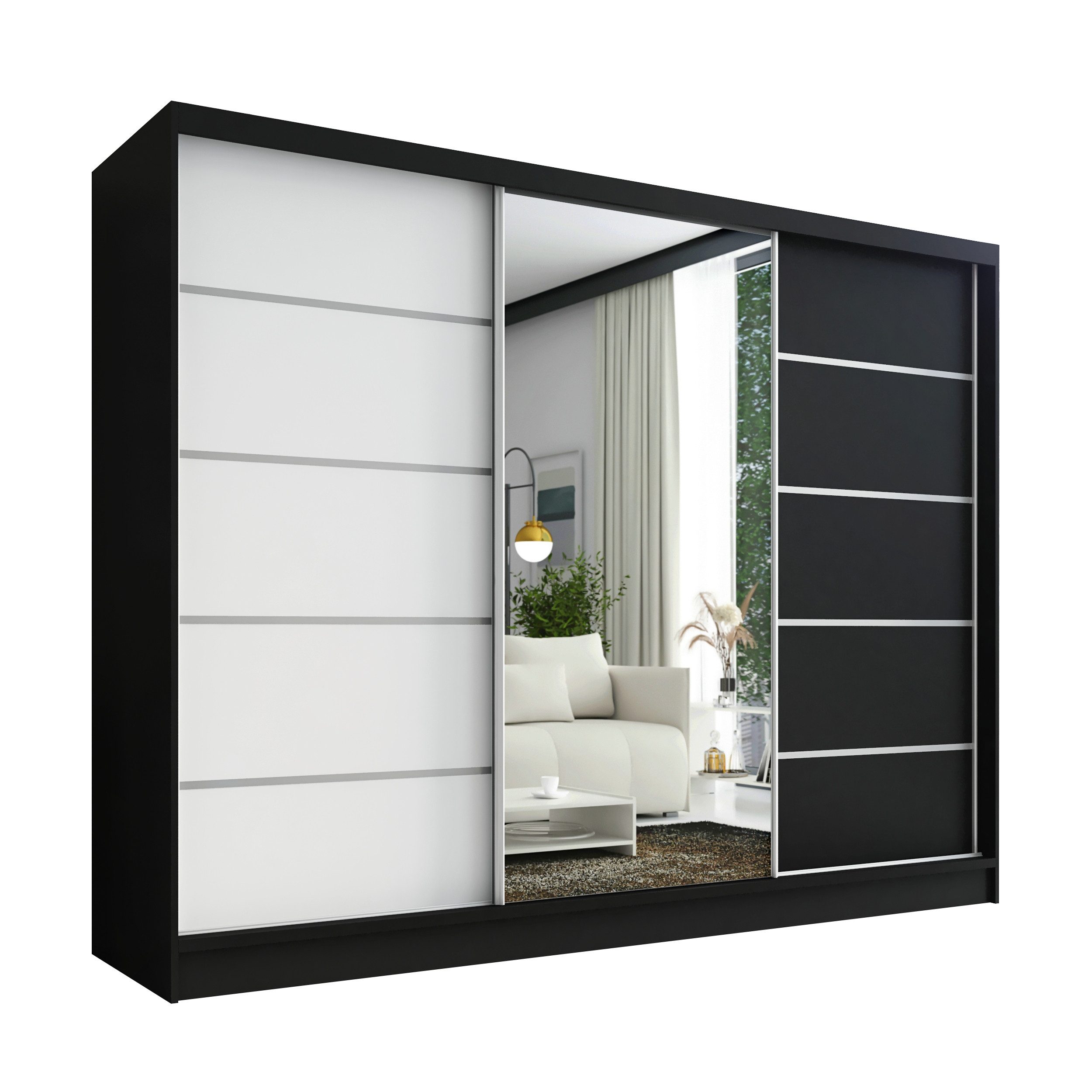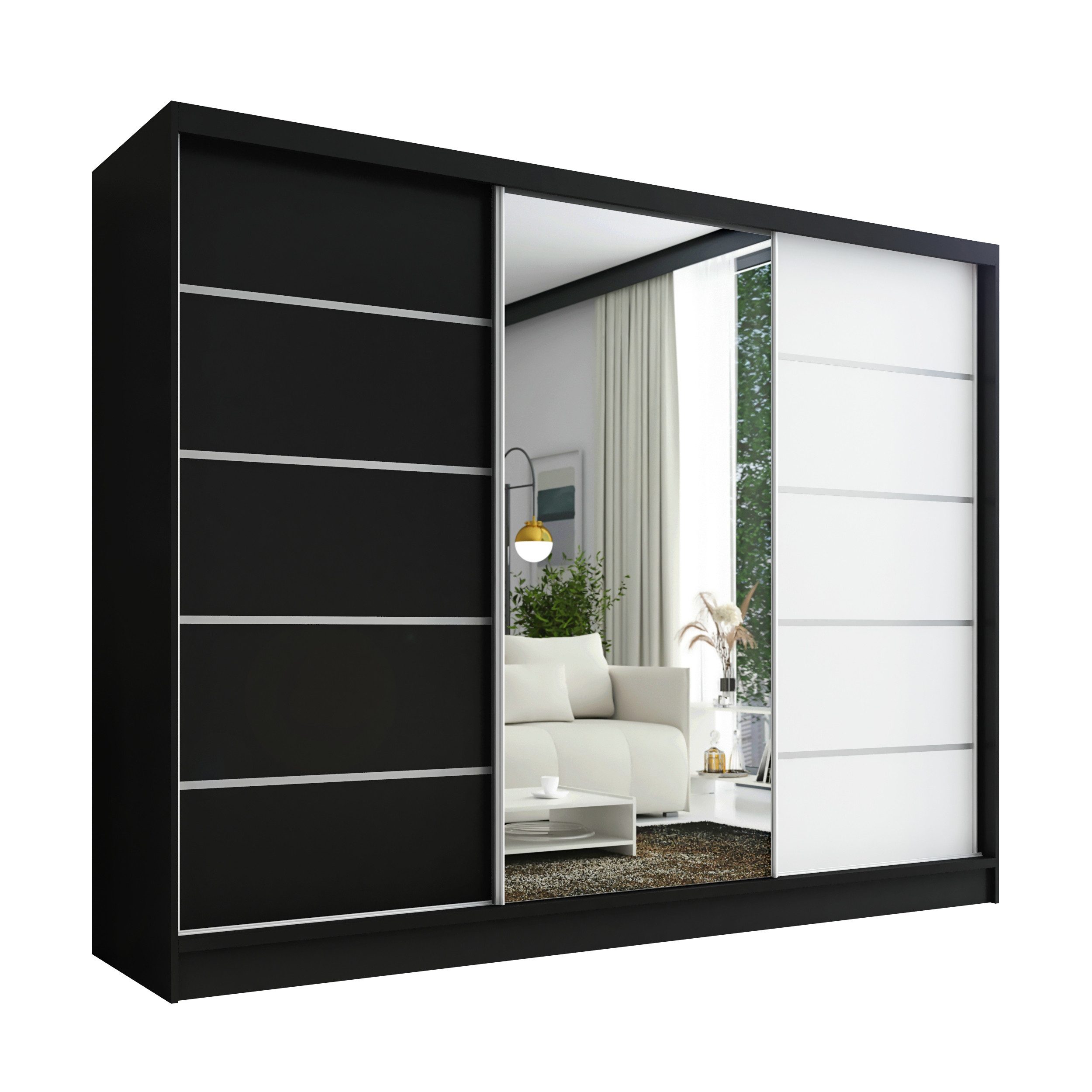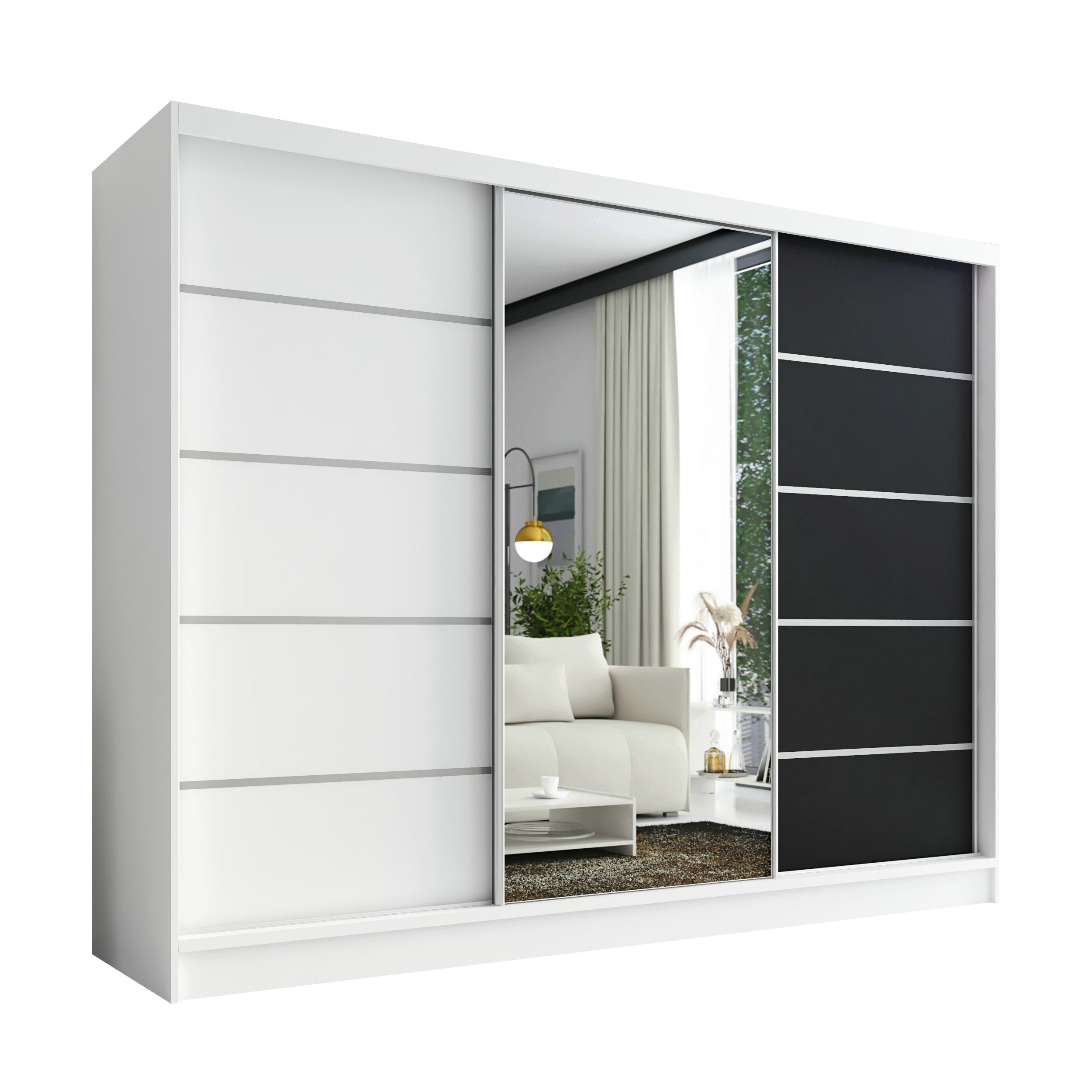 Der moderne 3-türige Kleiderschrank mit Spiegel ist die perfekte Lösung für jedes Zuhause, das Eleganz mit Funktionalität verbindet. Mit geräumigen Schubladen, Kleiderstangen und zahlreichen Regalen bietet der Schrank außergewöhnlich viel Stauraum. Der Schrank ist in verschiedenen Варіантиn erhältlich und fügt sich ideal in jedes Interieur ein – vom Schlafzimmer über Jugendzimmer bis hin zu Büros oder Hotelzimmern.