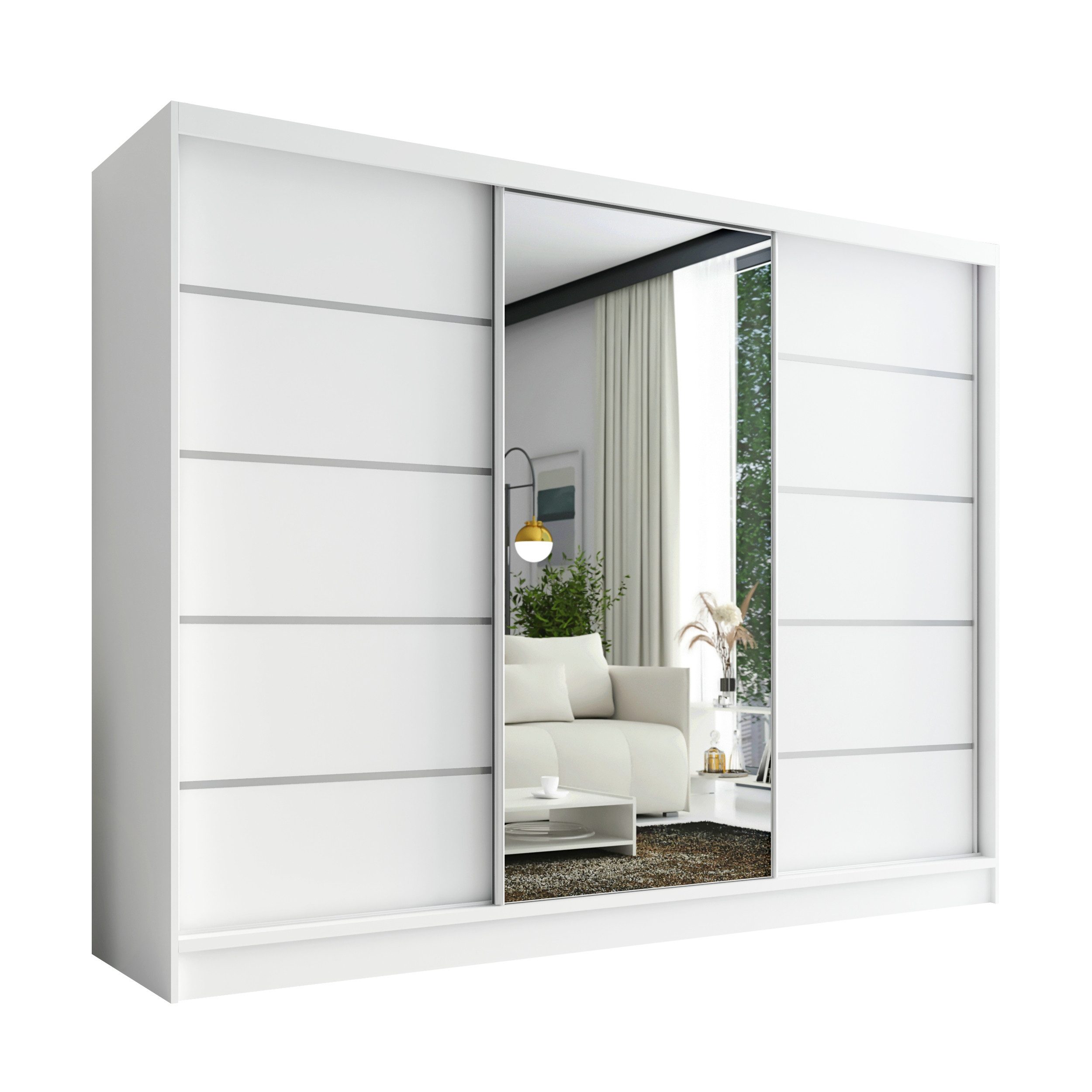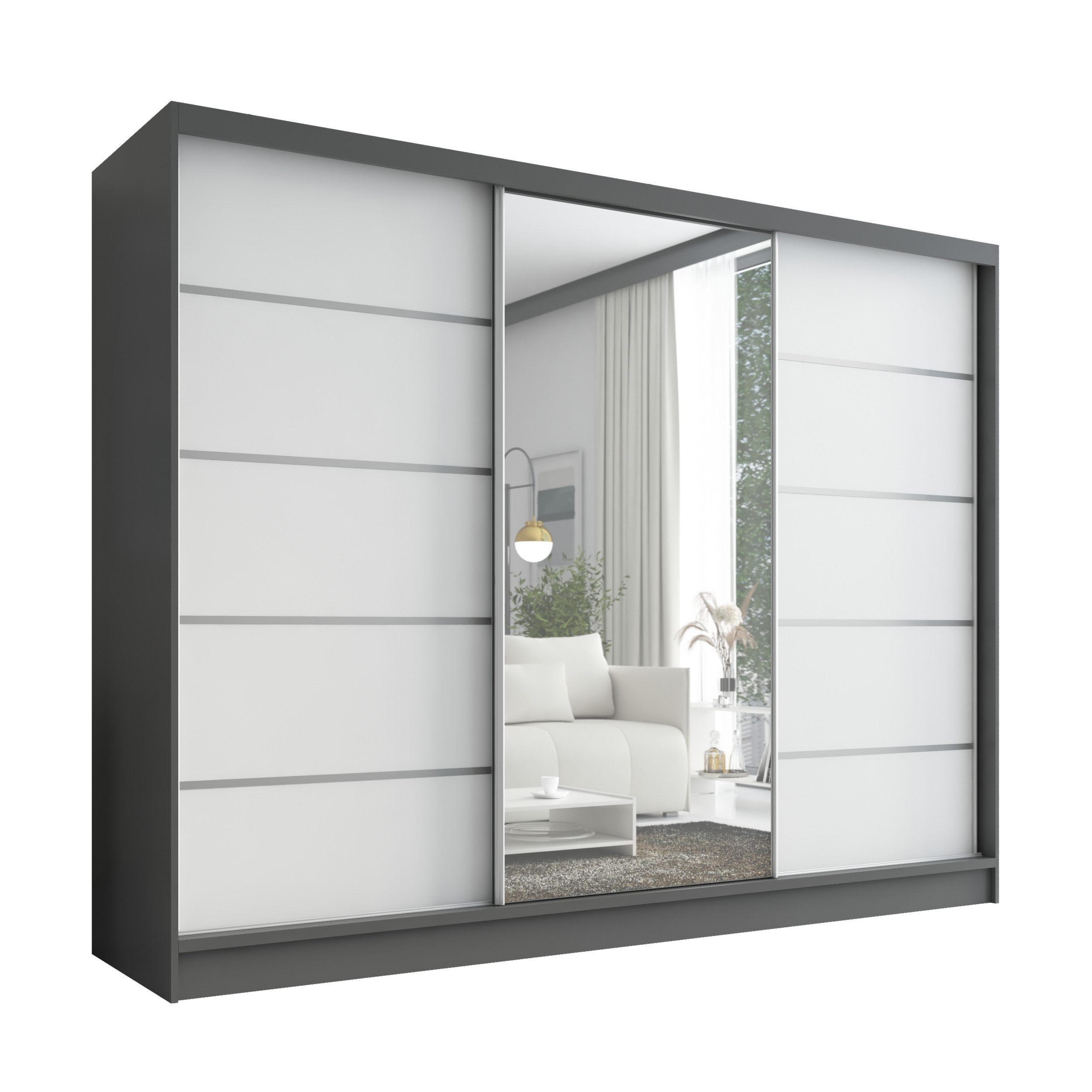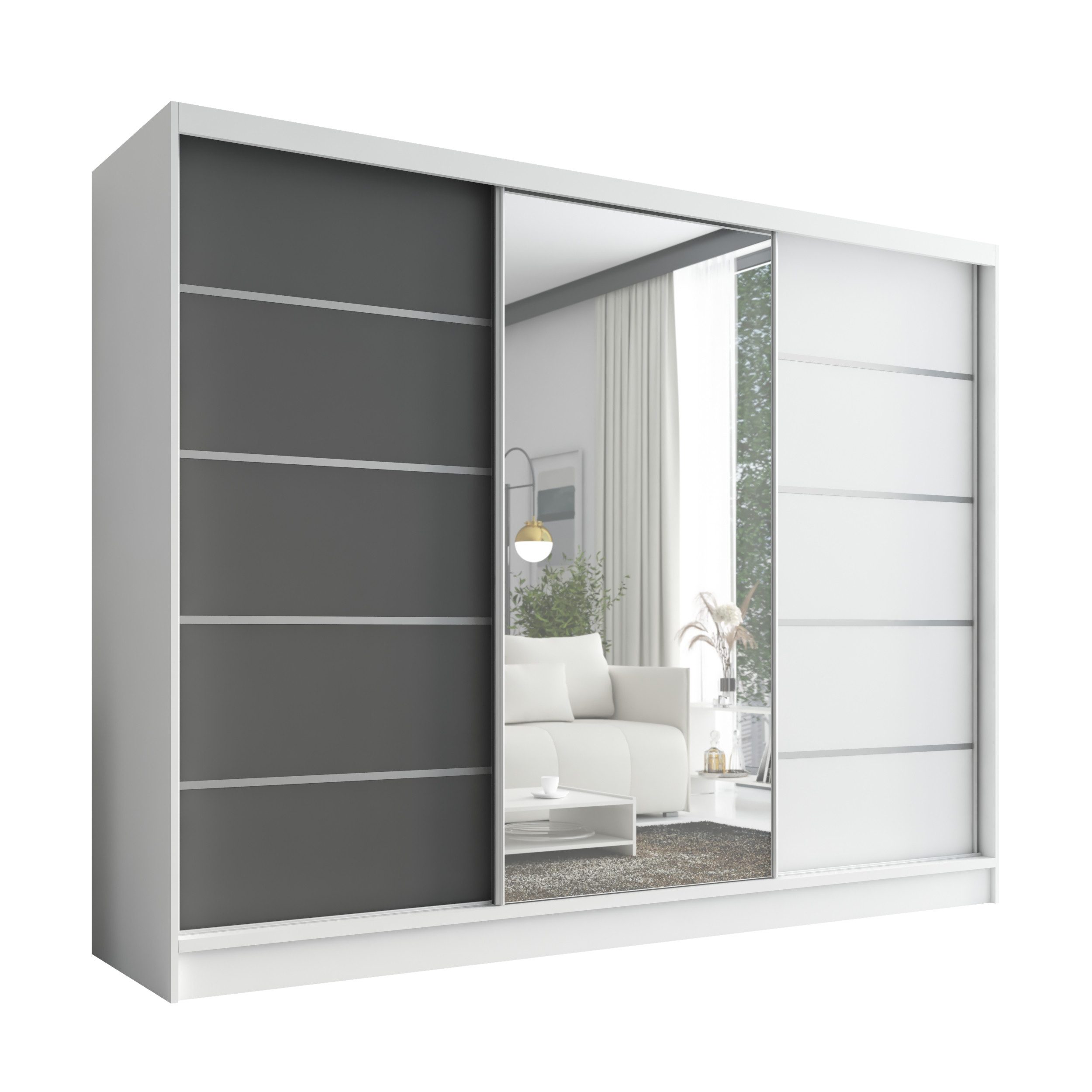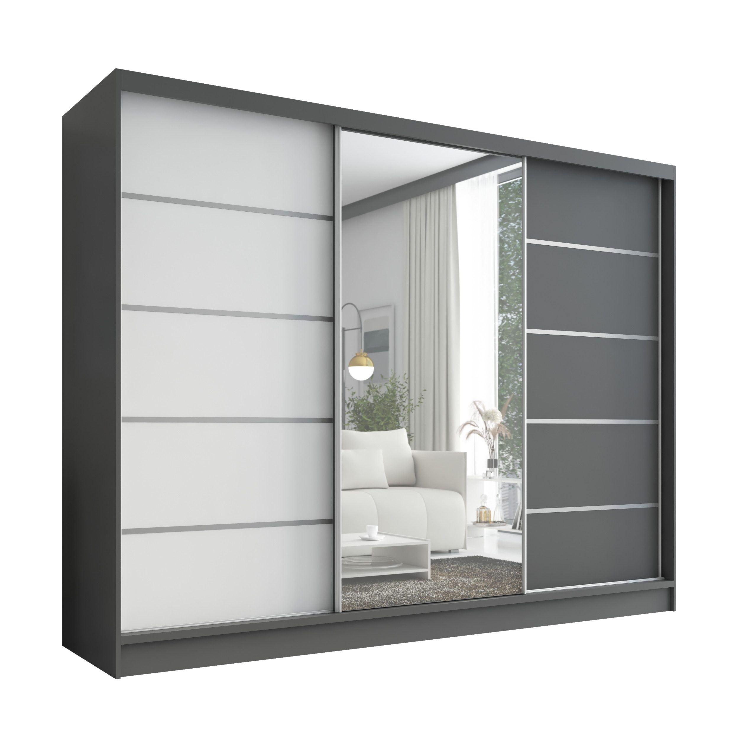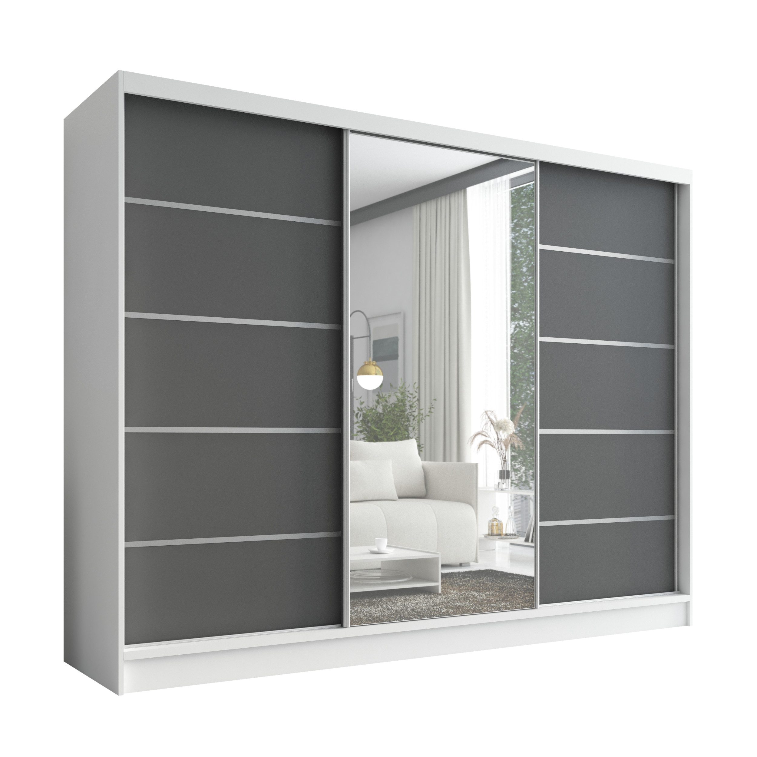 Der moderne 3-türige Kleiderschrank mit Spiegel ist die perfekte Lösung für jedes Zuhause, das Eleganz mit Funktionalität verbindet. Mit geräumigen Schubladen, Kleiderstangen und zahlreichen Regalen bietet der Schrank außergewöhnlich viel Stauraum. Der Schrank ist in verschiedenen Варіантиn erhältlich und fügt sich ideal in jedes Interieur ein – vom Schlafzimmer über Jugendzimmer bis hin zu Büros oder Hotelzimmern.