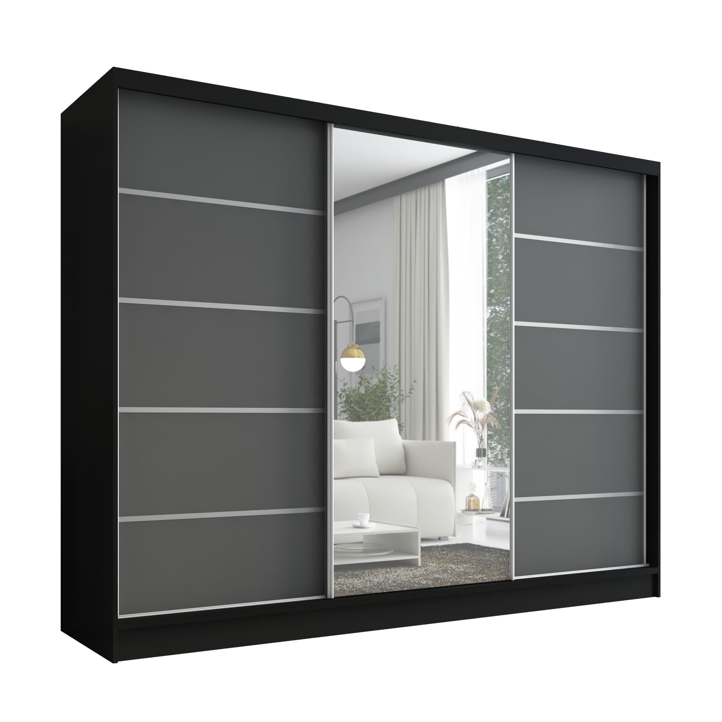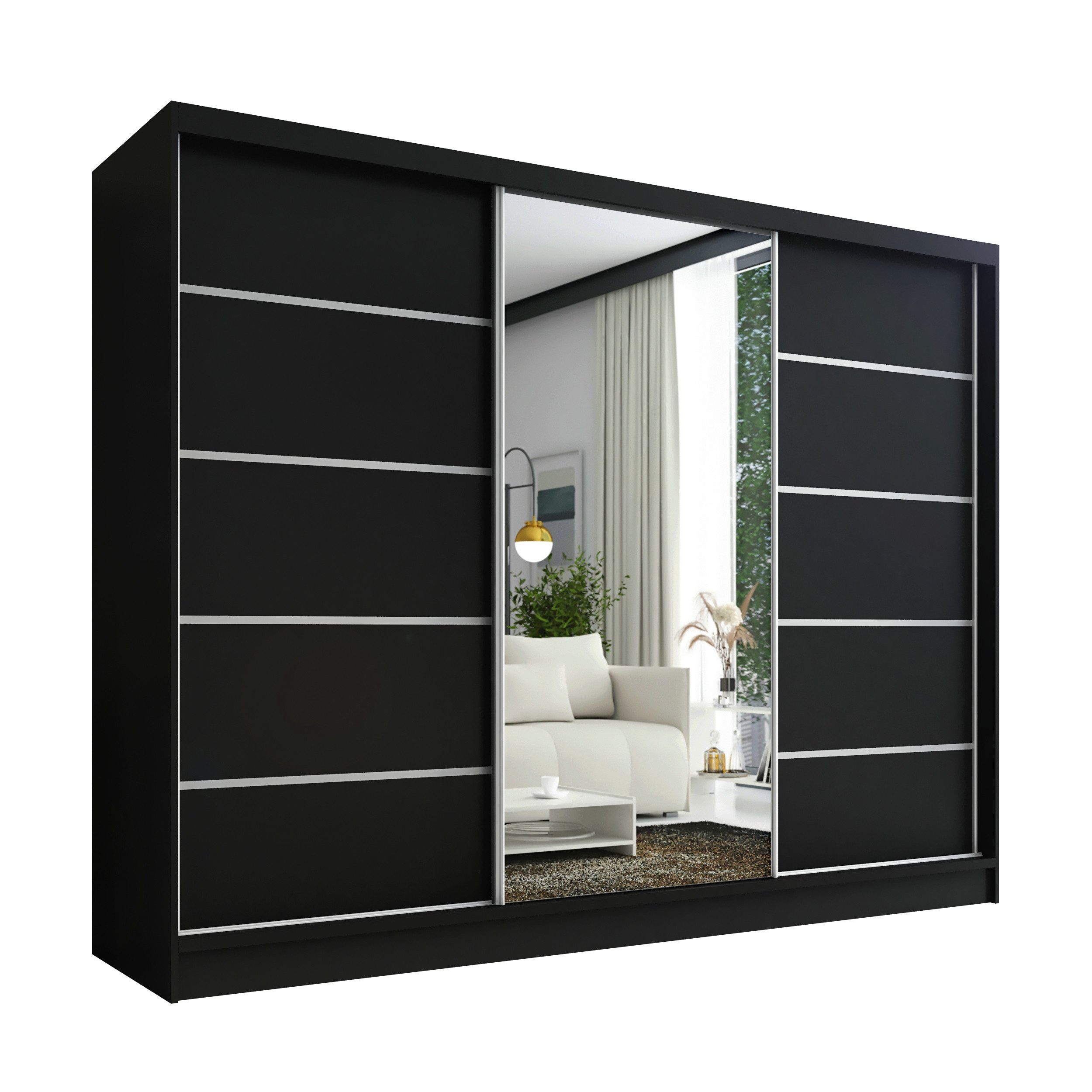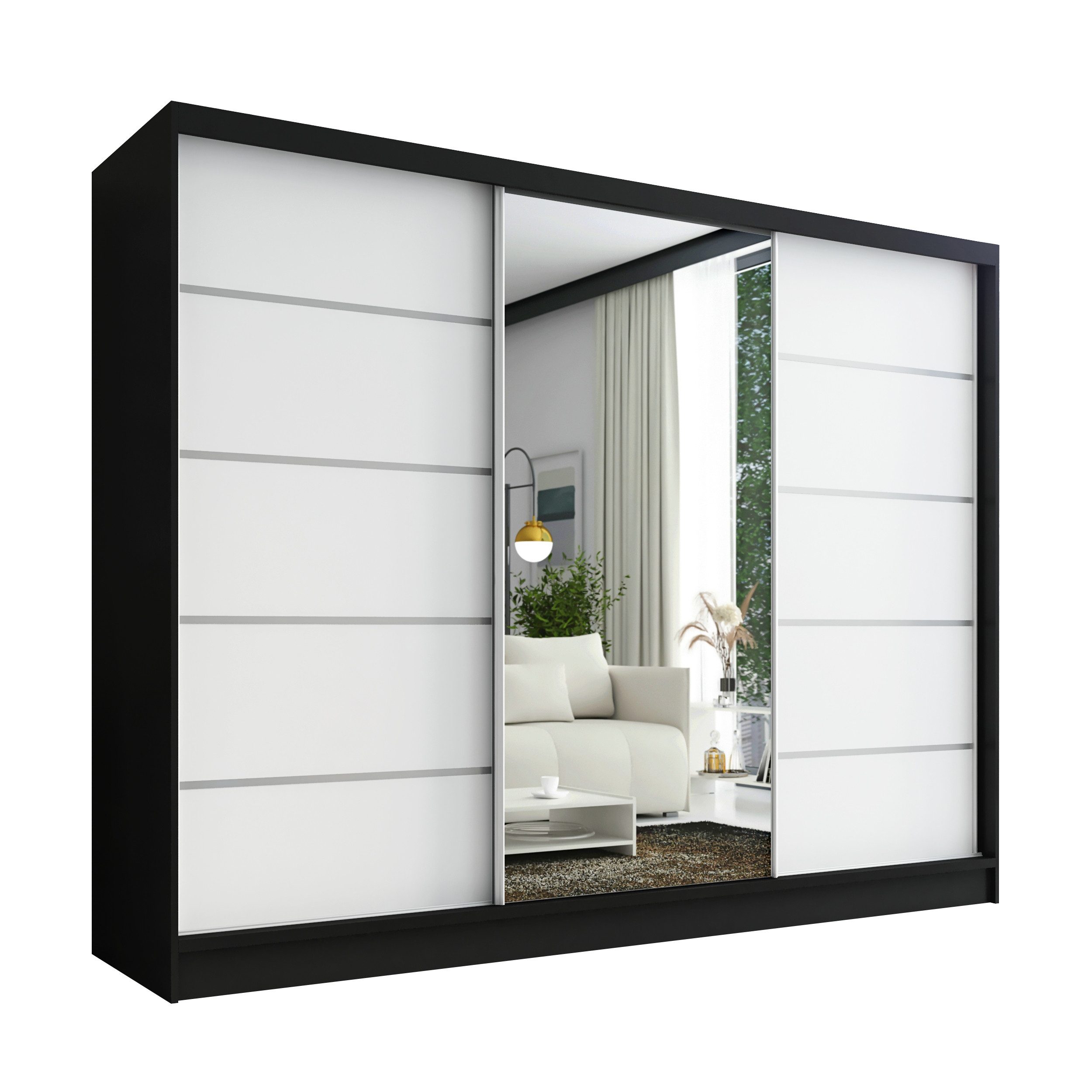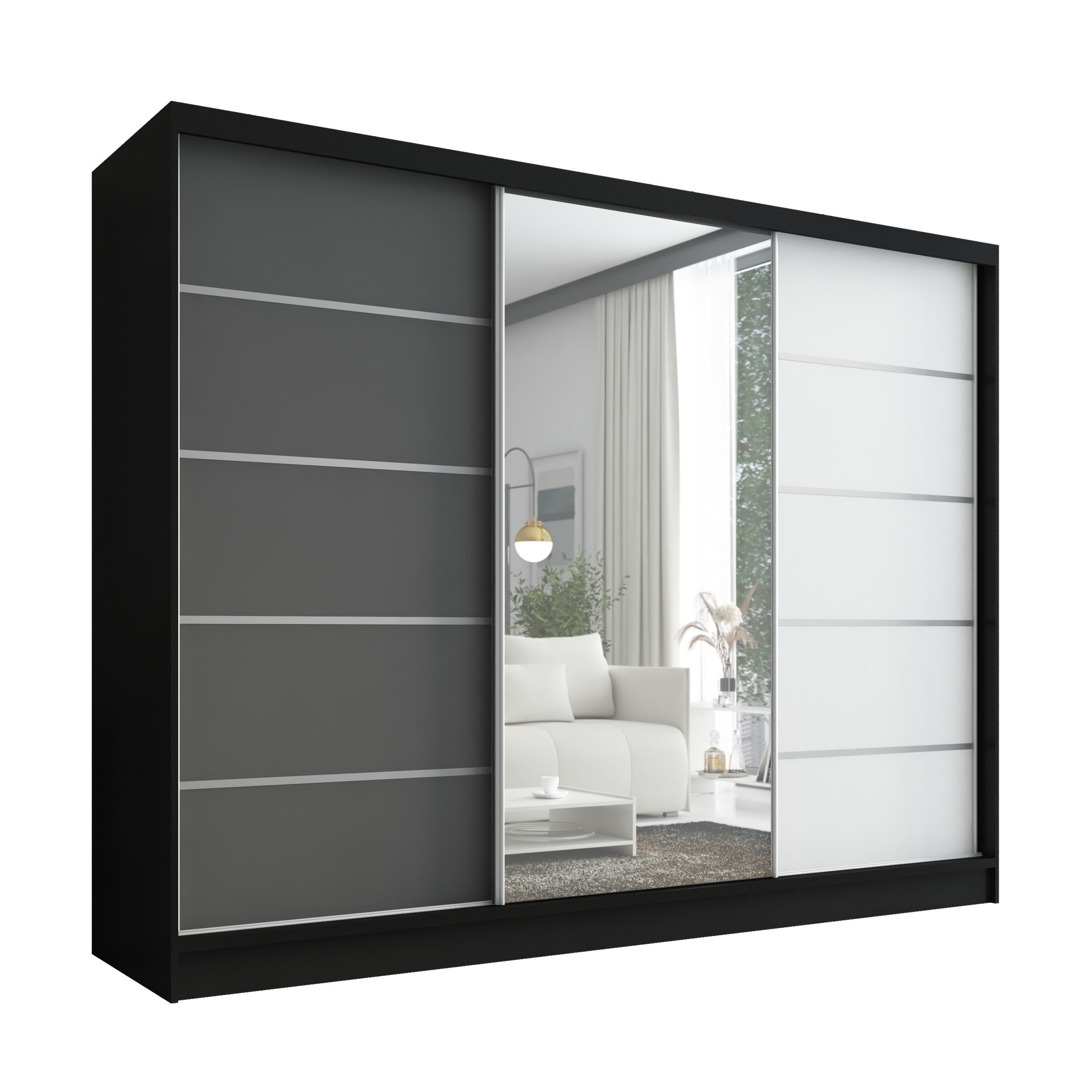 • 3 Türen und 1 Spiegel: Der Schrank ist mit drei geräumigen Türen ausgestattet, von denen eine mit einem großen Spiegel versehen ist. Dieser Spiegel vergrößert den Raum optisch und bietet gleichzeitig eine praktische Funktion.