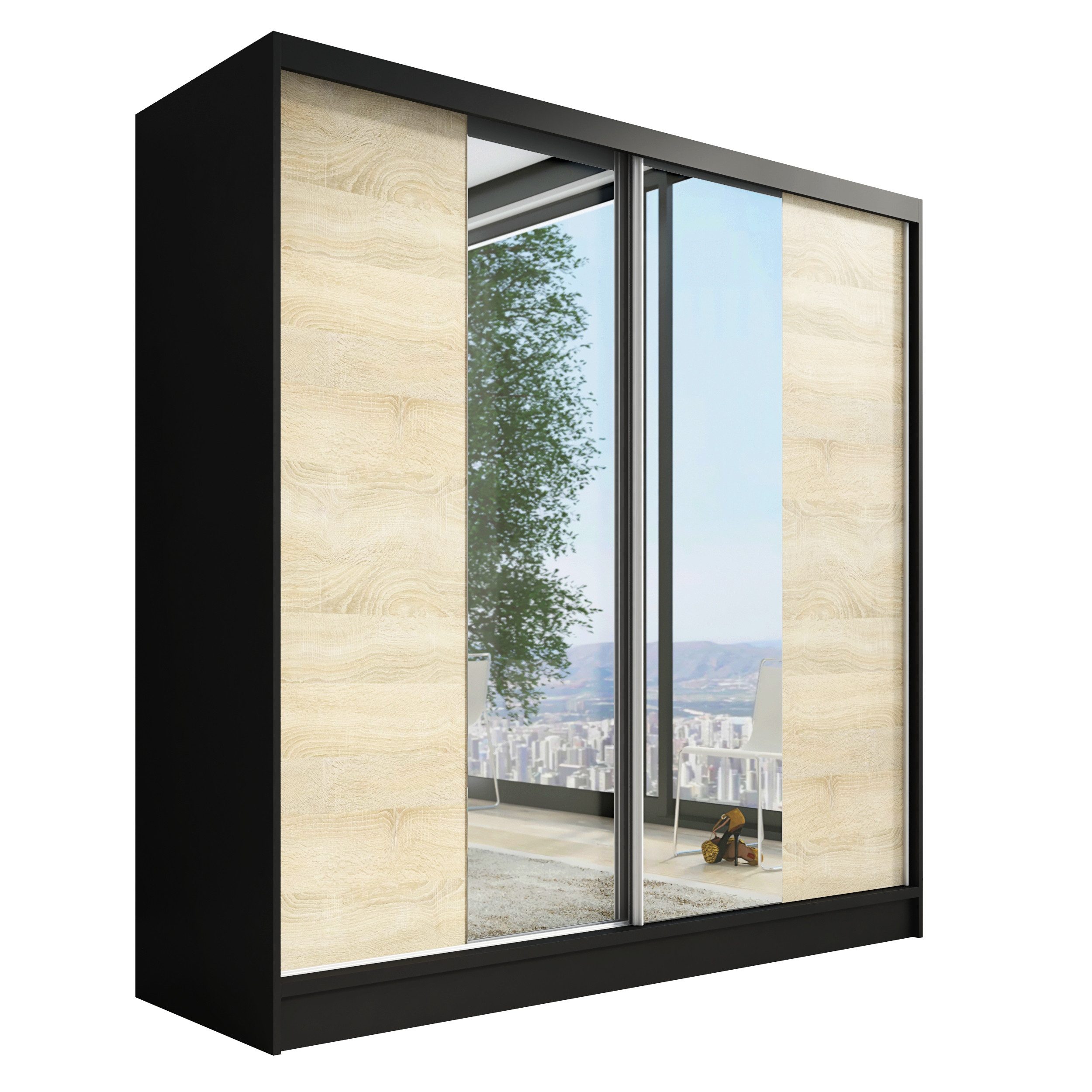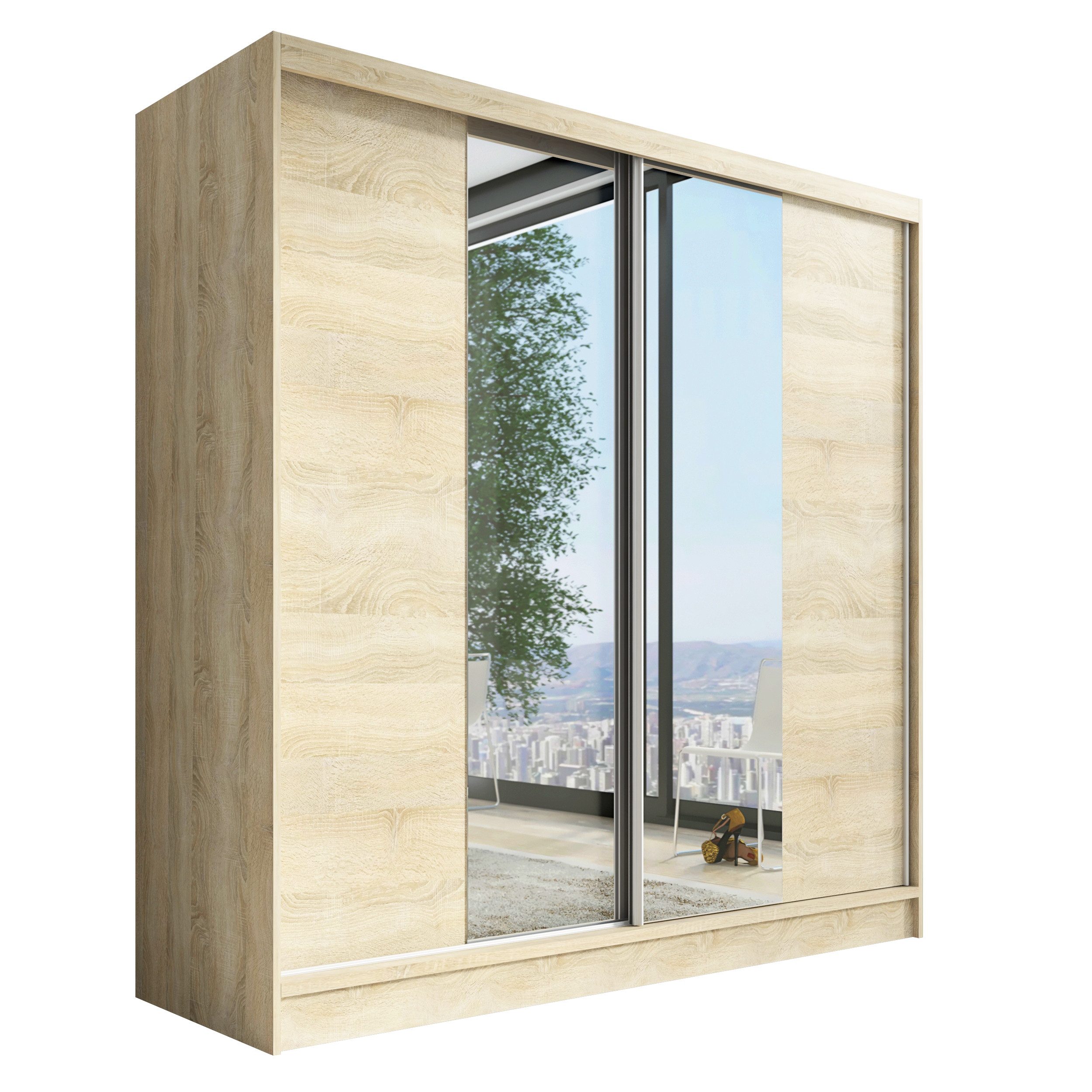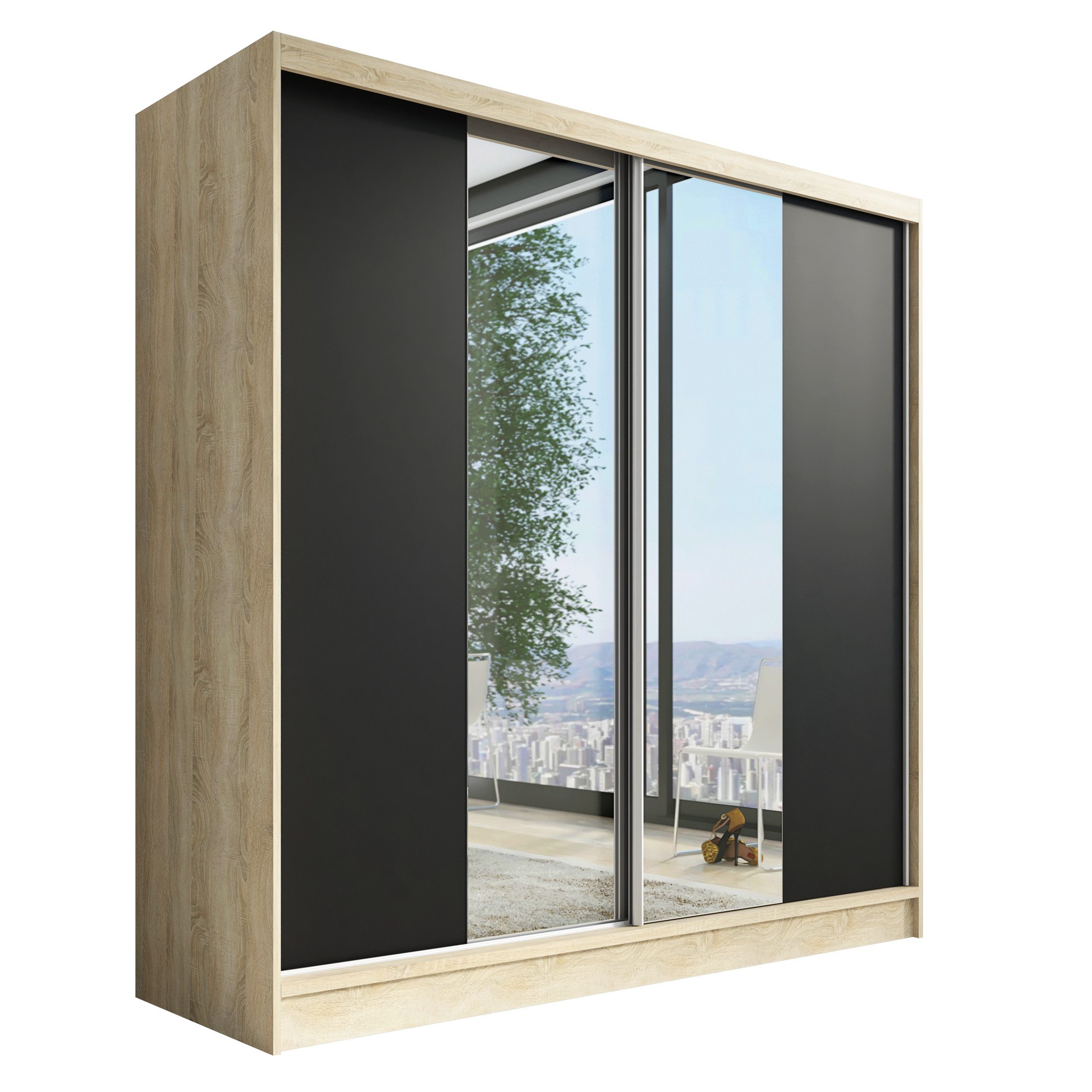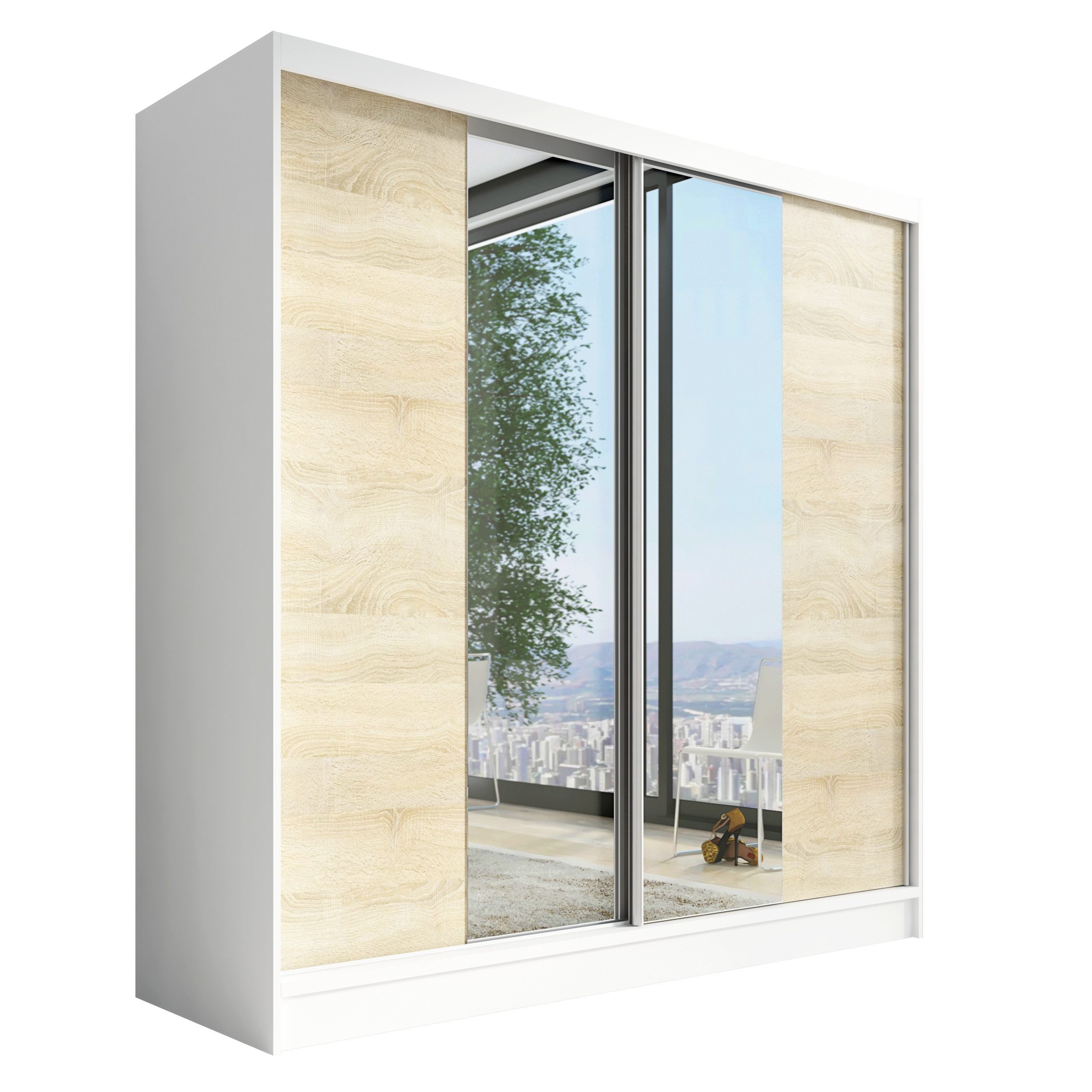 Der moderne 2-türige Kleiderschrank mit zwei Spiegeln ist die ideale Lösung für jedes Zuhause, das elegantes Design mit praktischer Funktionalität kombiniert. Der Schrank ist in drei verschiedenen Größen erhältlich (200 cm), sodass Sie das Modell auswählen können, das perfekt in Ihr Zimmer passt. Mit einer praktischen Kleiderstange und sechs Regalen bietet der Schrank ausreichend Platz für Ihre Kleidung und Accessoires. Die beiden Spiegel sorgen für praktische und stilvolle Ergänzungen, die den Raum optisch vergrößern.
