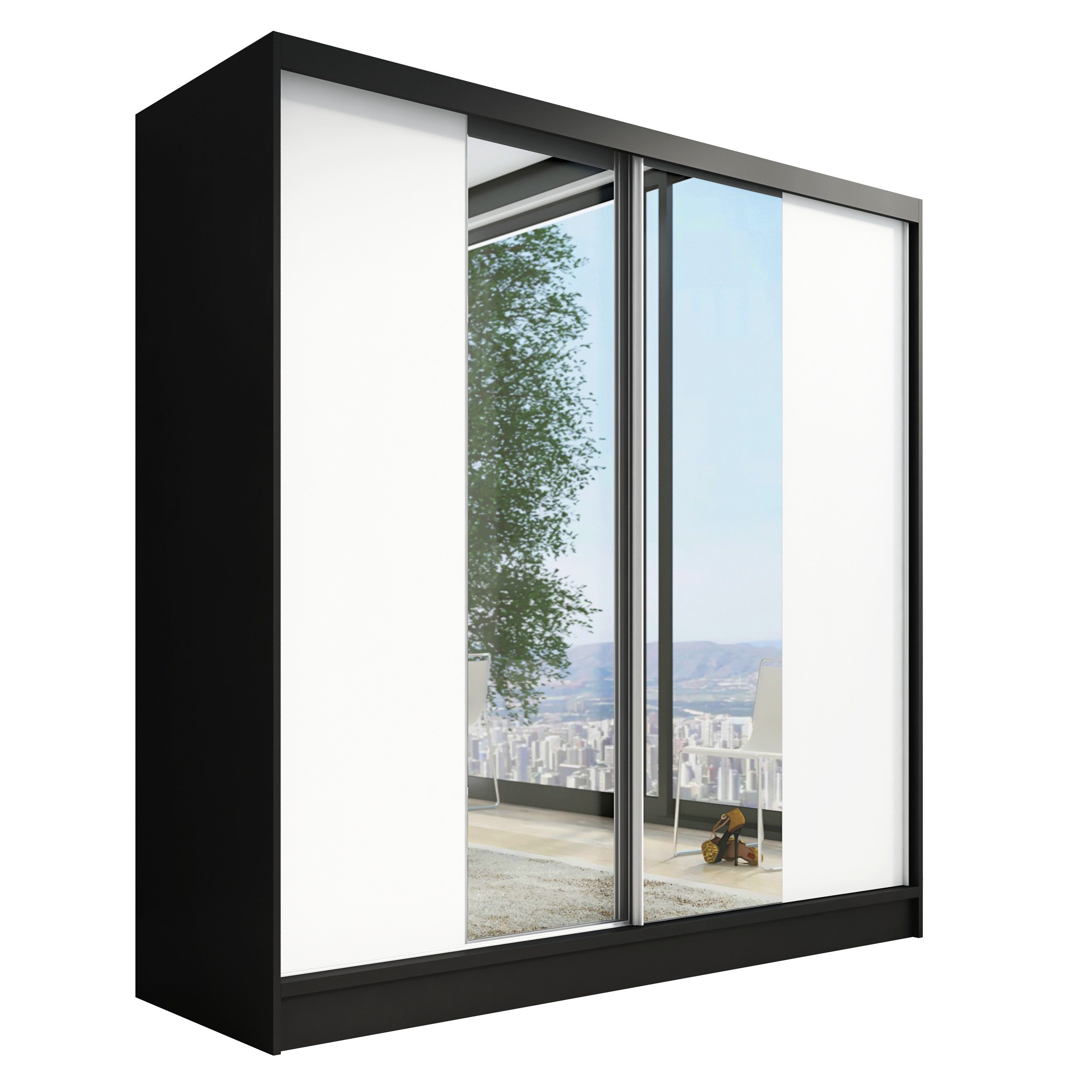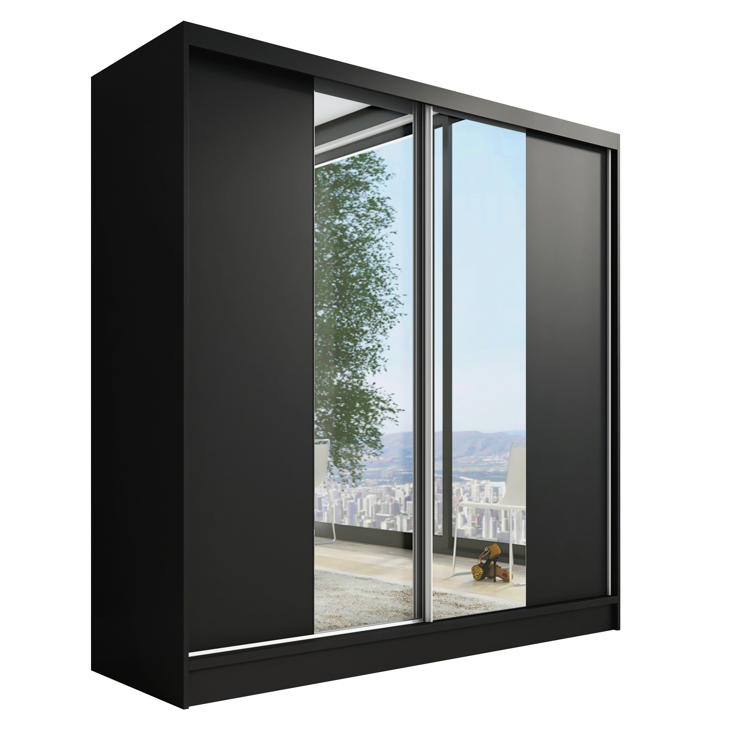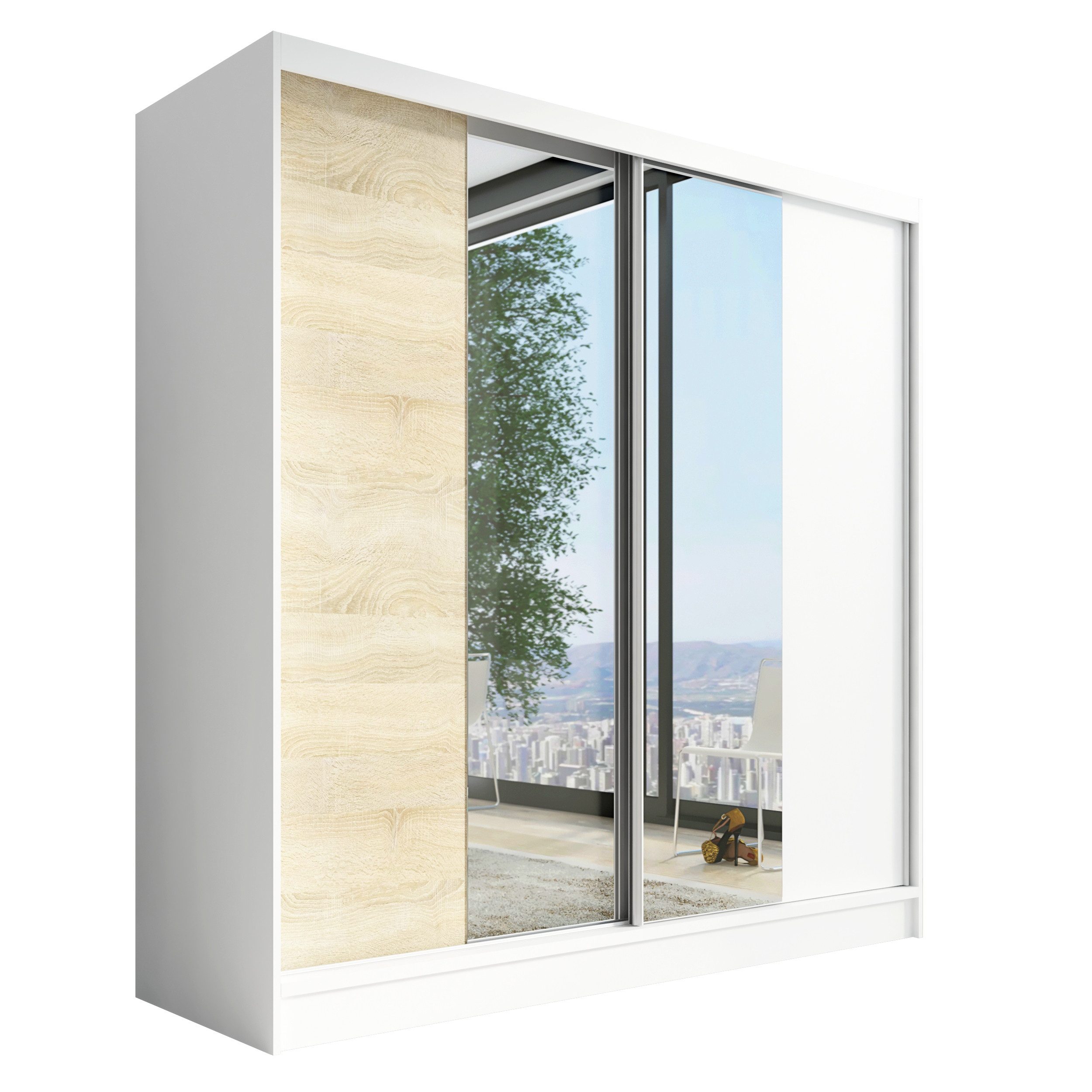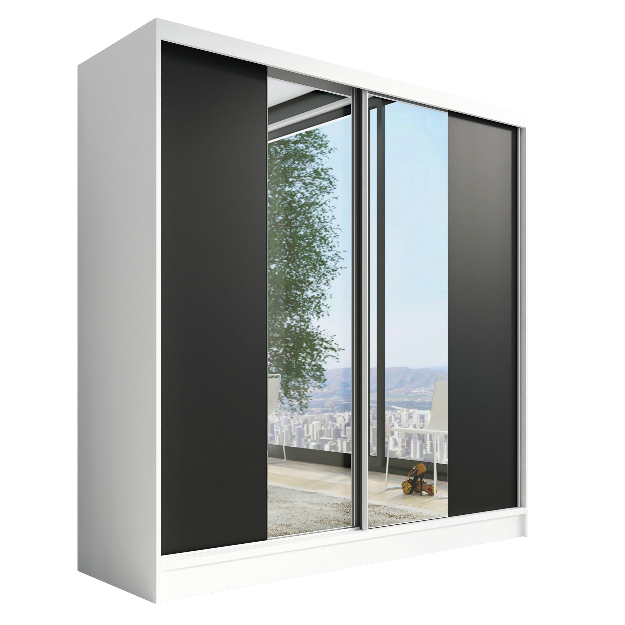 Der moderne 2-türige Kleiderschrank mit zwei Spiegeln ist die ideale Lösung für jedes Zuhause, das elegantes Design mit praktischer Funktionalität kombiniert. Der Schrank ist in drei verschiedenen Größen erhältlich (200 cm), sodass Sie das Modell auswählen können, das perfekt in Ihr Zimmer passt. Mit einer praktischen Kleiderstange und sechs Regalen bietet der Schrank ausreichend Platz für Ihre Kleidung und Accessoires. Die beiden Spiegel sorgen für praktische und stilvolle Ergänzungen, die den Raum optisch vergrößern.