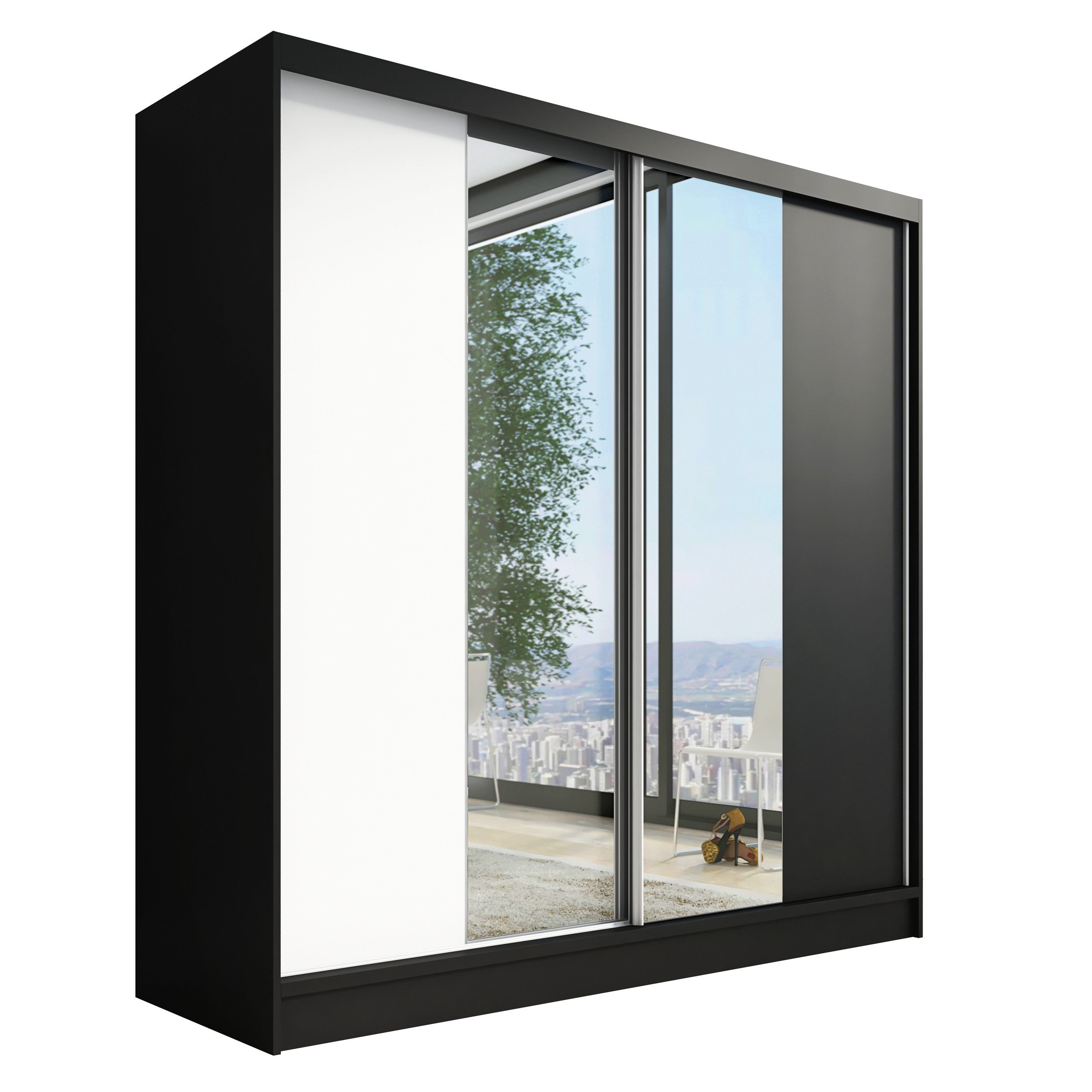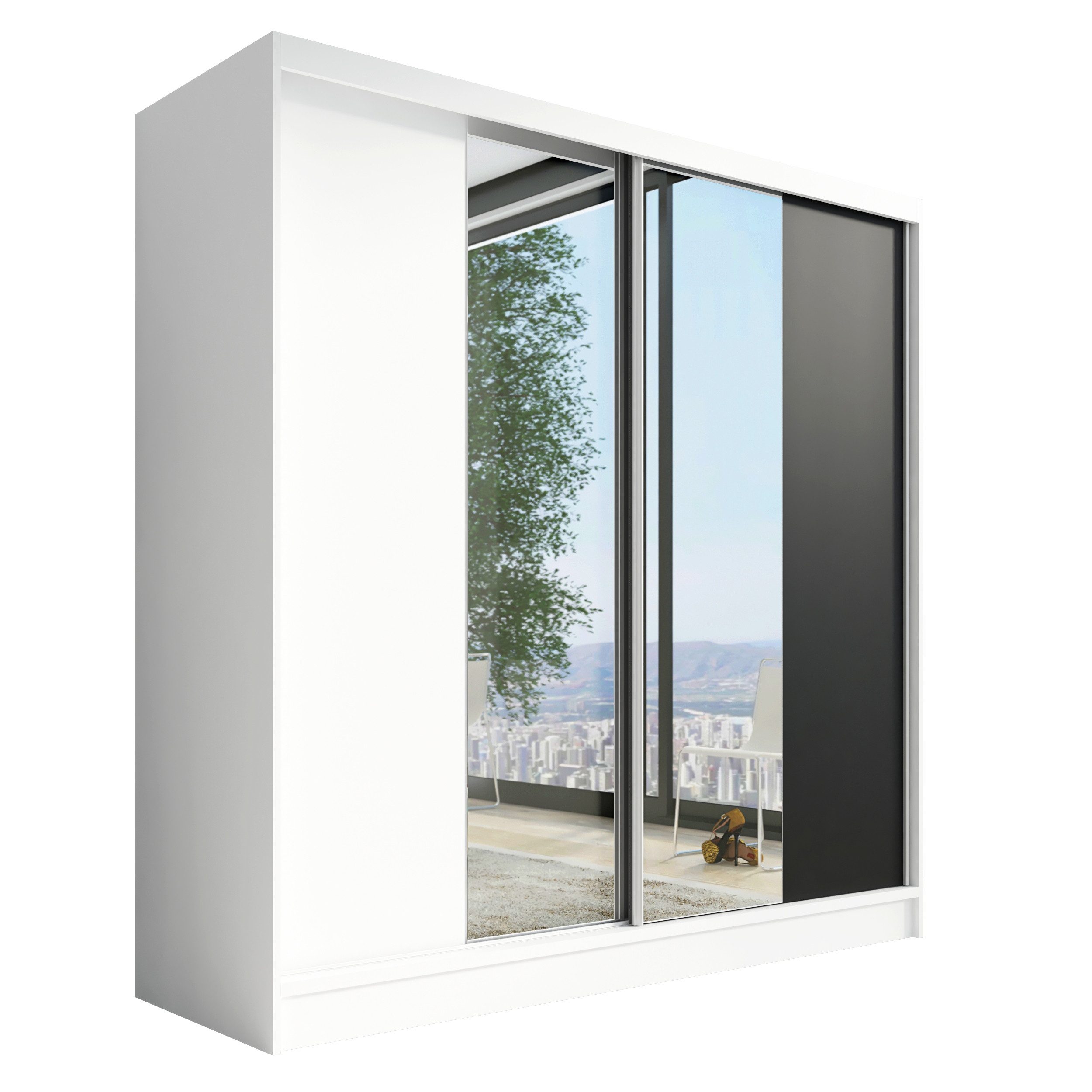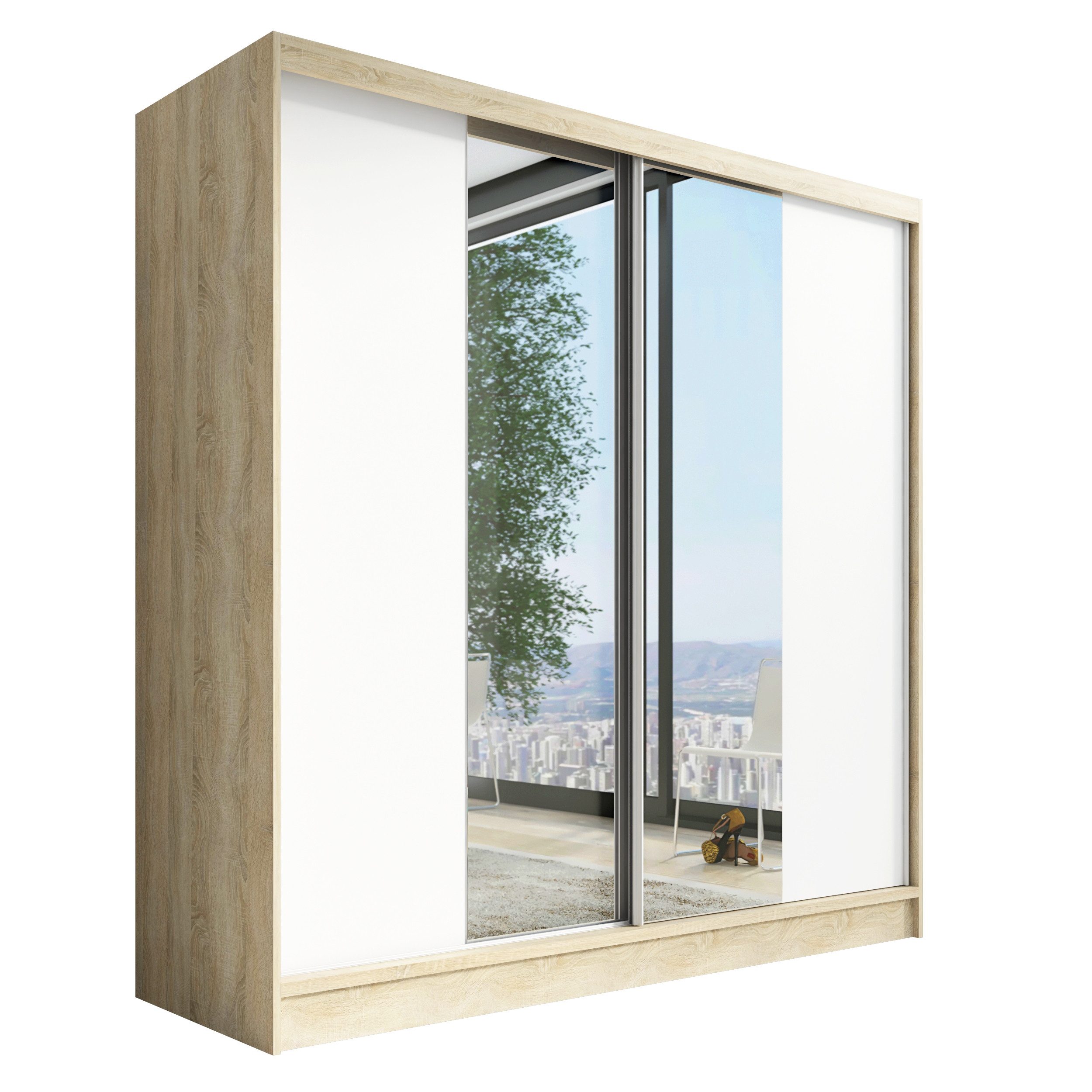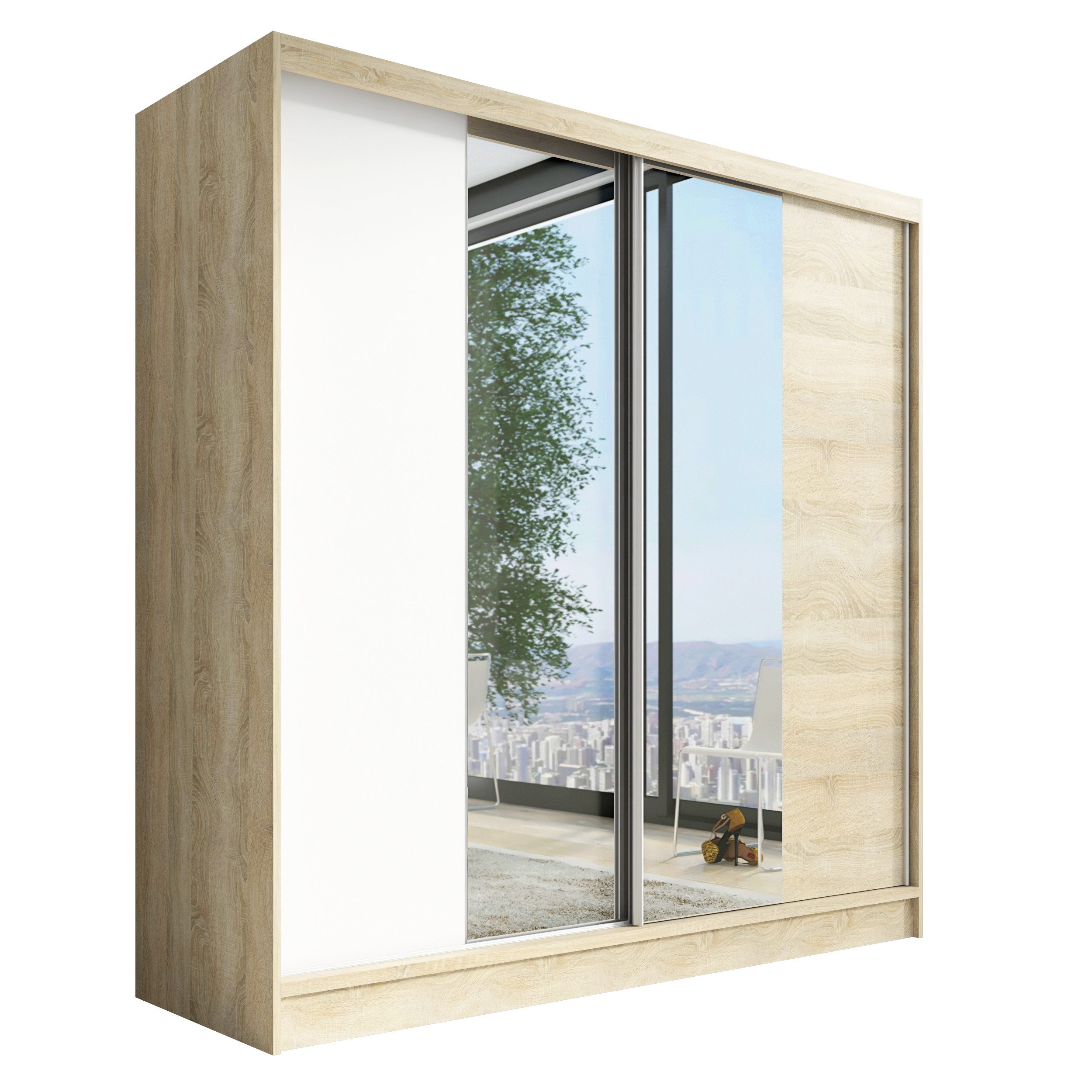 Der moderne 2-türige Kleiderschrank mit zwei Spiegeln ist die ideale Lösung für jedes Zuhause, das elegantes Design mit praktischer Funktionalität kombiniert. Der Schrank ist in drei verschiedenen Größen erhältlich (200 cm), sodass Sie das Modell auswählen können, das perfekt in Ihr Zimmer passt. Mit einer praktischen Kleiderstange und sechs Regalen bietet der Schrank ausreichend Platz für Ihre Kleidung und Accessoires. Die beiden Spiegel sorgen für praktische und stilvolle Ergänzungen, die den Raum optisch vergrößern.