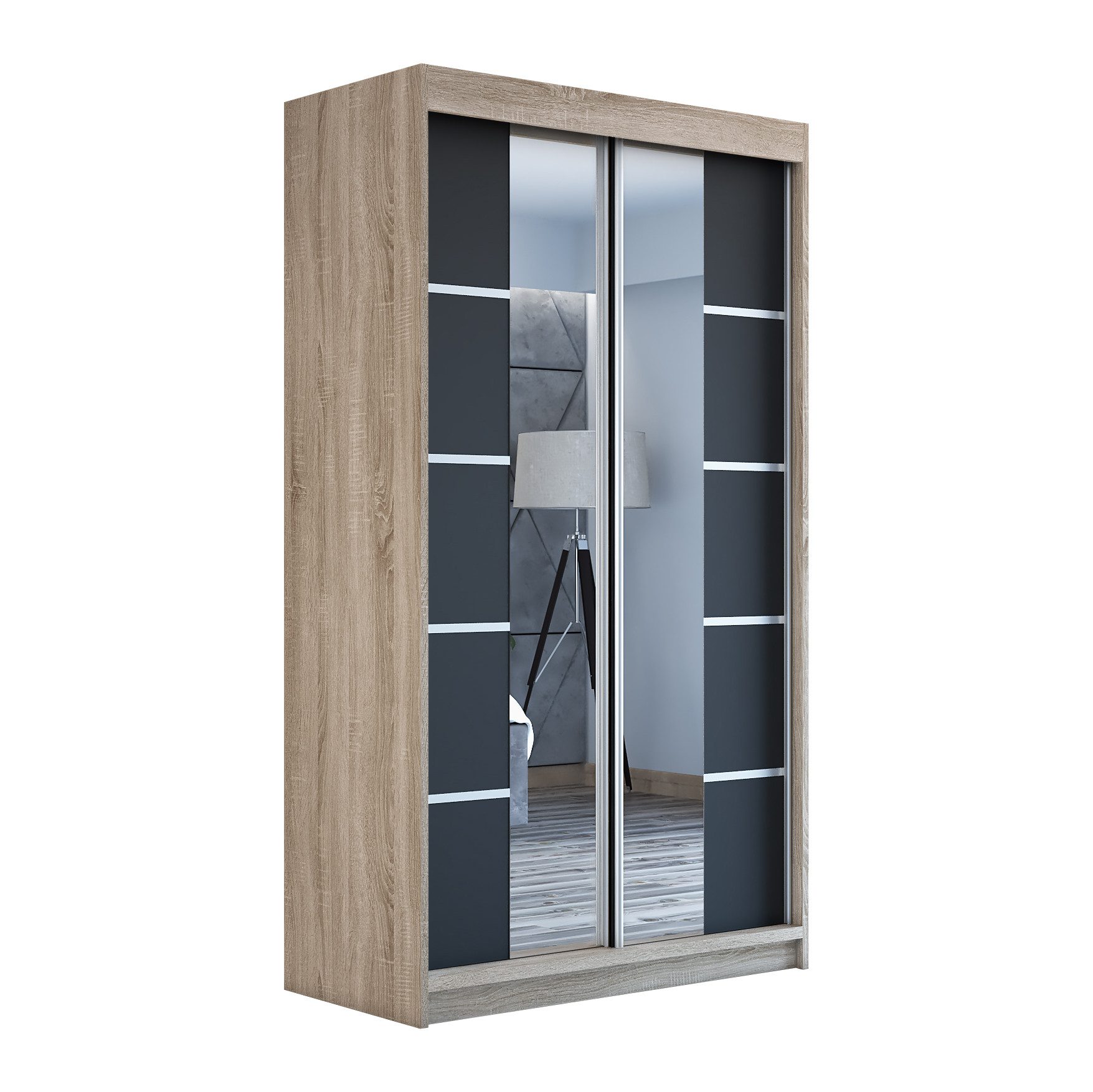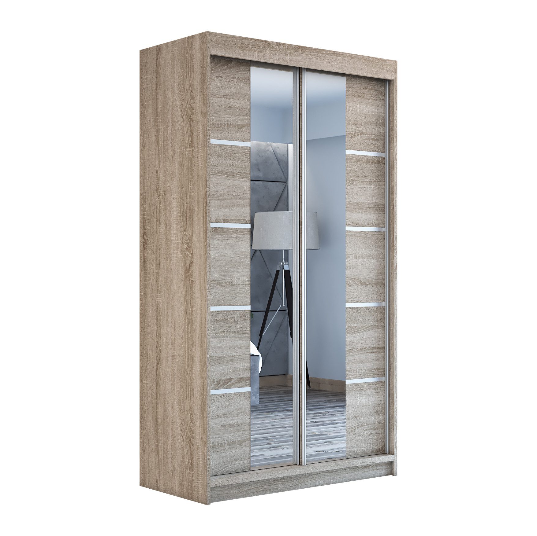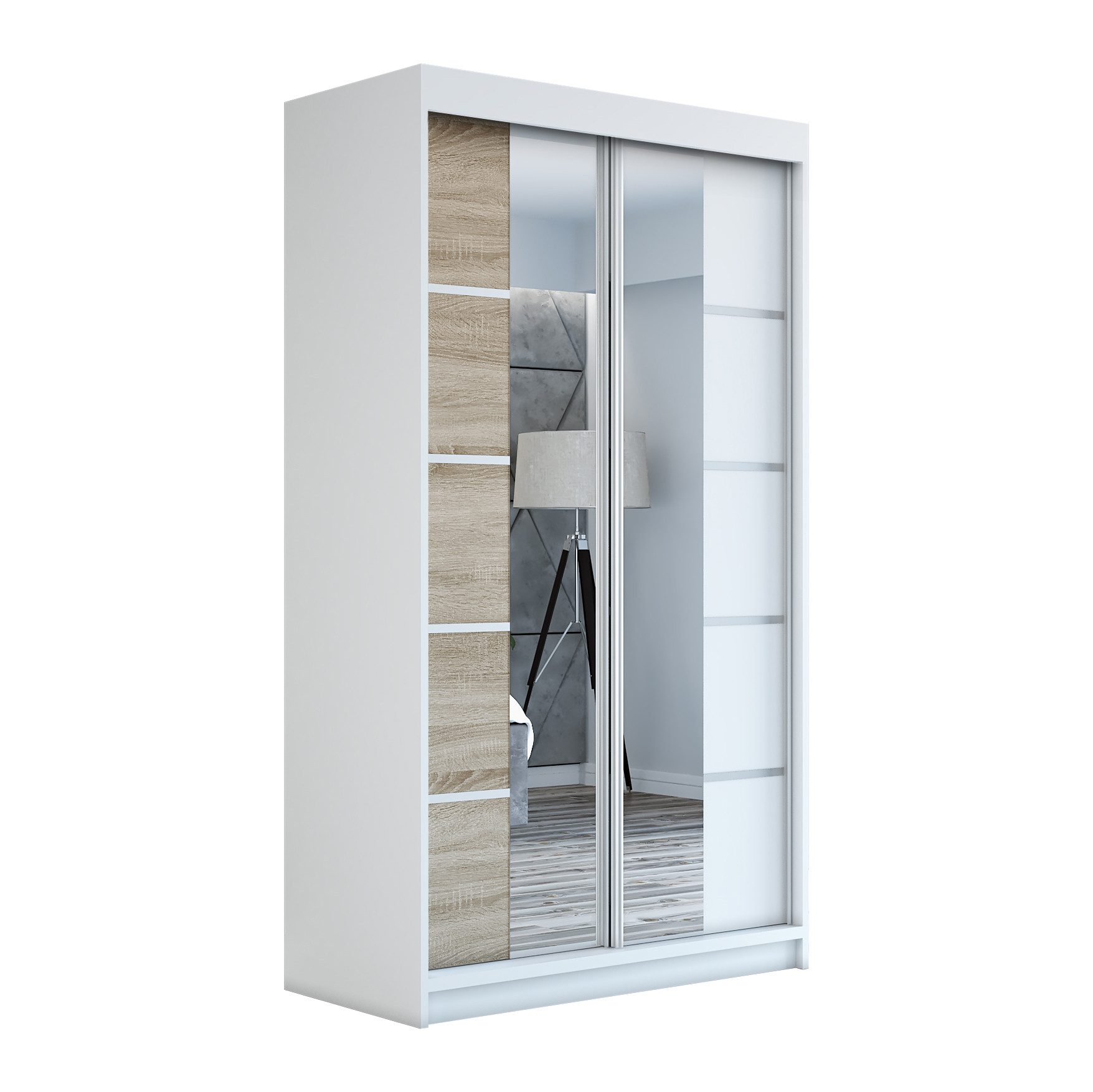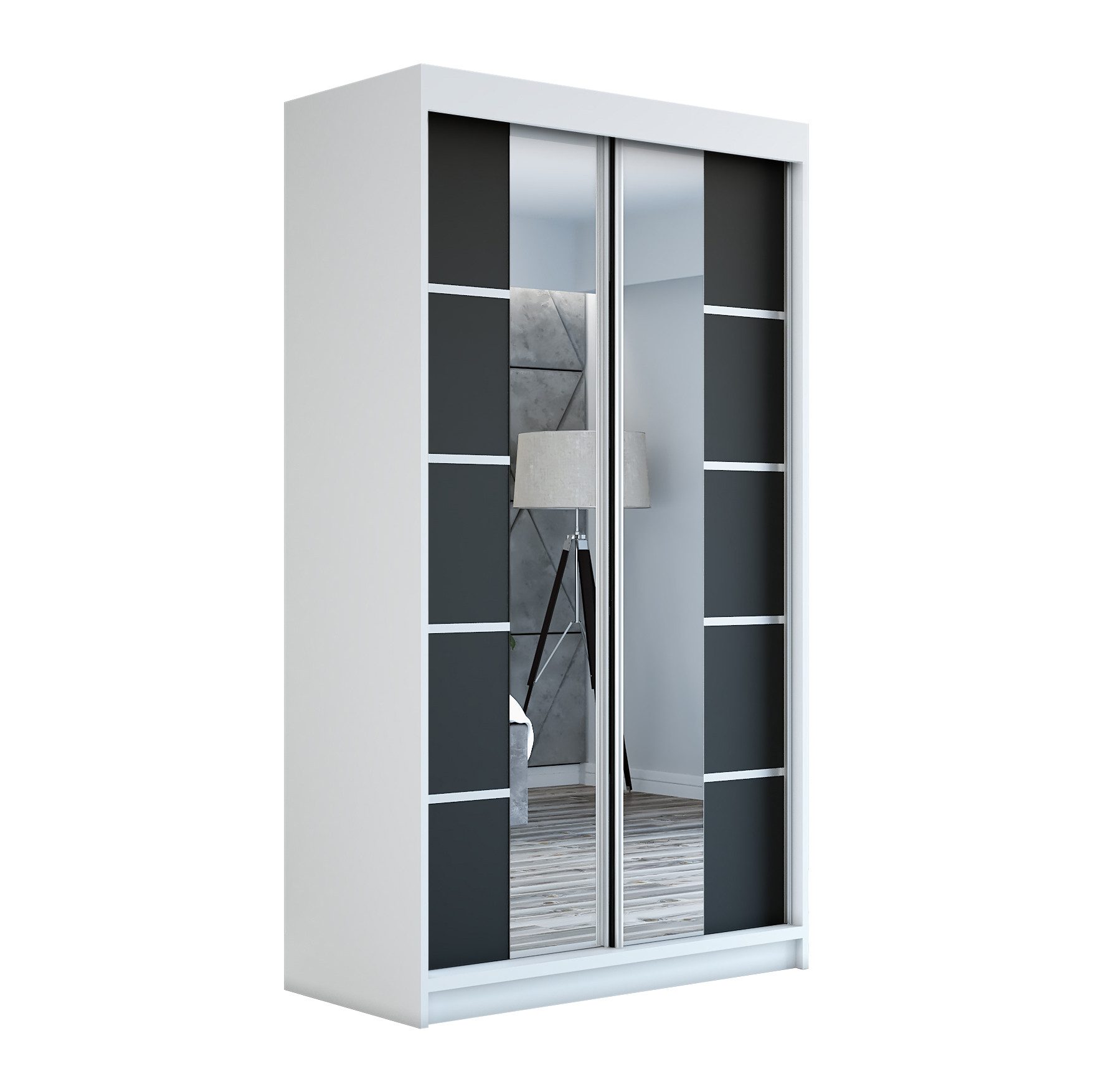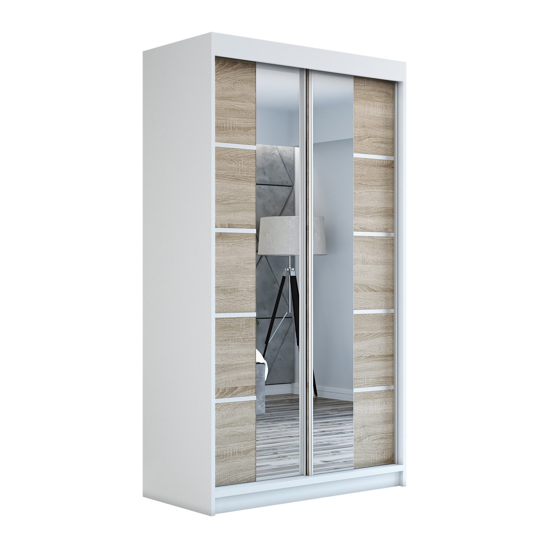 Der moderne 2-türige Kleiderschrank mit zwei Spiegeln ist die ideale Lösung für jedes Zuhause, das elegantes Design mit praktischer Funktionalität kombiniert. Der Schrank ist in drei verschiedenen Größen erhältlich (120 cm, 140 cm, 180 cm) sodass Sie das Modell auswählen können, das perfekt in Ihr Zimmer passt. Mit einer praktischen Kleiderstange und sechs Regalen bietet der Schrank ausreichend Platz für Ihre Kleidung und Accessoires. Die beiden Spiegel sorgen für praktische und stilvolle Ergänzungen, die den Raum optisch vergrößern.