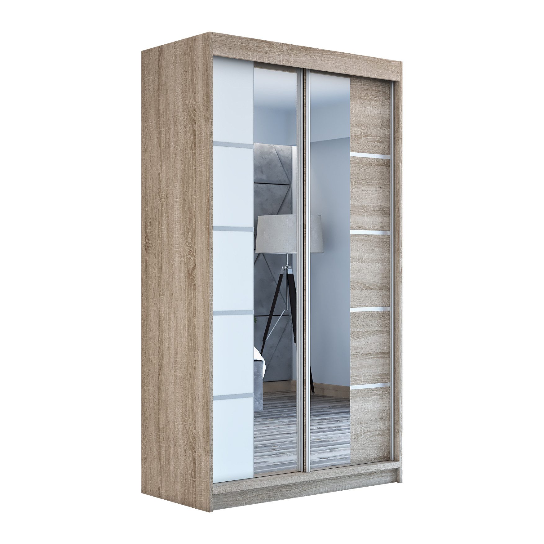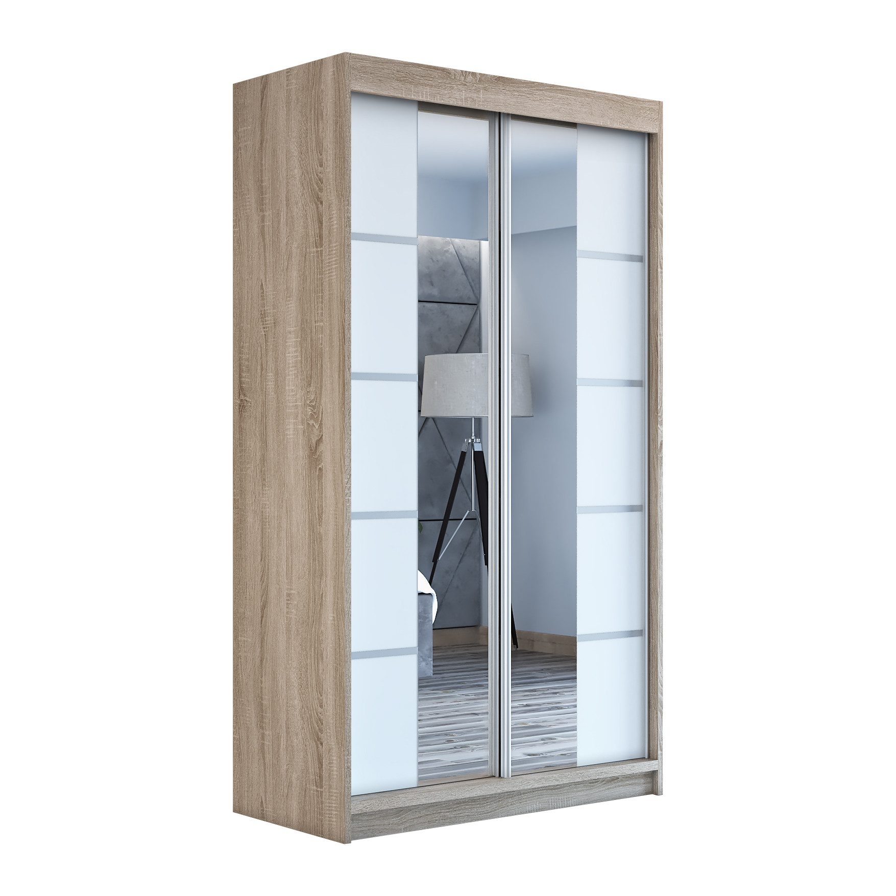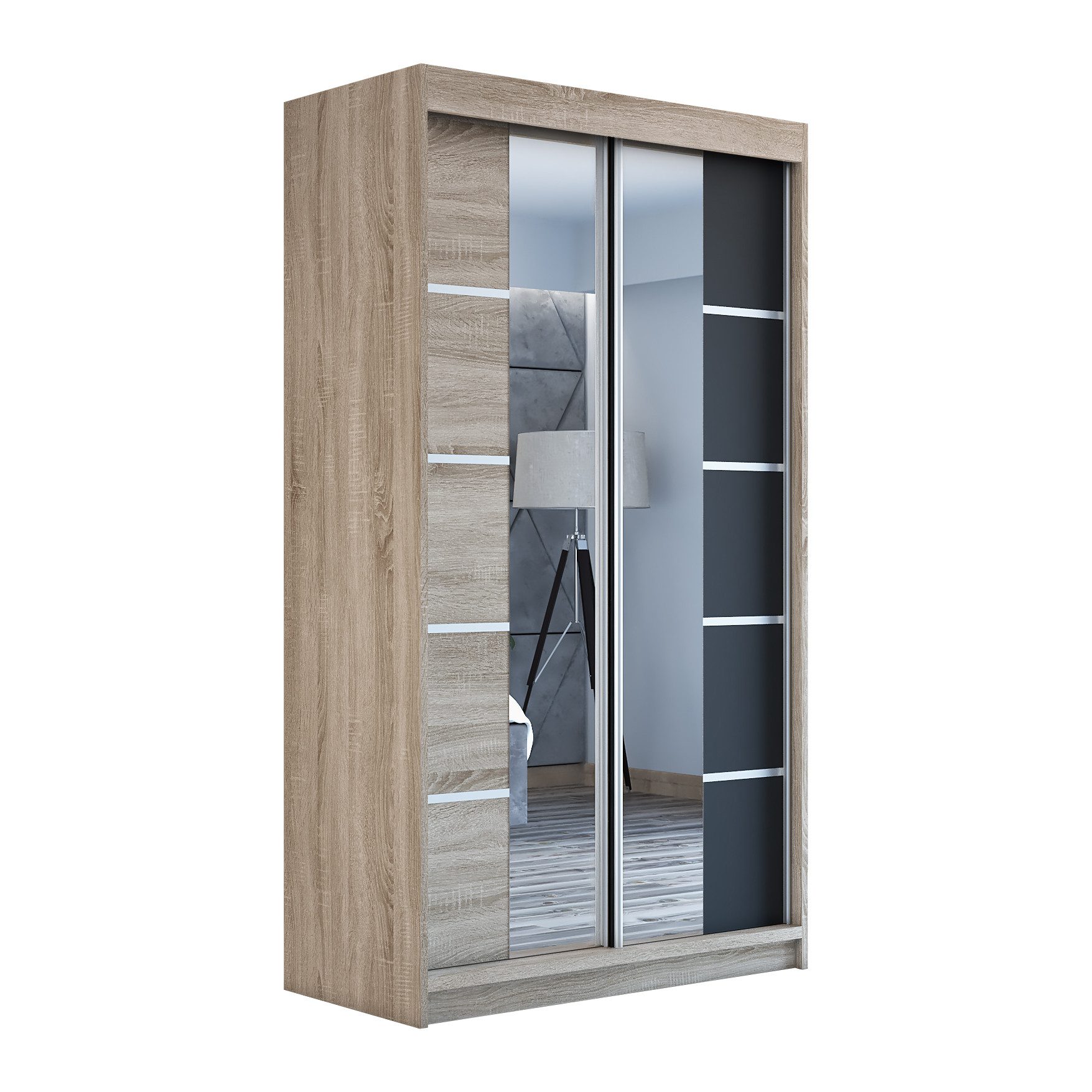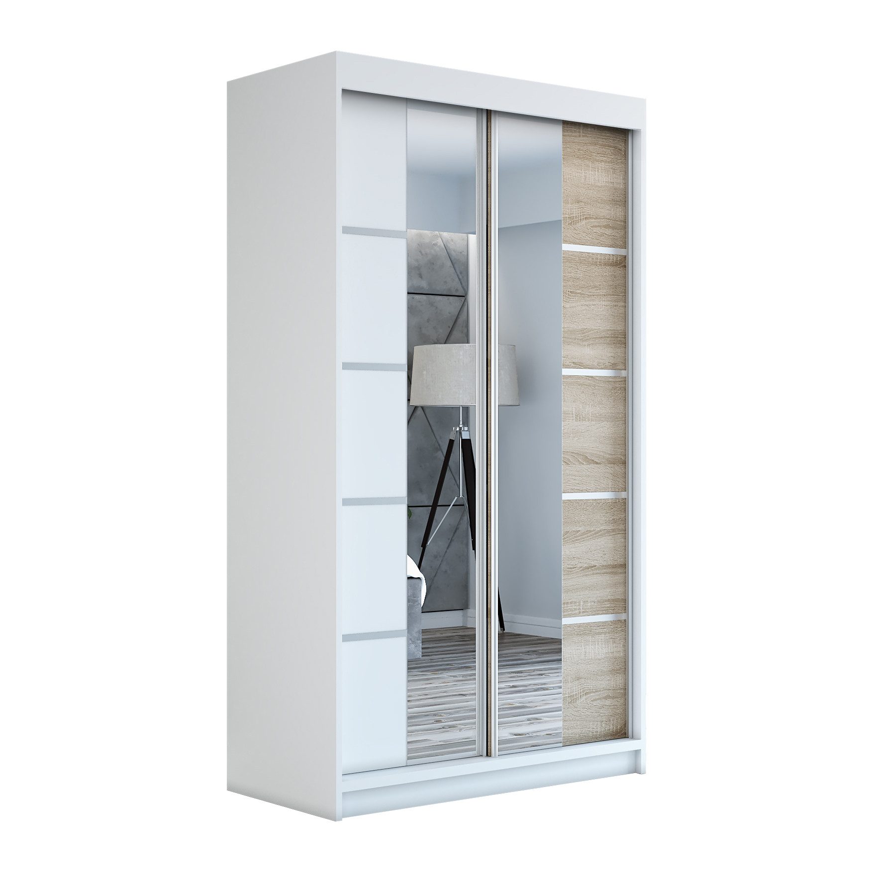 Der moderne 2-türige Kleiderschrank mit zwei Spiegeln ist die ideale Lösung für jedes Zuhause, das elegantes Design mit praktischer Funktionalität kombiniert. Der Schrank ist in drei verschiedenen Größen erhältlich (120 cm, 140 cm, 180 cm) sodass Sie das Modell auswählen können, das perfekt in Ihr Zimmer passt. Mit einer praktischen Kleiderstange und sechs Regalen bietet der Schrank ausreichend Platz für Ihre Kleidung und Accessoires. Die beiden Spiegel sorgen für praktische und stilvolle Ergänzungen, die den Raum optisch vergrößern.