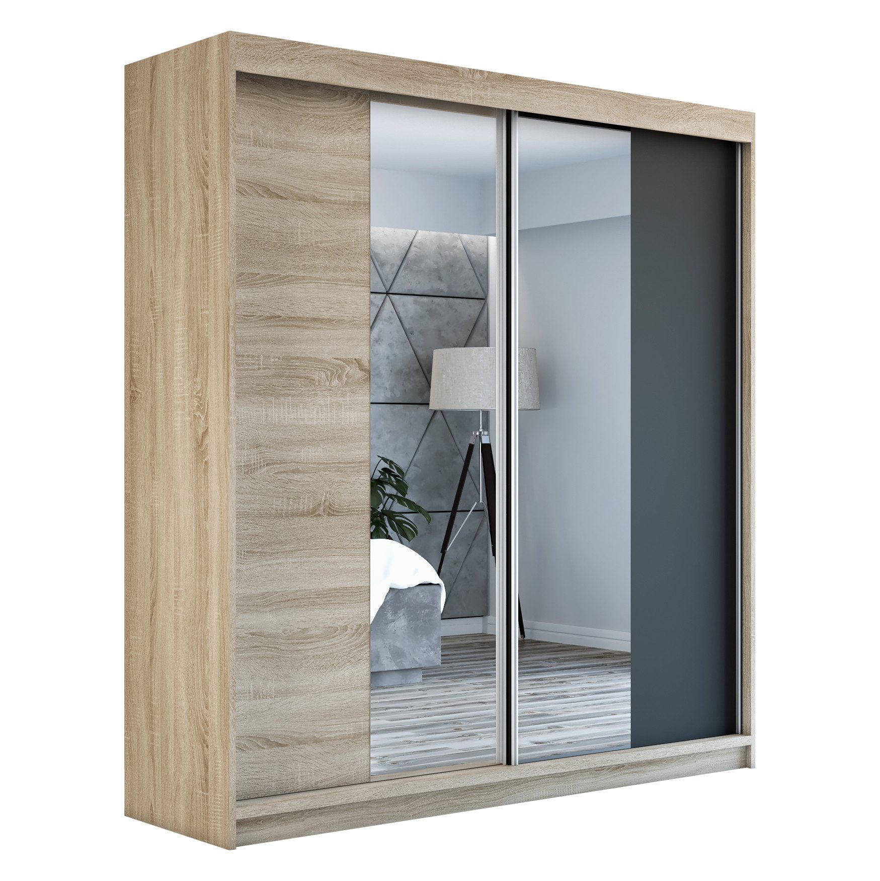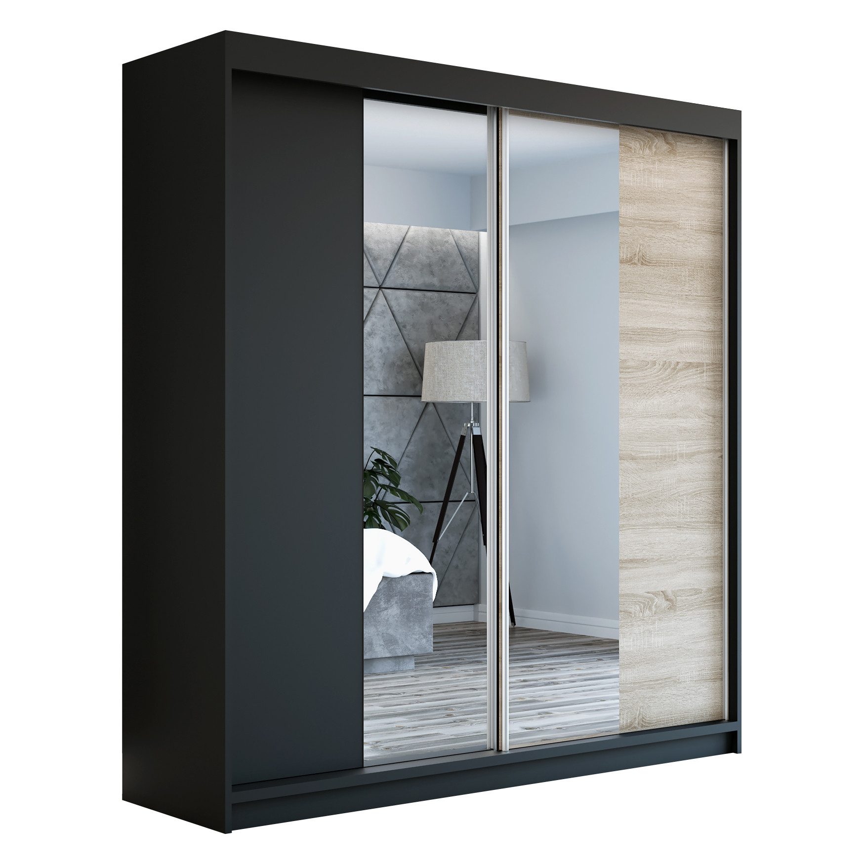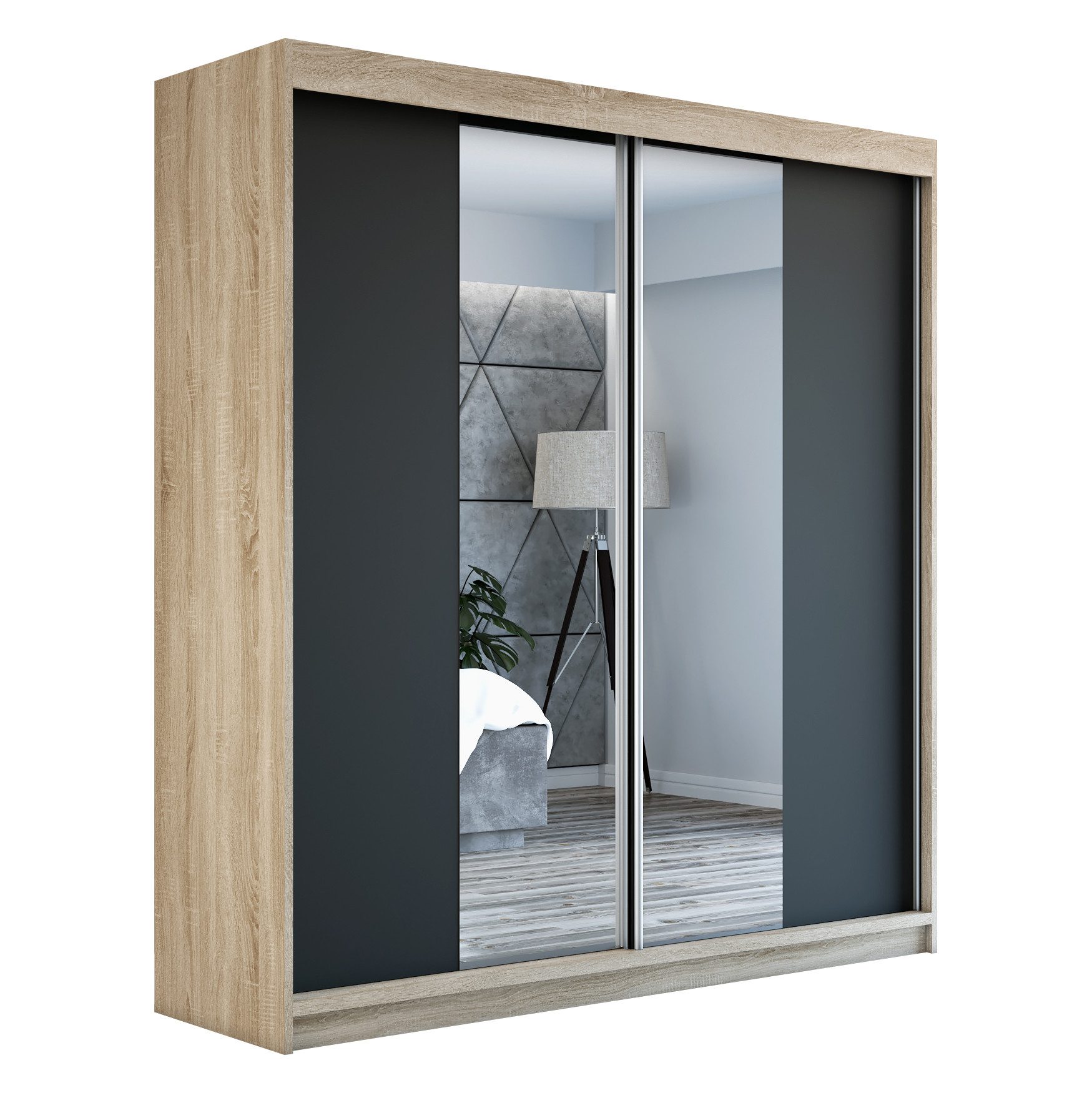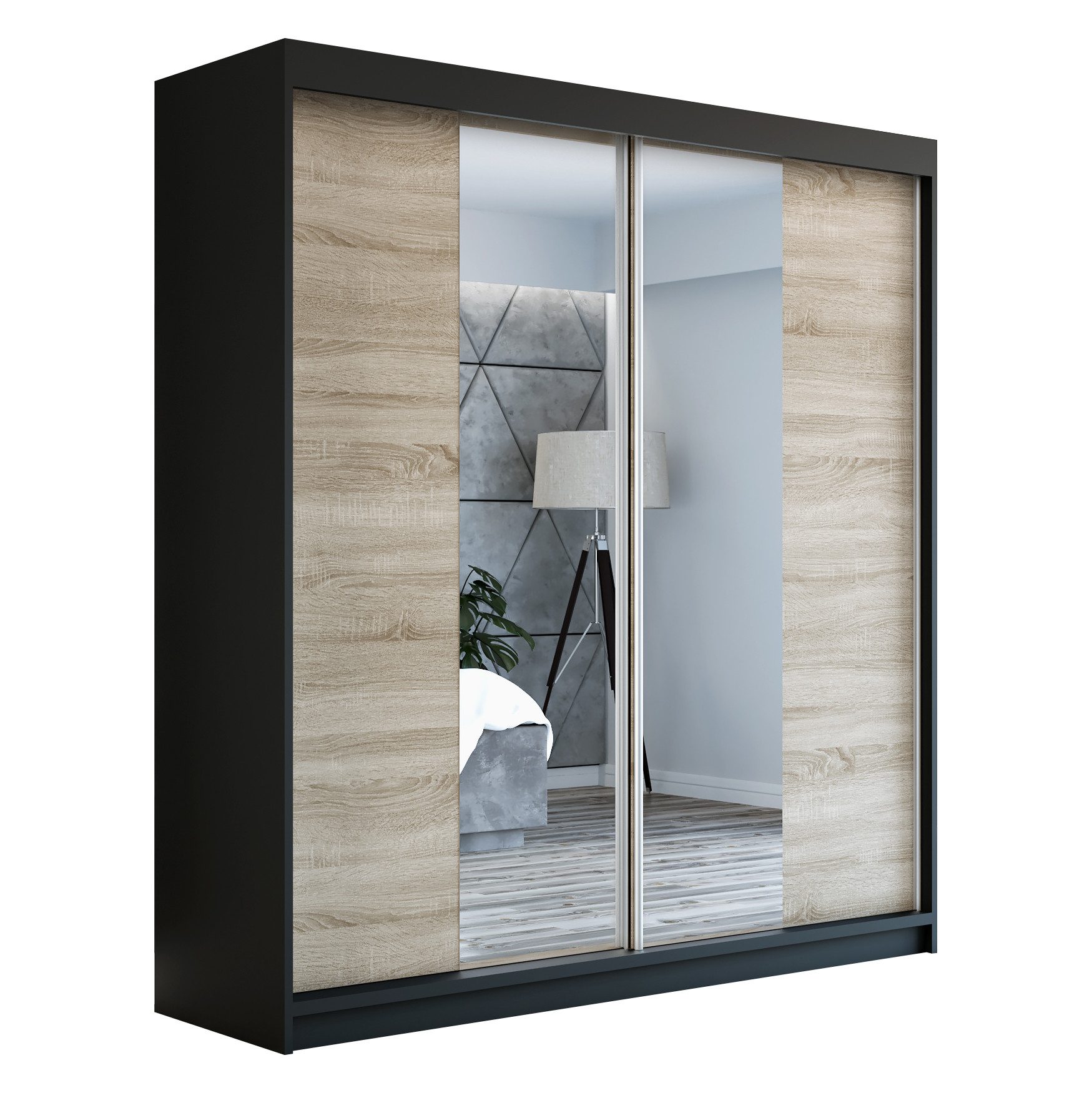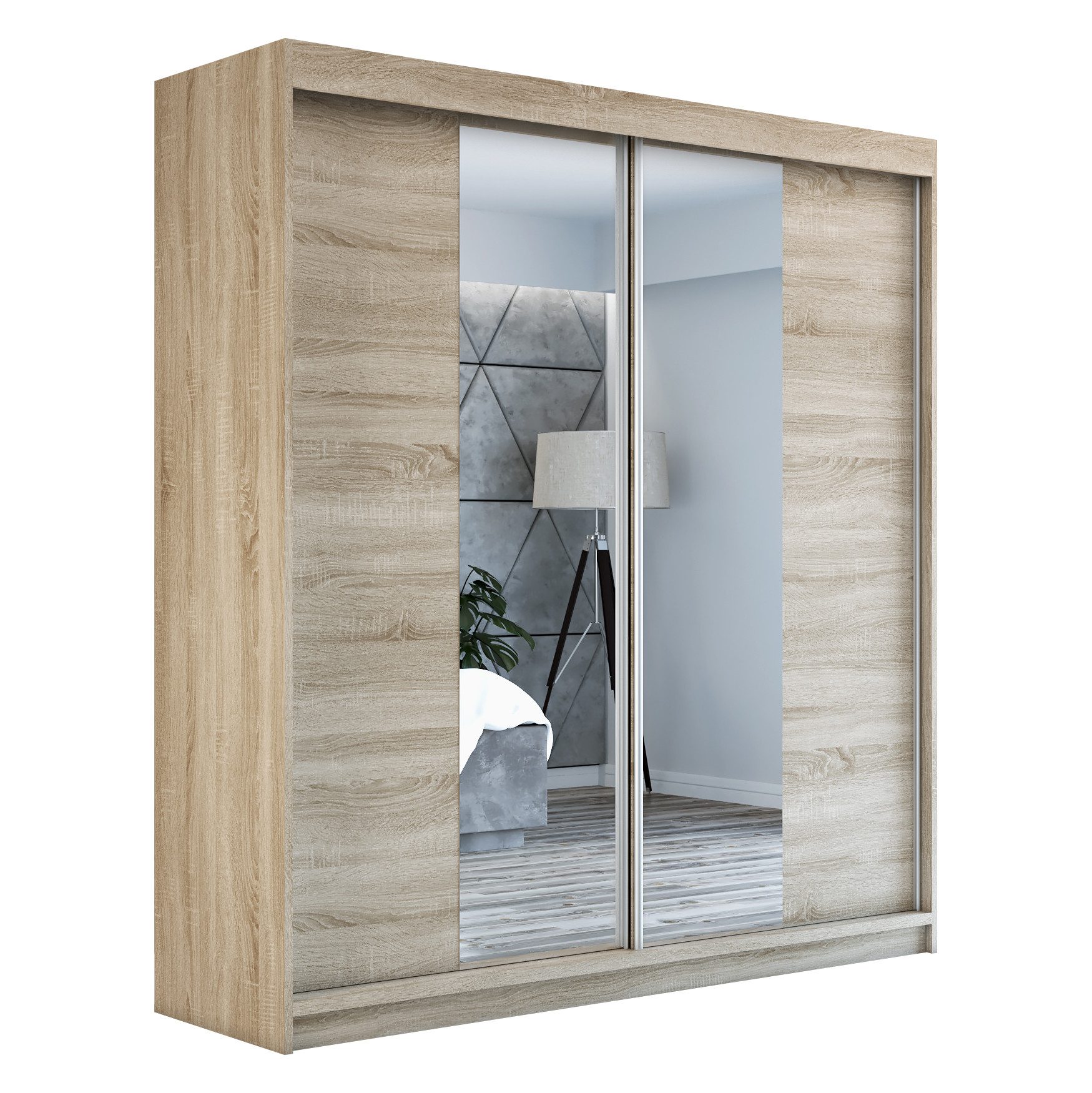 Der moderne 2-türige Kleiderschrank mit zwei Spiegeln ist die ideale Lösung für jedes Zuhause, das elegantes Design mit praktischer Funktionalität kombiniert. Der Schrank ist in drei verschiedenen Größen erhältlich 160 cm, sodass Sie das Modell auswählen können, das perfekt in Ihr Zimmer passt. Mit einer praktischen Kleiderstange und sechs Regalen bietet der Schrank ausreichend Platz für Ihre Kleidung und Accessoires. Die beiden Spiegel sorgen für praktische und stilvolle Ergänzungen, die den Raum optisch vergrößern.