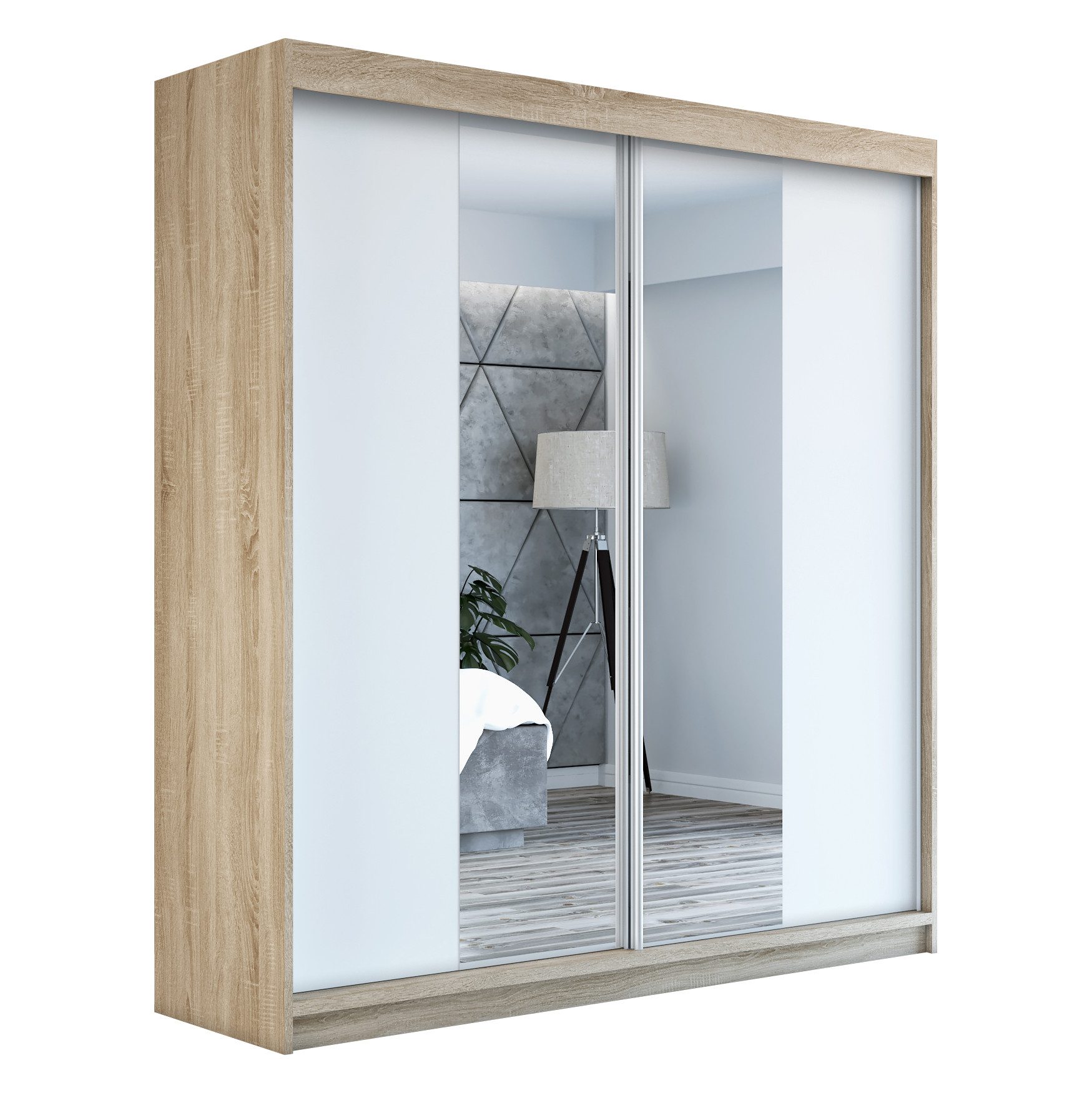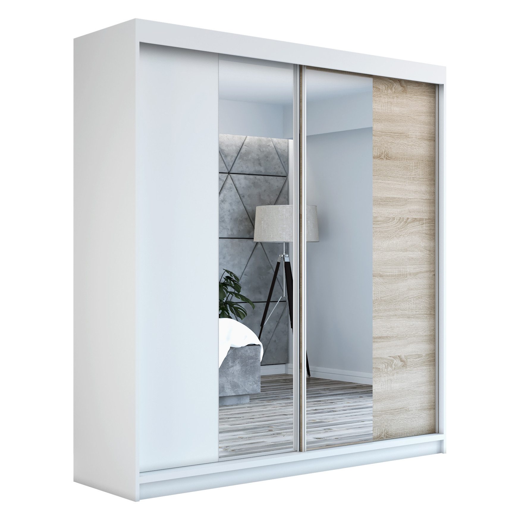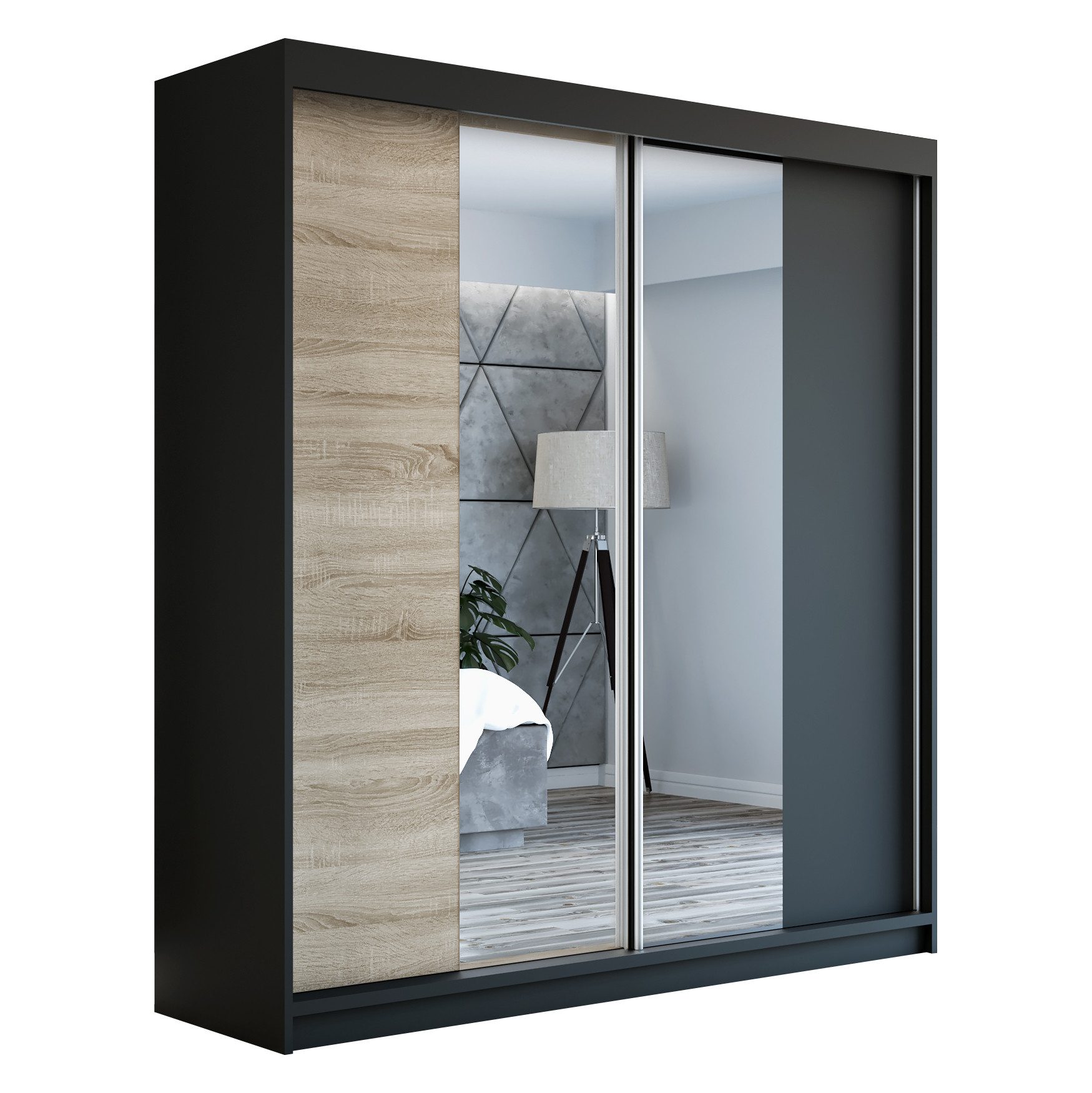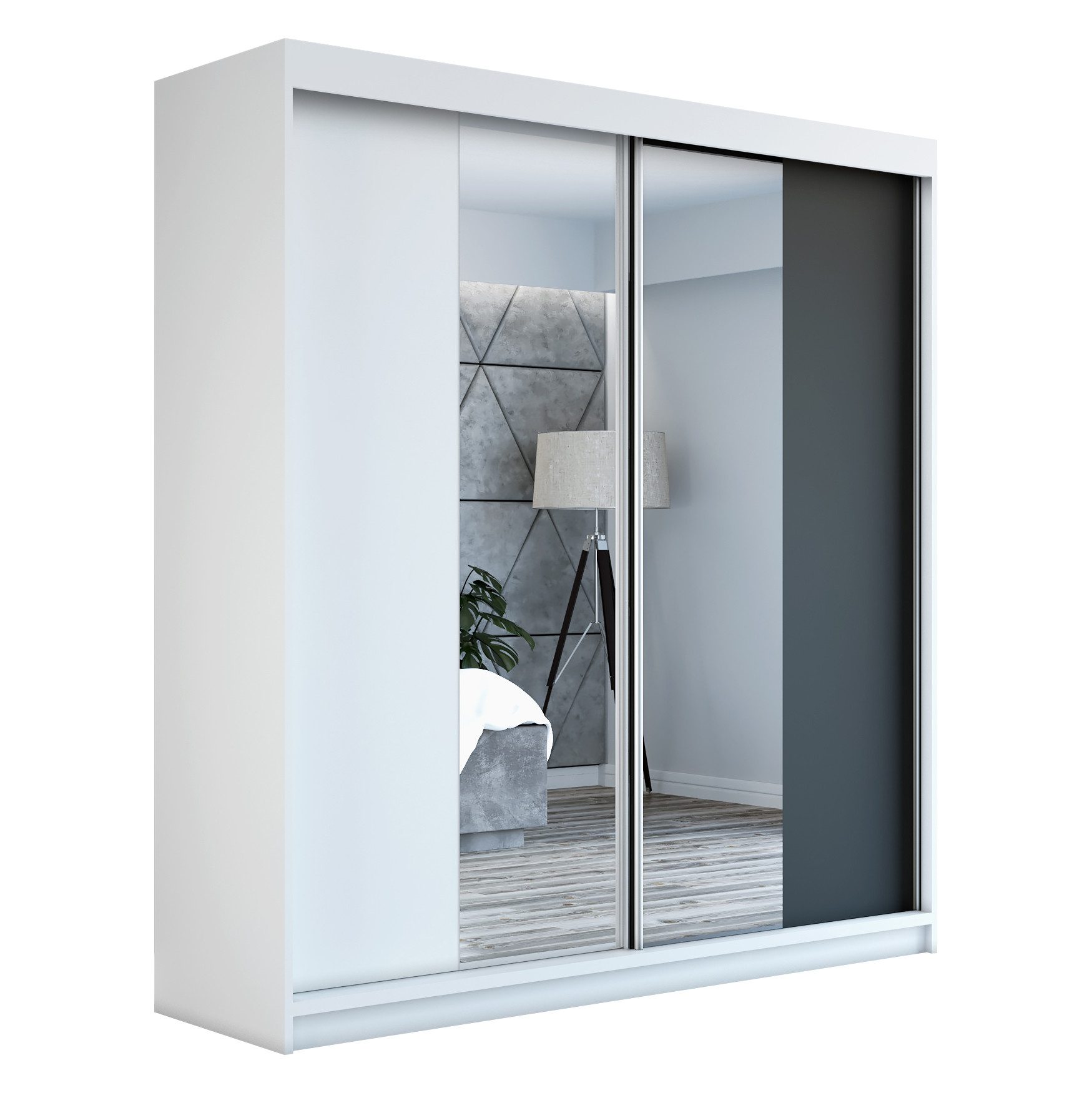 Der moderne 2-türige Kleiderschrank mit zwei Spiegeln ist die ideale Lösung für jedes Zuhause, das elegantes Design mit praktischer Funktionalität kombiniert. Der Schrank ist in drei verschiedenen Größen erhältlich 160 cm, sodass Sie das Modell auswählen können, das perfekt in Ihr Zimmer passt. Mit einer praktischen Kleiderstange und sechs Regalen bietet der Schrank ausreichend Platz für Ihre Kleidung und Accessoires. Die beiden Spiegel sorgen für praktische und stilvolle Ergänzungen, die den Raum optisch vergrößern.
