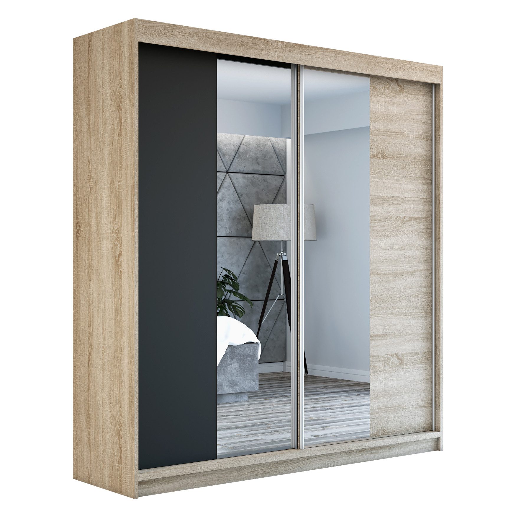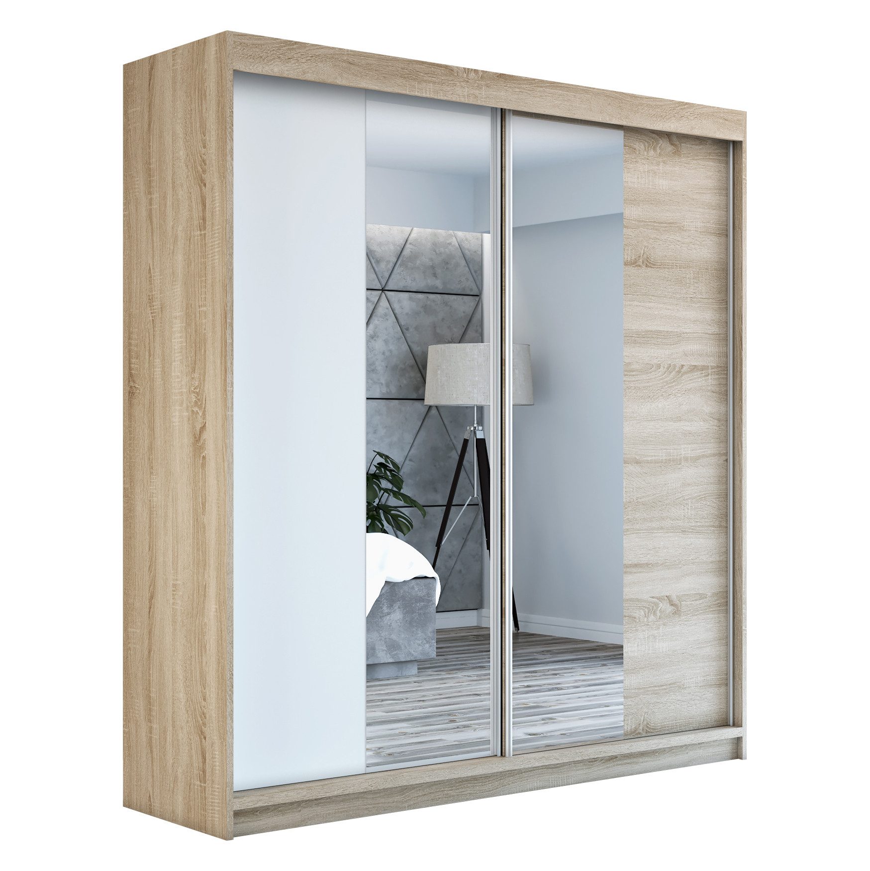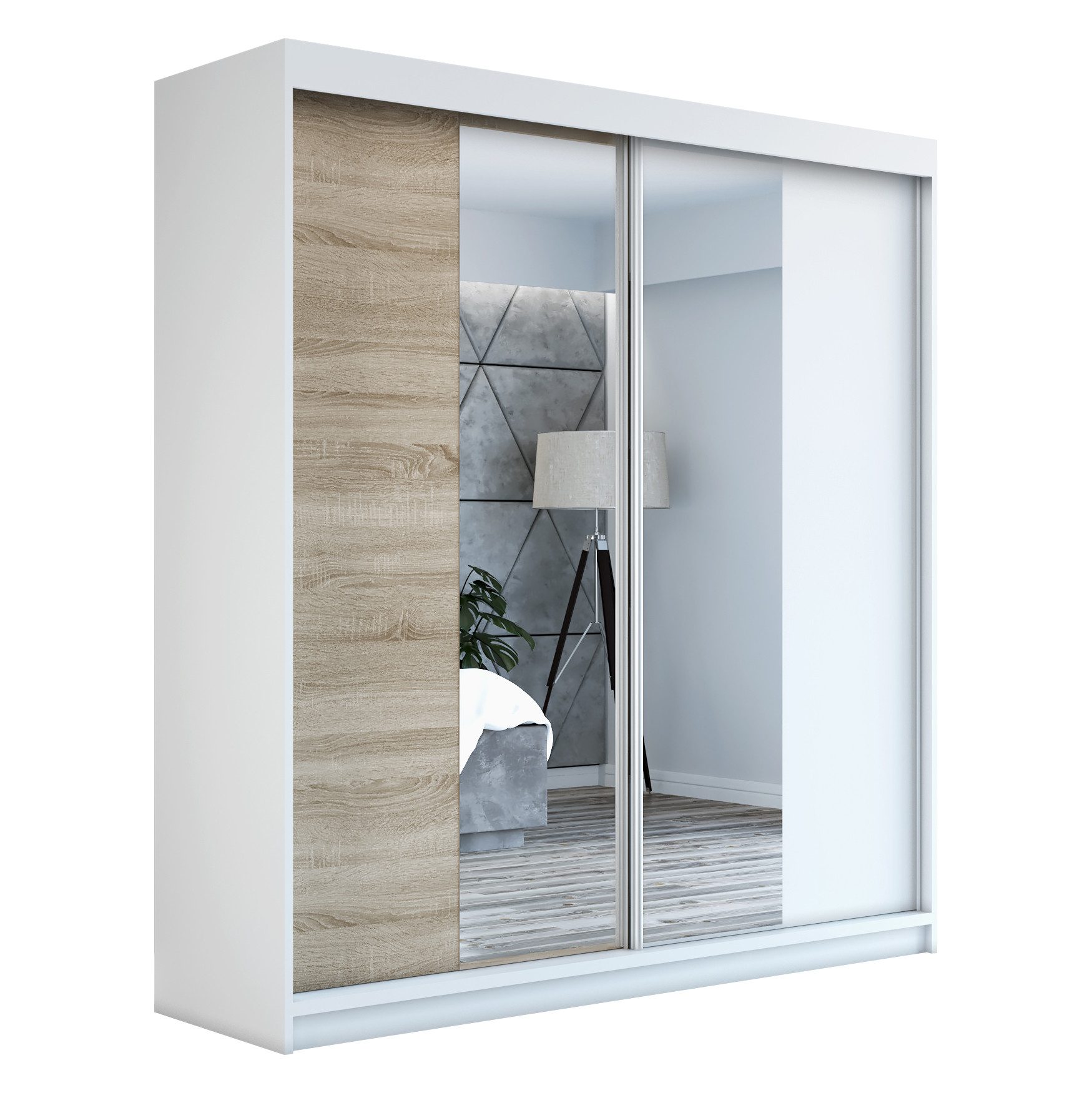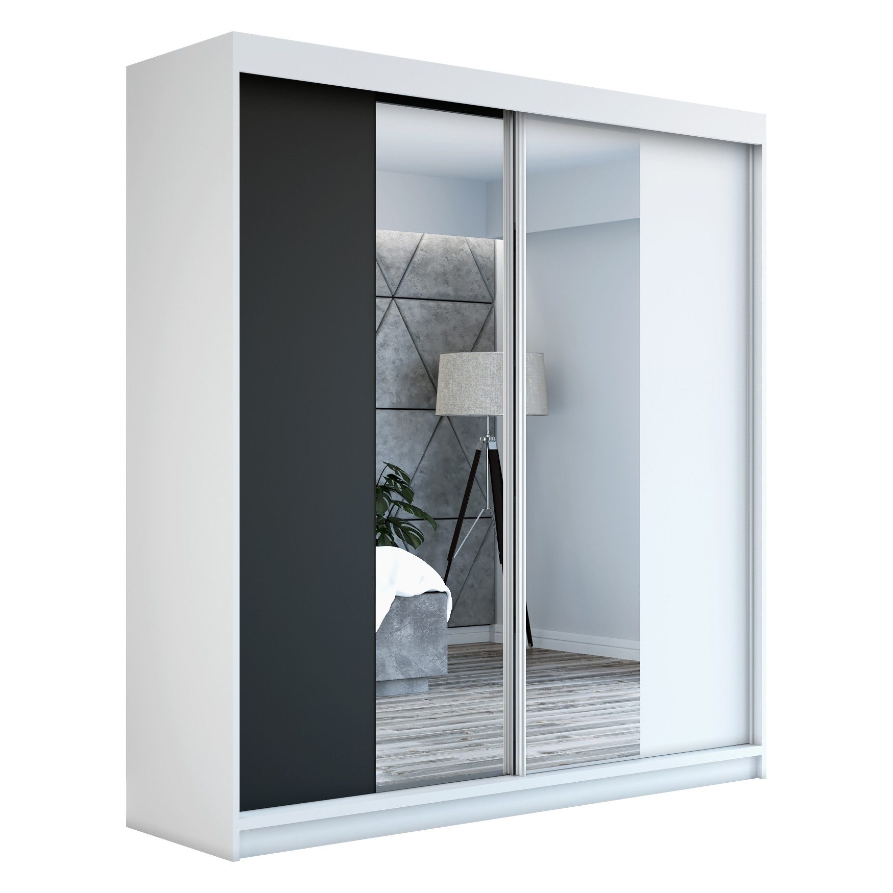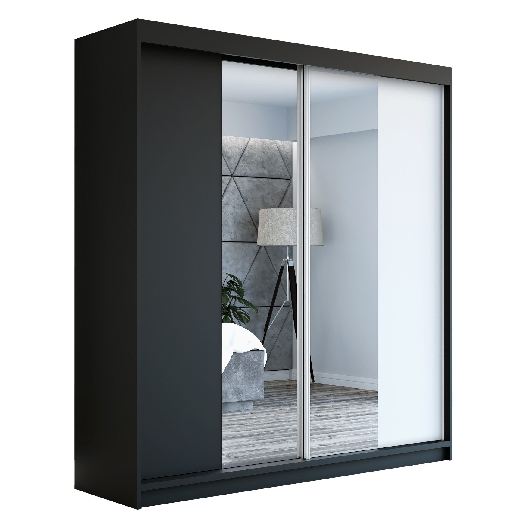 Der moderne 2-türige Kleiderschrank mit zwei Spiegeln ist die ideale Lösung für jedes Zuhause, das elegantes Design mit praktischer Funktionalität kombiniert. Der Schrank ist in drei verschiedenen Größen erhältlich 160 cm, sodass Sie das Modell auswählen können, das perfekt in Ihr Zimmer passt. Mit einer praktischen Kleiderstange und sechs Regalen bietet der Schrank ausreichend Platz für Ihre Kleidung und Accessoires. Die beiden Spiegel sorgen für praktische und stilvolle Ergänzungen, die den Raum optisch vergrößern.