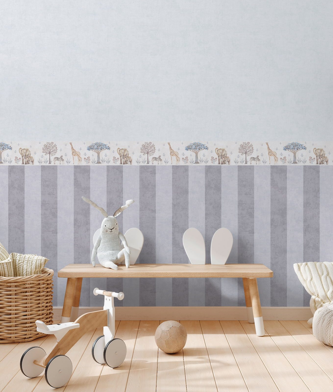 Mit dieser Bordüre aus der Kollektion Lilly + Luis von AS Creation schaffst du eine lebendige und fröhliche Umgebung für dein Kind, die einfach nur gute Laune bereitet! Das kindgerechte Motiv ist perfekt geeignet zum Spielen und Entspannen und sorgt so für eine Atmosphäre, die zum Wohlfühlen einlädt. Die Bordüre 77177-1 zeigt ein Motiv mit verschiedenen Tieren aus der Savanne im Vintage-Stil in Creme- und Grautönen. Die Bordüre ist nicht selbstkelbend, kann aber dank des Vliesträgers mit Hilfe der Wandklebetechnik ganz leicht angebracht werden. Darüber hinaus ist diese Tapetenbordüre frei von PVC und Weichmachern, so dass sie unbedenklich für das Kinderzimmer ist. Entdecken auch die Впередen Tapeten und Bordüren der Kollektion Lilly + Luis in unserem Shop.