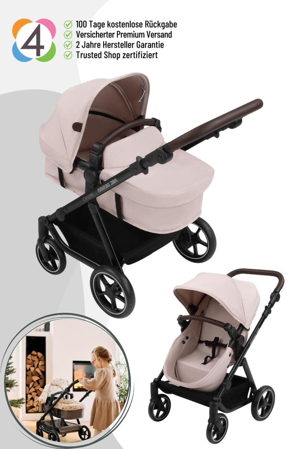 Ausstattung | Korb Großes Verdeck robustes Gestell abnehmbare Räder Weißwand Räder schwenkbare Vorderräder höhenverstellbarer Schieber Zum Sportwagen umbaubar Sitzeinheit umsetzbar 5-Punkt Gurt verstellbare Rückenlehne |