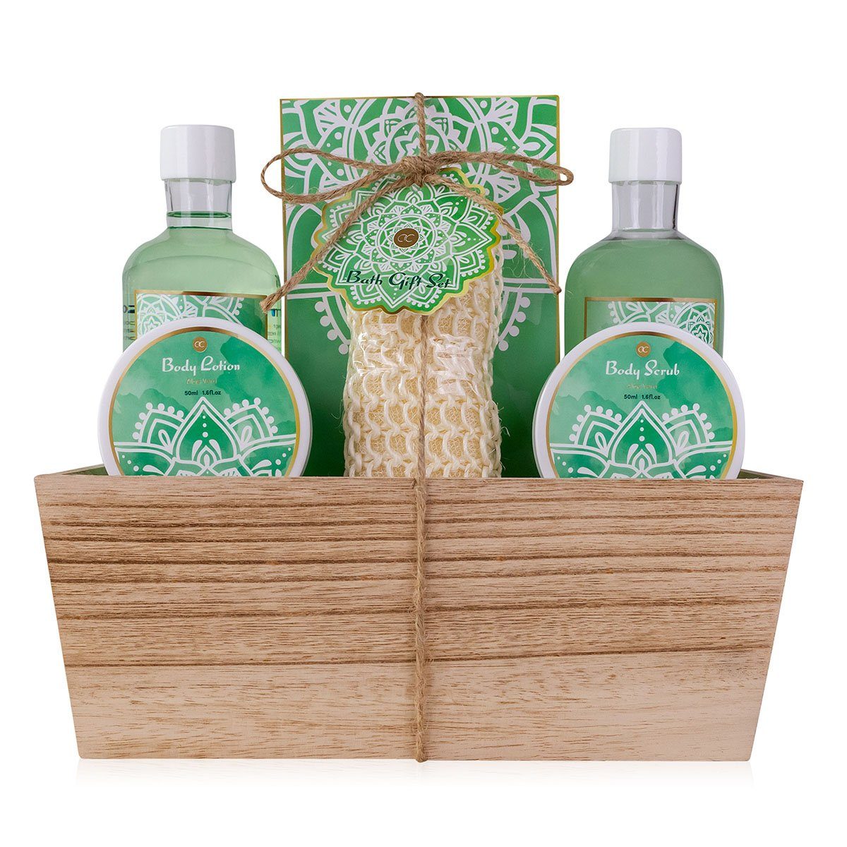 Bade- & Verwöhn-Set im wohltuenden und natürlichen Aloe Vera - Duft - angenehmer Duft, praktischer Inhalt & toll verpackt in einem Holzkorb – einfach genial!