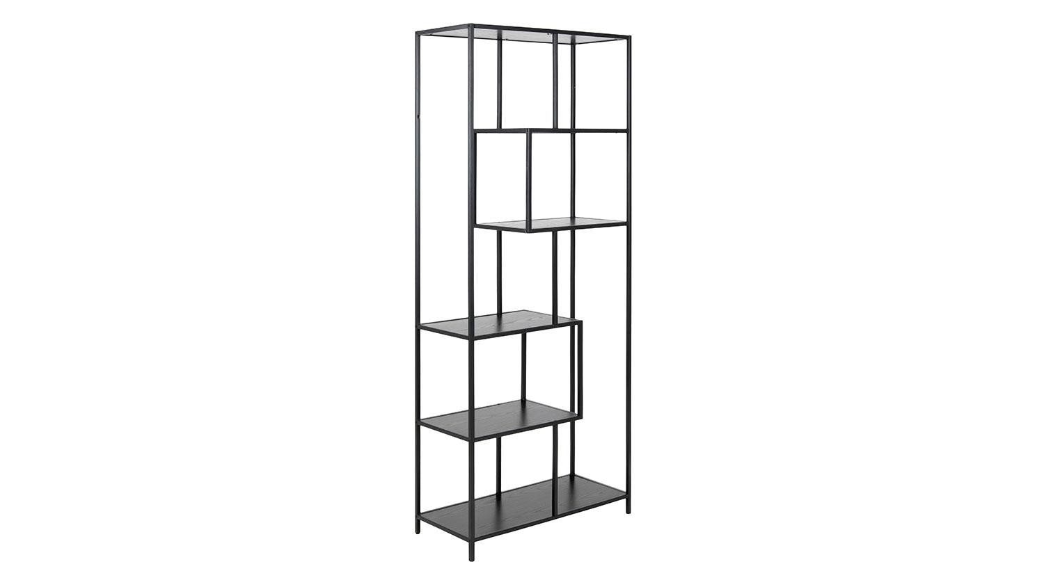Die asymmetrische Anordnung der 6 Regalböden macht das Bücherregal SEAFORD zu einem attraktiven Möbelstück für moderne Wohneinrichtungen. Das große Regal hat eine Breite von 77 cm und bietet ausreichend Platz für Bücher, Magazine, Ordner und Dekoration. In der schwarzen Ausführung, mit schwarzen Esche-Melamin Böden und seinem schlanken Metallgestell verleiht es dem Raum eine industriellen Charakter - ob im Schlaf-, Wohnzimmer oder Küche.