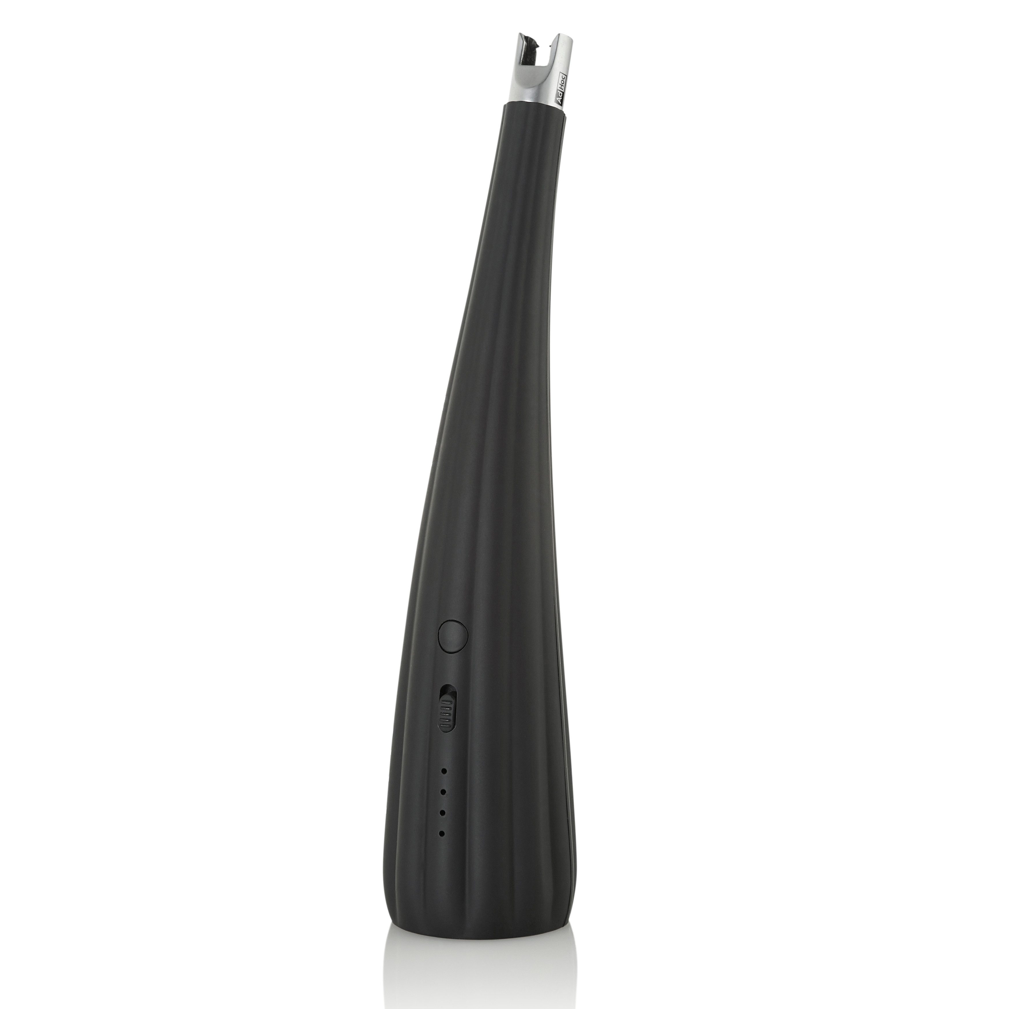 Wenn zwei gegensätzlich geladene Elektroden aneinander gebracht werden, entsteht ein Lichtbogen und siehe da, Kerze & Co. sind schnell entflammt. Doch nicht nur das: Das von Gabriele Kaltenbach designte Accessoire beschreibt einen leichten Bogen, der dem aufrecht stehenden Feuerzeug eine skulpturale Form verleiht.
