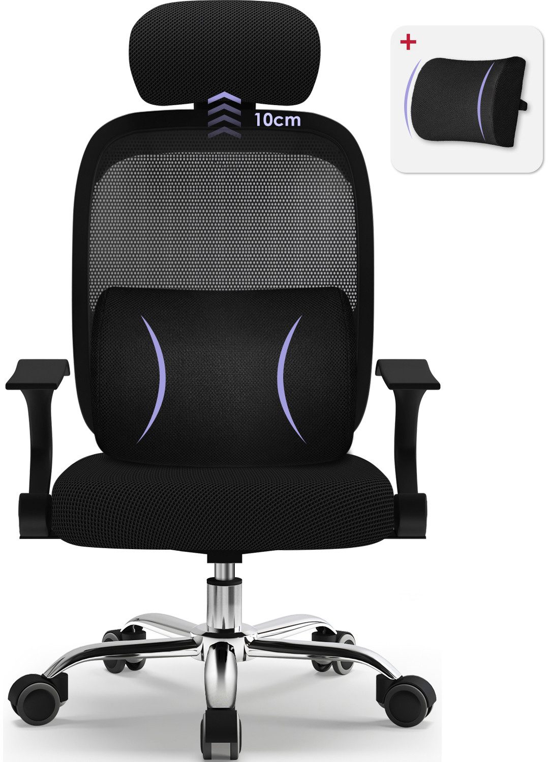 Der Bürostuhl Adormii ist mit einer höhenverstellbaren S-förmigen Rückenlehne, einer breiteren Kopfstütze und einem Kissen ausgestattet. Mehr Komfort!