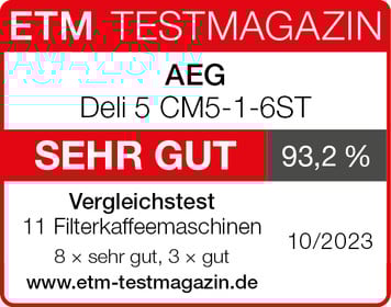 Die AEG Deli 5 CM5-1-6ST erzielt im Vergleichstest des „ETM TESTMAGAZINS“ mit zehn weiteren Filterkaffeemaschinen das Gesamtergebnis „sehr gut (93,2 %)“. Die „sehr gute“ Funktionalität überzeugt u. a. mit einer „sehr guten“ Temperatur nach dem Brühvorgang. Das Gerät ist sehr leicht zu handhaben. Außerdem punktet die „gute“ Verarbeitung. Insgesamt gehört das Modell zum mittleren Bereich des starken Testspektrums.