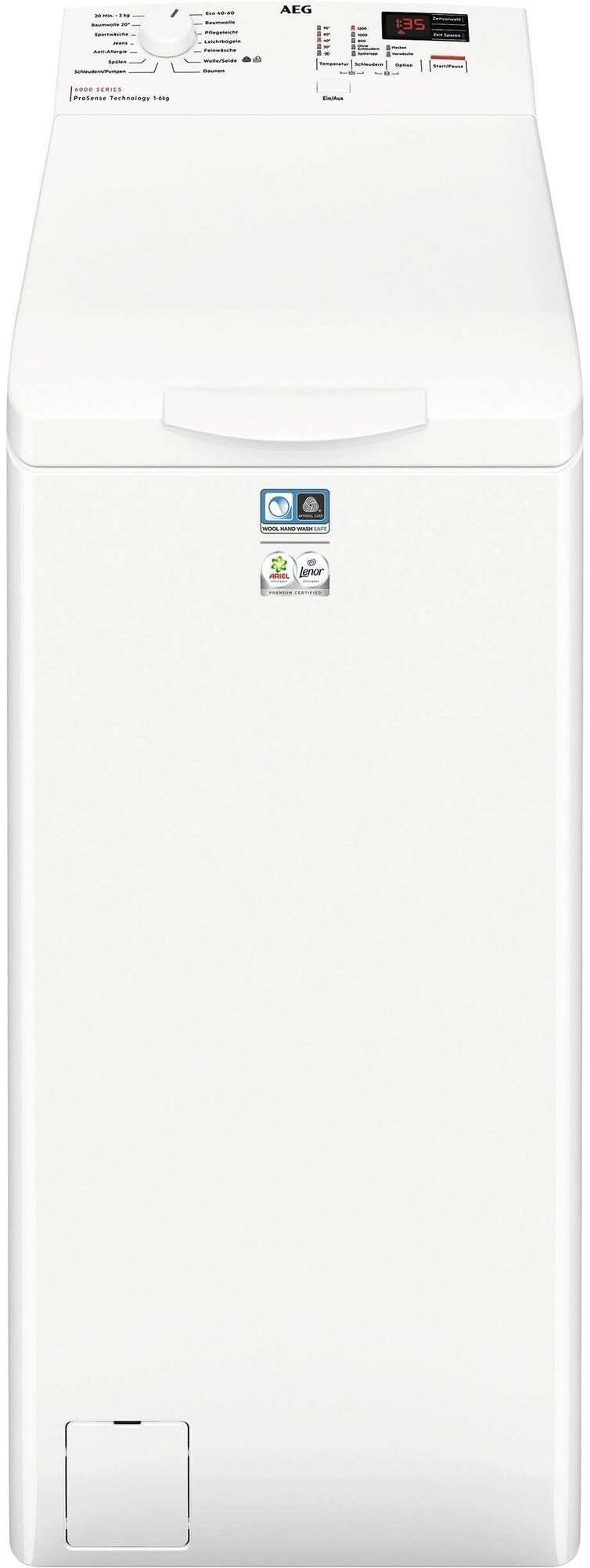 Die Toplader-Waschmaschine LTR6N40260 von AEG brilliert durch eine überzeugende Ausstattung. Ausgezeichnete Werte im Hinblick auf den Energieverbrauch liefert diese Toplader-Waschmaschine mit der Energieeffizienzklasse B (Skala: A bis G). Der Toplader eignet sich vor allem für Haushalte mit bis zu 3 Personen, da dieser 6 kg Fassungsvermögen hat. Der eingebaute Invertermotor gewährleistet eine leise und langlebige Arbeitsweise. Zusätzlich bietet die LTR6N40260 Toplader-Waschmaschine unter anderem diese Besonderheiten: Nachlegefunktion und Startzeitvorwahl. Über Sensoren erkennt die Mengenautomatik, wie viel sich in der Trommel befindet und passt darauf hin automatisch die Wassermenge und den Energieverbrauch an. Wäschestücke, die vergessen wurden, können mit der praktischen Nachlegefunktion noch während des Programmablaufs hinzugegeben werden. Mit den Abmessungen von 39,7 cm x 90,3 cm x 59,9 cm (BxHxT) vereint die Toplader-Waschmaschine Form und Funktion auf attraktive Weise.