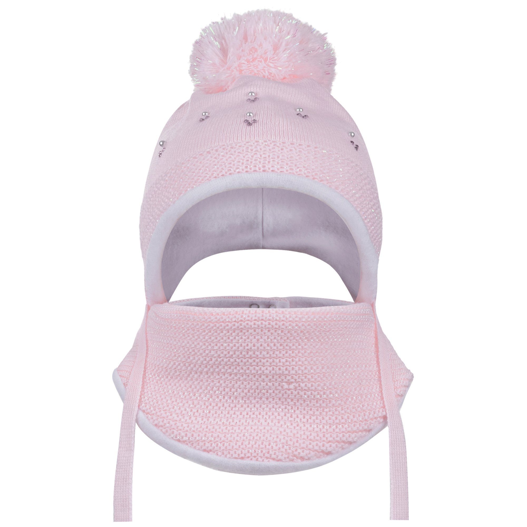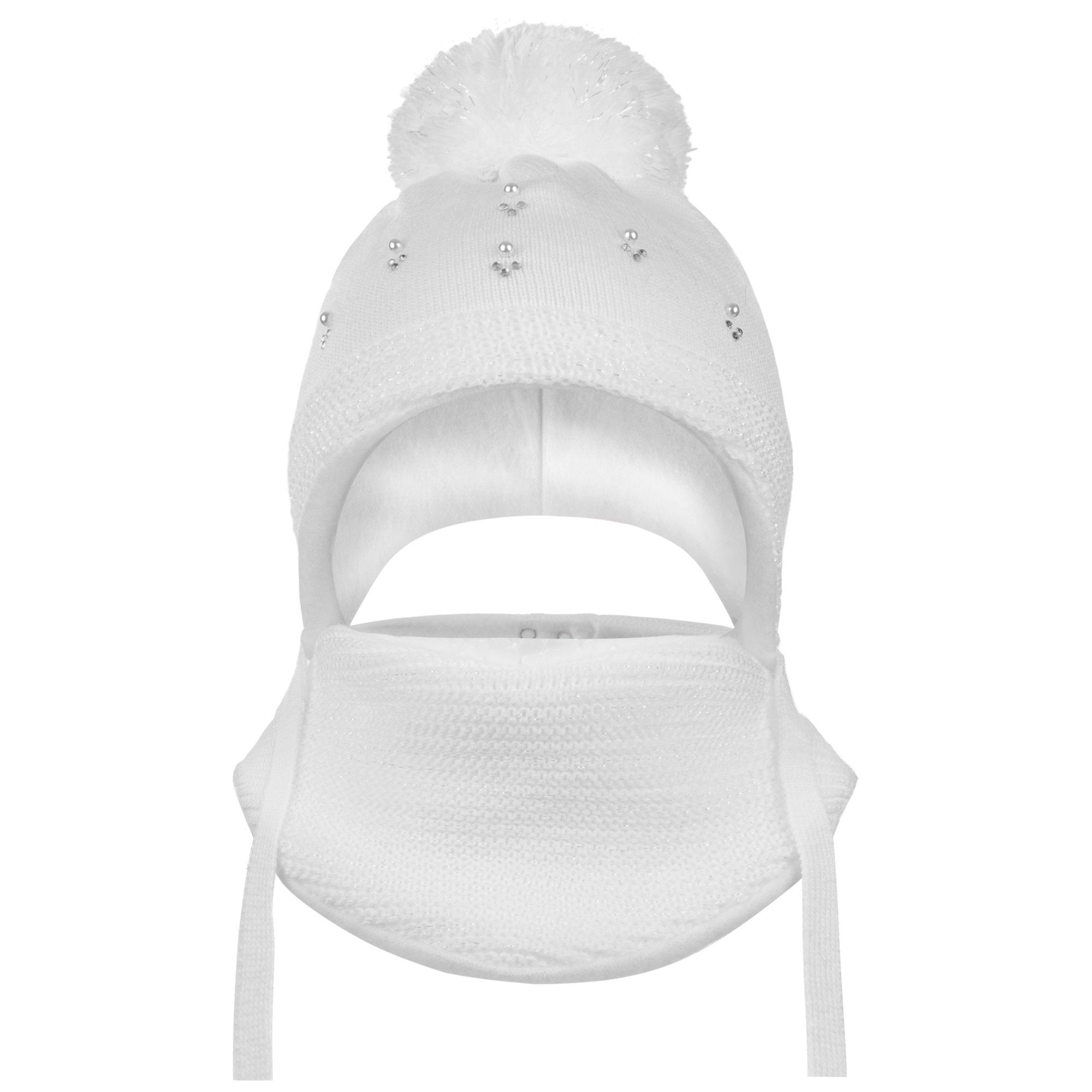 Schöne Strickmütze und ein dazu passendes Dreieckstuch. Die Mädchenmütze mit einem großen Bommel und das Dreiecktuch sind mit weicher Baumwolle gefüttert und sorgen an kalten Wintertagen für ein angenehmes Tragefühl. Die Bindemütze hält den Kopf und die Ohren, das Dreiecktuch den Hals Ihres Mädchens schön war. Das Tuch ist hinten mit einen Drucknopf ausgestattet. Das Set ist mit einem zarten Glitzerfaden durchzogen. Kleine Strasssteine sowie das schöne Strickmuster runden das Design ab. Das Winterset ist ein idealer Begleiter durch die kalte Jahreszeit.