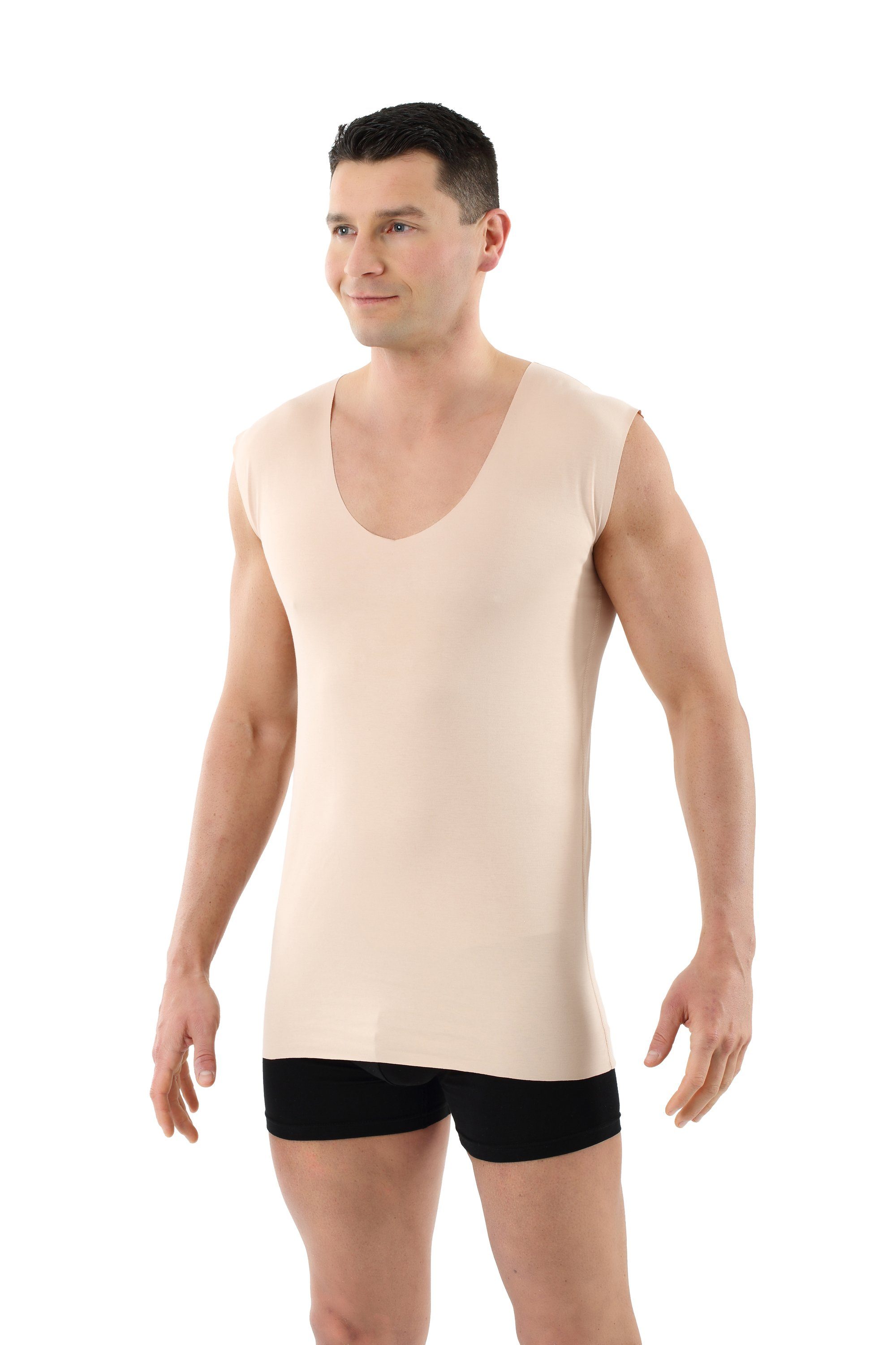 • Trägt auch unter sehr feinen Oberhemden nicht auf – ohne Nähte an den Enden: Clean Cut Lasercut, die innovative Technologie für Ausschnitt, Ärmelende und das untere Ende • Unsichtbar dank Naturton • Körpernaher Schnitt für einen perfekten Sitz • Extra lang - kein Herausrutschen aus der Hose • Spezieller Deep-V Ausschnitt - tief genug, dass 2-3 Hemdknöpfe offen bleiben dürfen • Ohne Arm - dennoch genügend Stoff unter den Achseln für eine ideale Feuchtigkeitsaufnahme zum Vermeiden von Schweißlecken • Samtweiche atmungsaktive Stretch-Baumwolle für einen perfekten Sitz • Hoher Tragekomfort, sehr angenehm auf der Haut und kaum spürbar • Ohne störendes Nackenetikettt