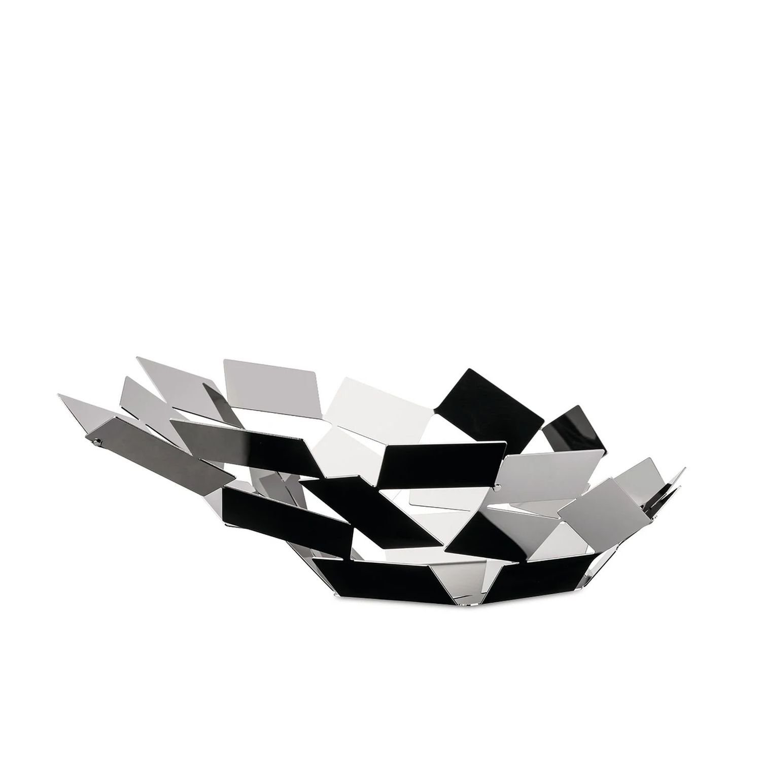 Die einzigartige Form der Obstschale La Stanza dello Scirocco soll an vom Wind durcheinandergewirbelte Papierstücke erinnern. Inspiriert wurde der Designer Mario Trimarchi von der stillen und nachdenklichen Atmosphäre der großen Landhäuser Siziliens, in die er sich vor dem gefürchteten Scirocco-Wind geflüchtet hatte. Die scheinbar fragile Konstruktion aus silbern glänzenden Edelstahlplatten ist 41,6 cm lang und 15 cm hoch. In ihr finden nicht nur Obst, sondern auch Gemüse und kleine Wohnaccessoires einen dekorativen Platz.