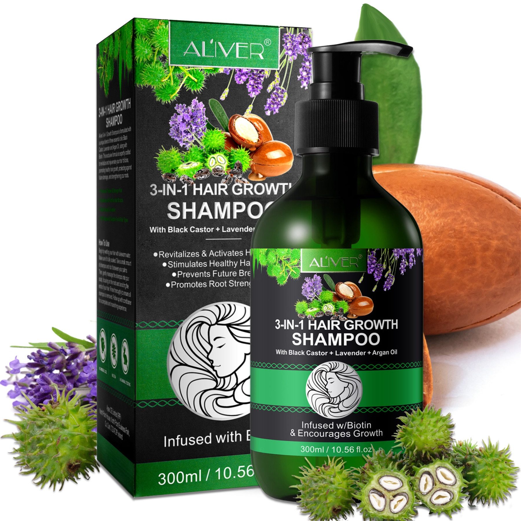 Aliver 3-in-1-Haarwachstumsshampoo enthält eine einzigartige Mischung aus drei ätherischen Ölen: jamaikanisches schwarzes Rizinusöl, Lavendel und Arganöl und ist außerdem mit Biotin angereichert. Diese exklusive Formel wurde speziell für diejenigen entwickelt, die sich glattes, kräftiges und gesundes Haar wünschen.