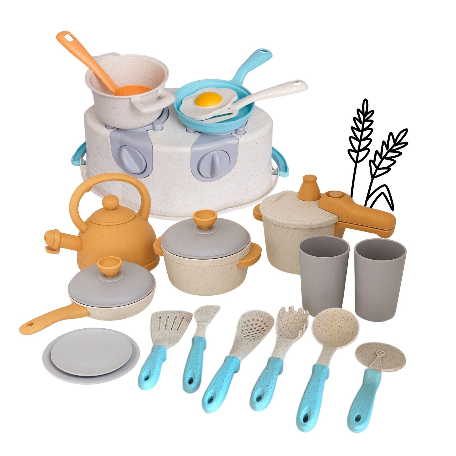Unser umfangreiches Koch- und Geschirrset stattet kleine Meisterköche mit allem aus, was sie für spannende Küchenspiele benötigen! Die 22-teilige Spielküchen-Ausstattung kombiniert einen praktischen Spielherd mit drehbaren Knöpfen, vielseitiges Kochgeschirr und ein komplettes Serviergeschirr. Gefertigt aus einem speziellen Kunststoff-Weizenstroh-Mix mit reduziertem Erdöl-Anteil, bietet dieses Kinderküchen Zubehör eine durchdachte Materialzusammensetzung. Von der Zubereitung bis zum Servieren - kleine Köche können jeden Schritt authentisch nachspielen.