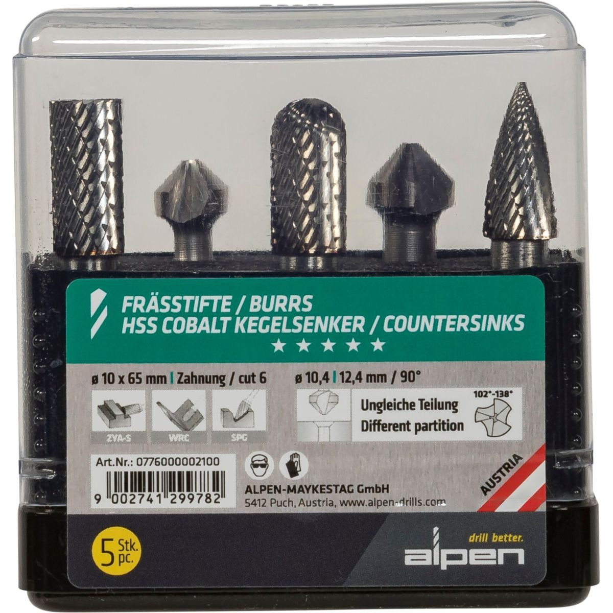 Lieferumfang | Alpen-Maykestag Kombi-Set 5-tlg.HM Fräs- stifte + 2 UGT Senker + Zubehör laut Herstellerangabe |