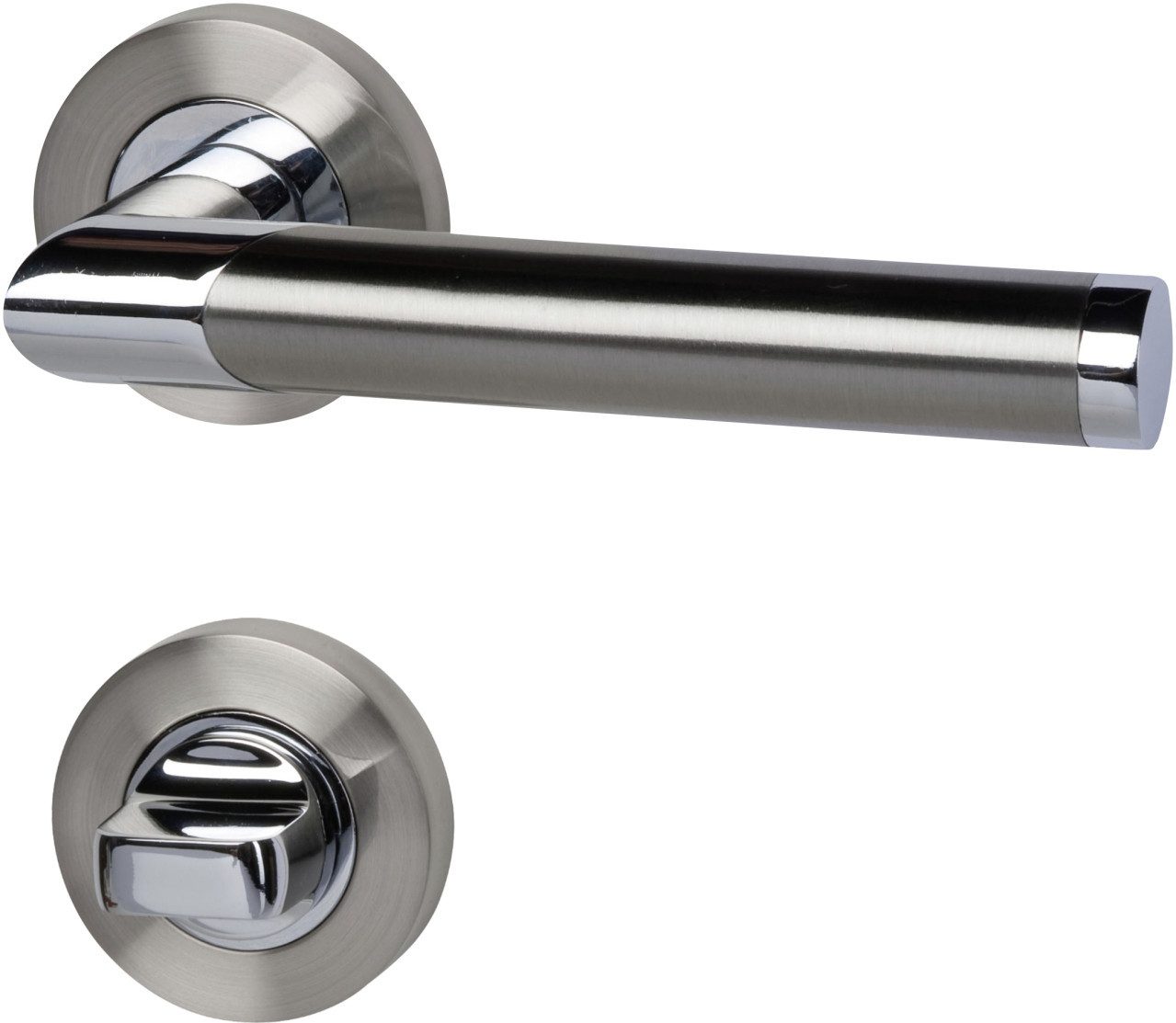 Lochung: WC | Варіанти: Drücker/Drücker | Form Schild: rund | DIN-Richtung: rechts/links | Durchmesser Rosette: Ø 5,2 cm | Stärke Rosette: 10,0 mm | Ausladung Drücker: 6,2 cm | Довжина Drücker: 13,5 cm | Durchmesser Drücker: Ø 2,0 cm | Maße Vierkantstift: 8,0 mm | Verschraubung: verdeckt | Geeignet für Türstärken von-bis: 38 - 42 mm | Material: Zamak | Oberfläche: satiniert | Farbe: Edelstahlfarbig | Lieferumfang: 1 Drückerpaar, 1 WC Rosetten Paar & Riegel, inkl. Montagematerial |