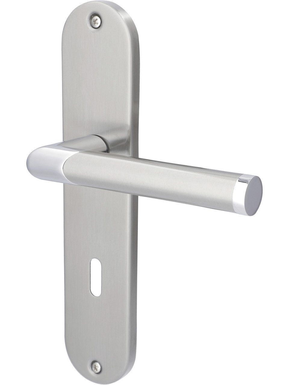 Lochung: Buntbart BB | Варіанти: Drücker/Drücker | Form Schild: abgerundet | DIN-Richtung: rechts/links | Lochabstand: 72 mm | Höhe Schild: 24,0 cm | Breite Schild: 5,0 cm | Stärke Schild: 9,0 mm | Ausladung Drücker: 6,2 cm | Довжина Drücker: 13,5 cm | Durchmesser Drücker: Ø 1,8 cm | Maße Vierkantstift: 8,0 mm | Verschraubung: sichtbar | Geeignet für Türstärken von-bis: 37 - 42 mm | Material: Messing | Oberfläche: verchromt | Farbe: edelstahlfarbig | Lieferumfang: Komplettgarnitur für beide Seiten der Tür, Befestigungsmaterial |