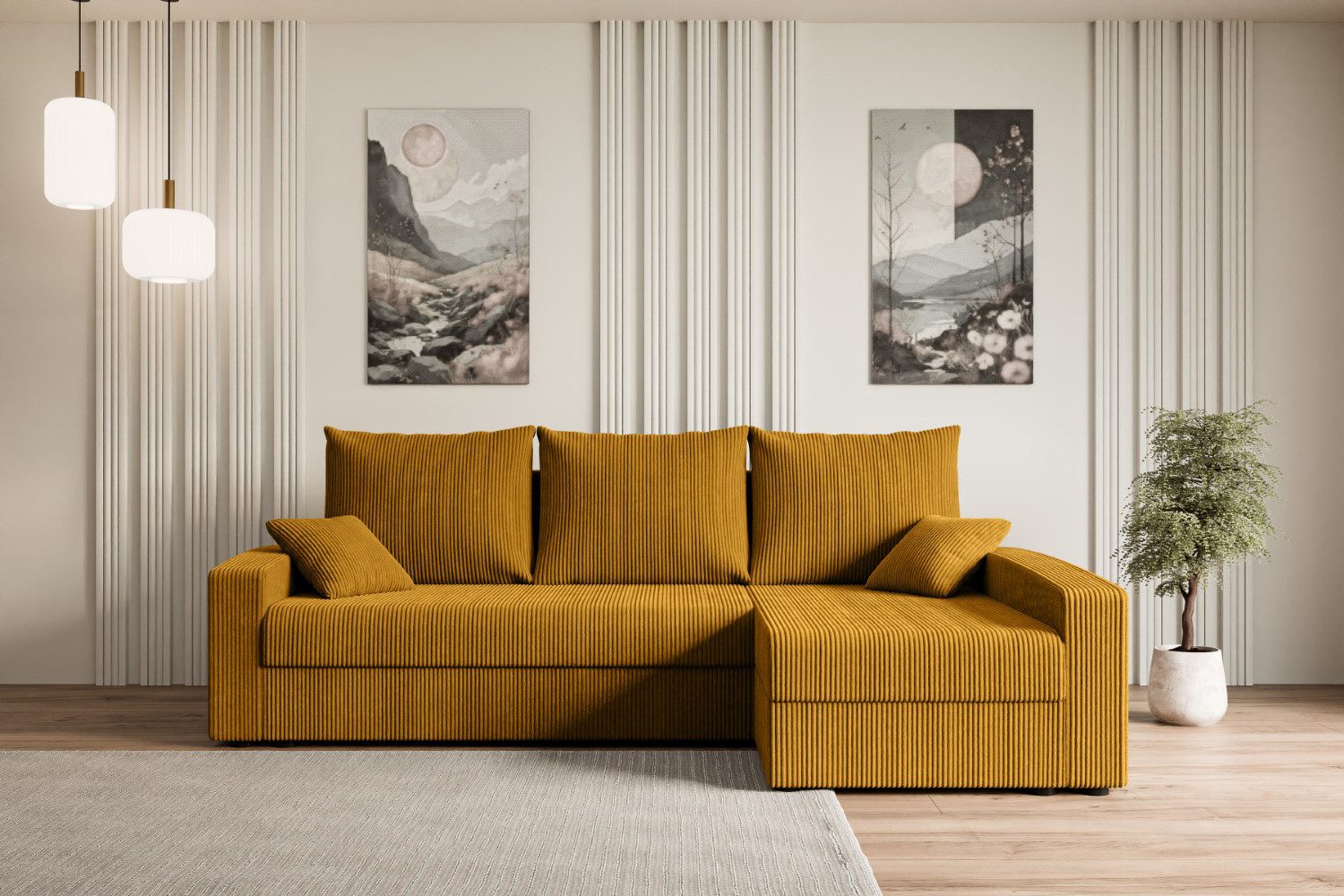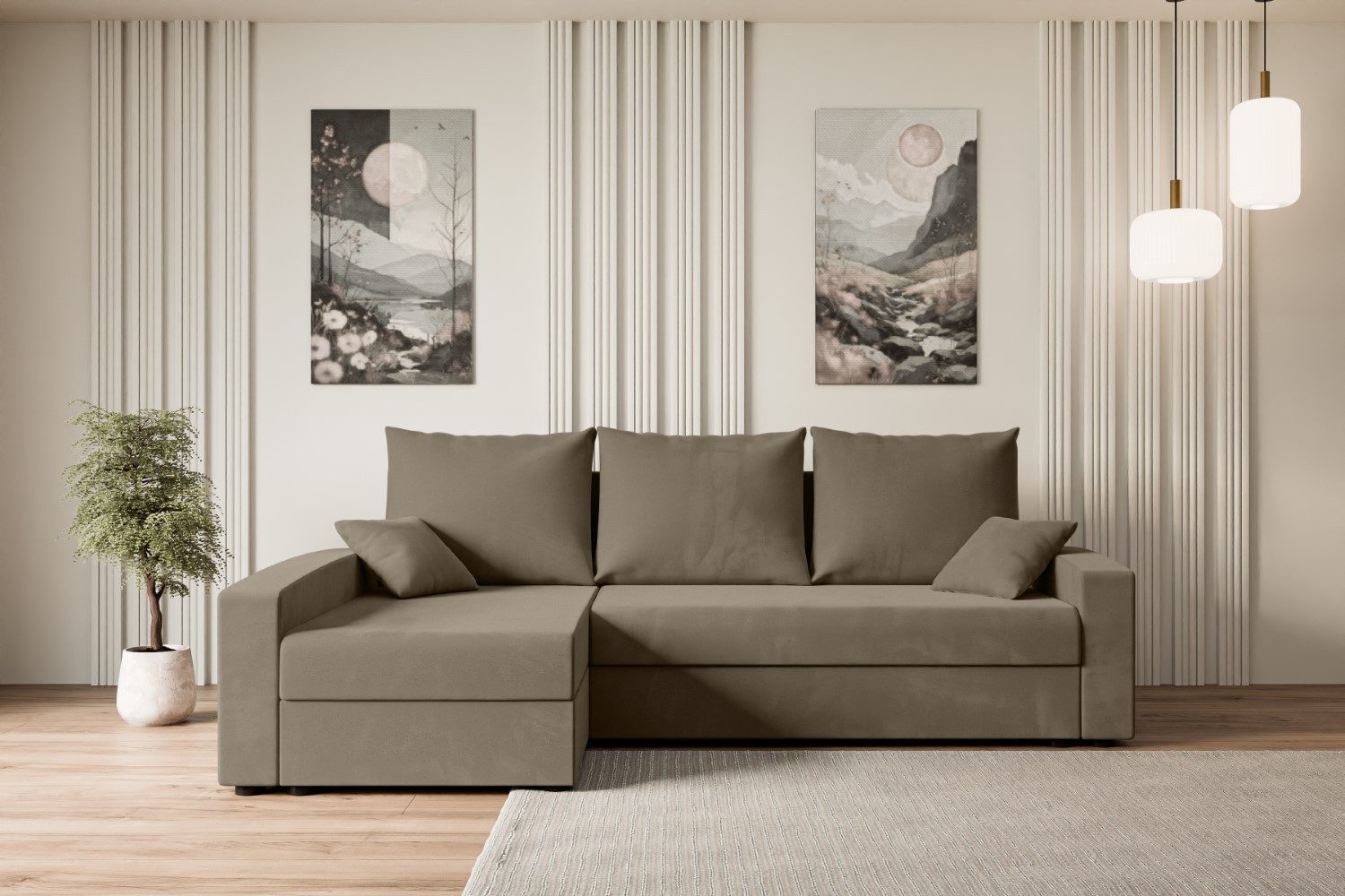 Das moderne Polstersofa mit Schlaffunktion ist ein universelles Möbelstück. Das links oder rechts angeordnete Schlafsofa in L-Form bietet einen hohen Sitz-, Liege- und Schlafkomfort in jeder Situation.