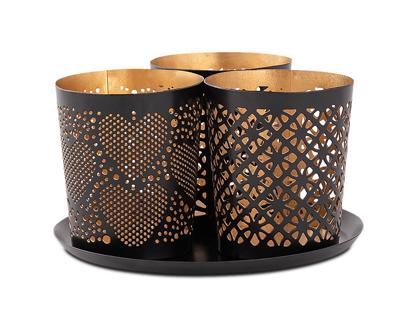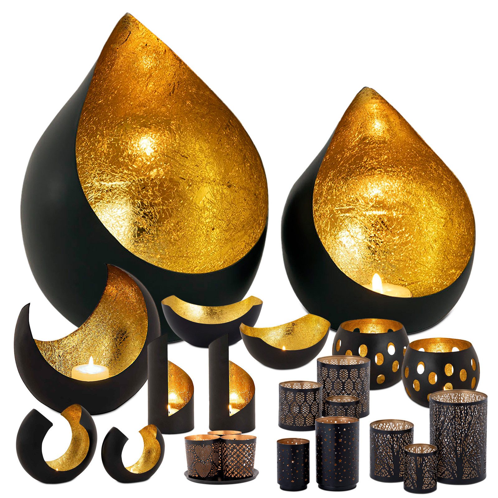 Die kunstvoll gestalteten Teelichthalter sorgen für goldene Lichteffekte und eine warme, behagliche Atmosphäre in jedem Raum. Die Kerzenhalter werden aus Metallblech hergestellt von außen schwarz matt lackiert. Innen sind die Teelichthalter mit einer Goldfolie ausgekleidet. Die harmonischen Kerzenständer werden in Handarbeit in verschiedenen Formen und Motiven hergestellt. Jedes Stück wird in liebevoller Handarbeit hergestellt und ist somit ein Unikat! Всі Kerzenhalter eigenen sich hervorragend als Dekoration für jeden Raum oder Terrasse, aber auch als originelles Geburtstags- oder Weihnachtsgeschenk.
