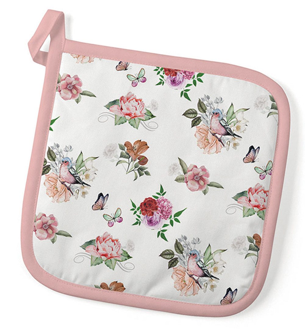 Ein romantischer Topflappen, der mit seinem bezaubernden Rosenmotiv und filigranen Details Eleganz und Leichtigkeit in Ihre Küche zaubert. Der Topflappen präsentiert einen weißen Hintergrund, der mit liebevoll gestalteten Rosenbündeln in verschiedenen Rosa-Tönen verziert ist. Ergänzt wird das Design durch zarte Vögel und Schmetterlinge, die dem Gesamtbild eine natürliche und verträumte Note verleihen.