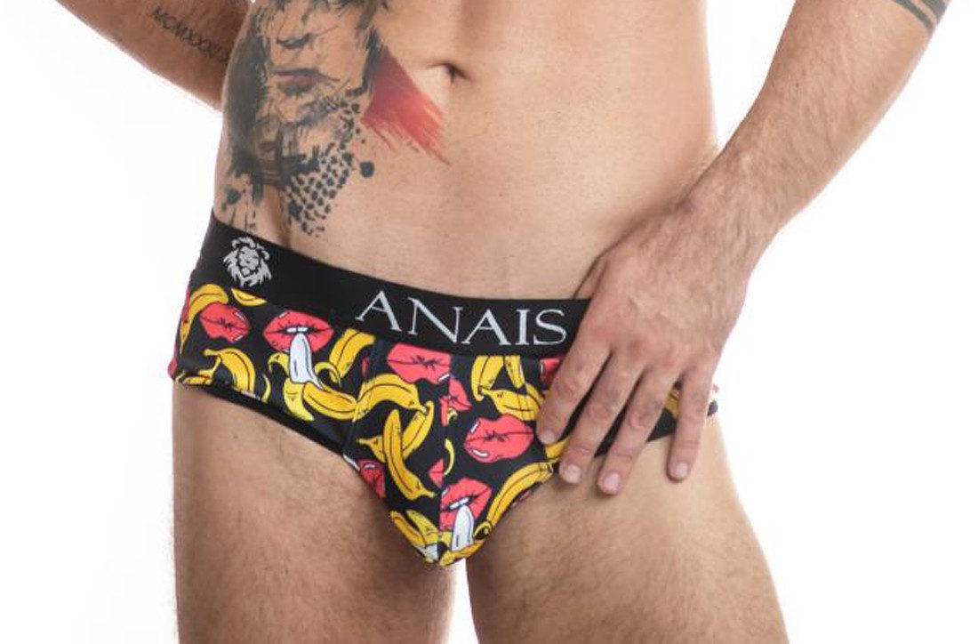 Herren Dessous Jock Strap, gefertigt aus glattem, blickdichtem Stoff, mit Bananen Kussmund Print und breitem Gummibund. Der Artikel ist in einer Box mit Bild verpackt.