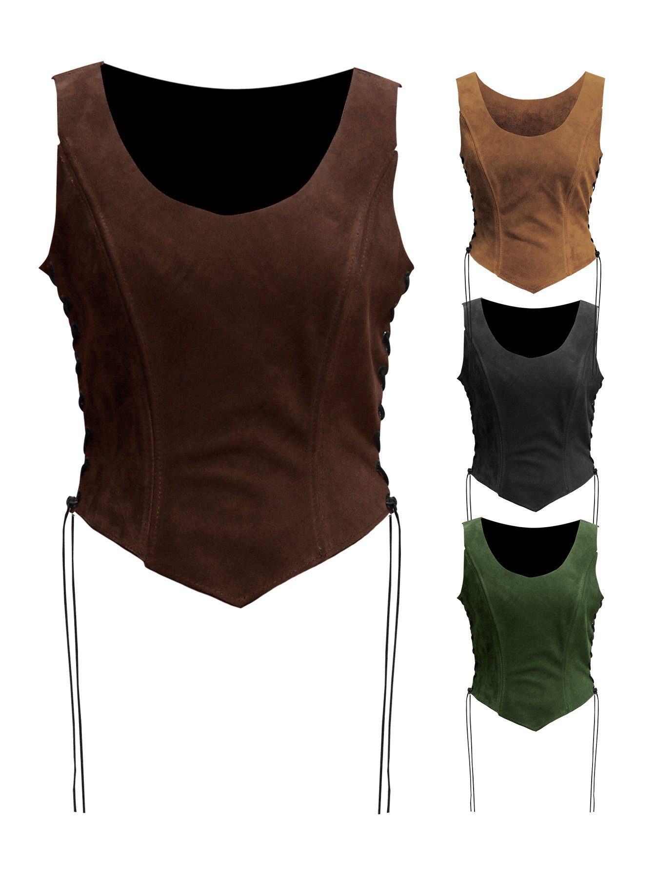 Ob Schankmaid oder Amazone, Wirtsfrau oder Kriegerin: Dieses Mieder aus Wildleder ist sehr vielseitig als Rüstung oder Gewand einsetzbar. Das Schankmaid Mieder aus Wildleder ist aus hochwertigem, reißfestem Veloursleder von Hand gefertigt und mit stabilen Metallösen an den seitlichen Schnürungen versehen. Letztere ermöglichen die individuelle Anpassung an die eigene Figur und sorgen so für den sicheren und bequemen Sitz dieses tollen Basis-Gewands.