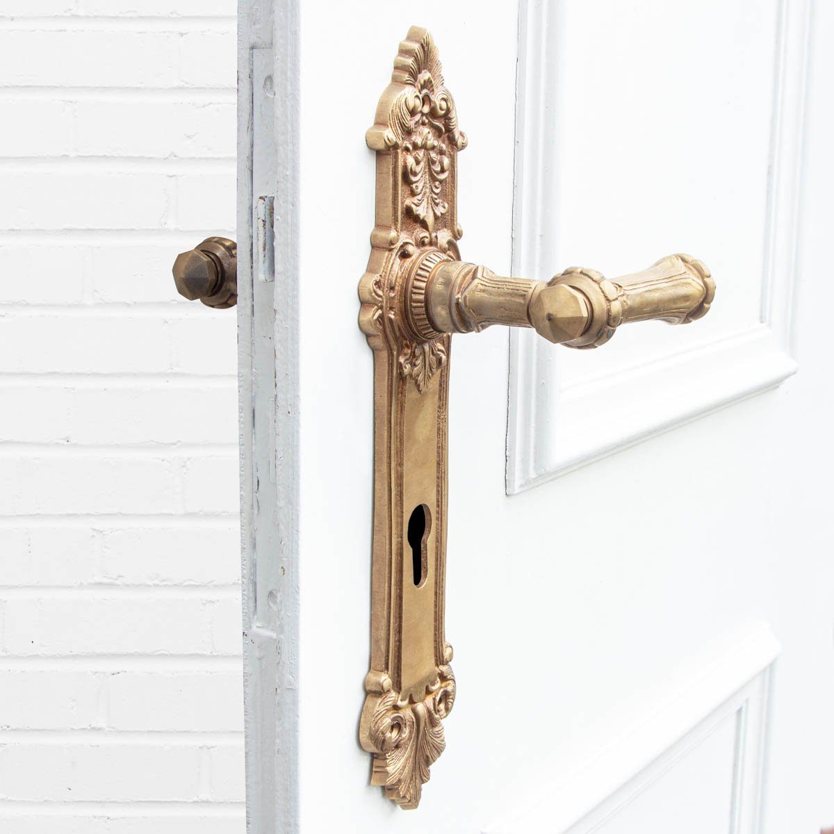 Drückergarnitur für die Haustür aus Messing, Türbeschläge bestehend aus 2 x Langschild, + 2 Türklinken aus Antik -Messing. Diese Türbeschläge für die Haustür, gehören in das wunderbare Меню für historisches Renovieren - sie schmücken Ihre historische Tür, die wieder im alten Glanz der damaligen Zeitepoche erscheinen soll.